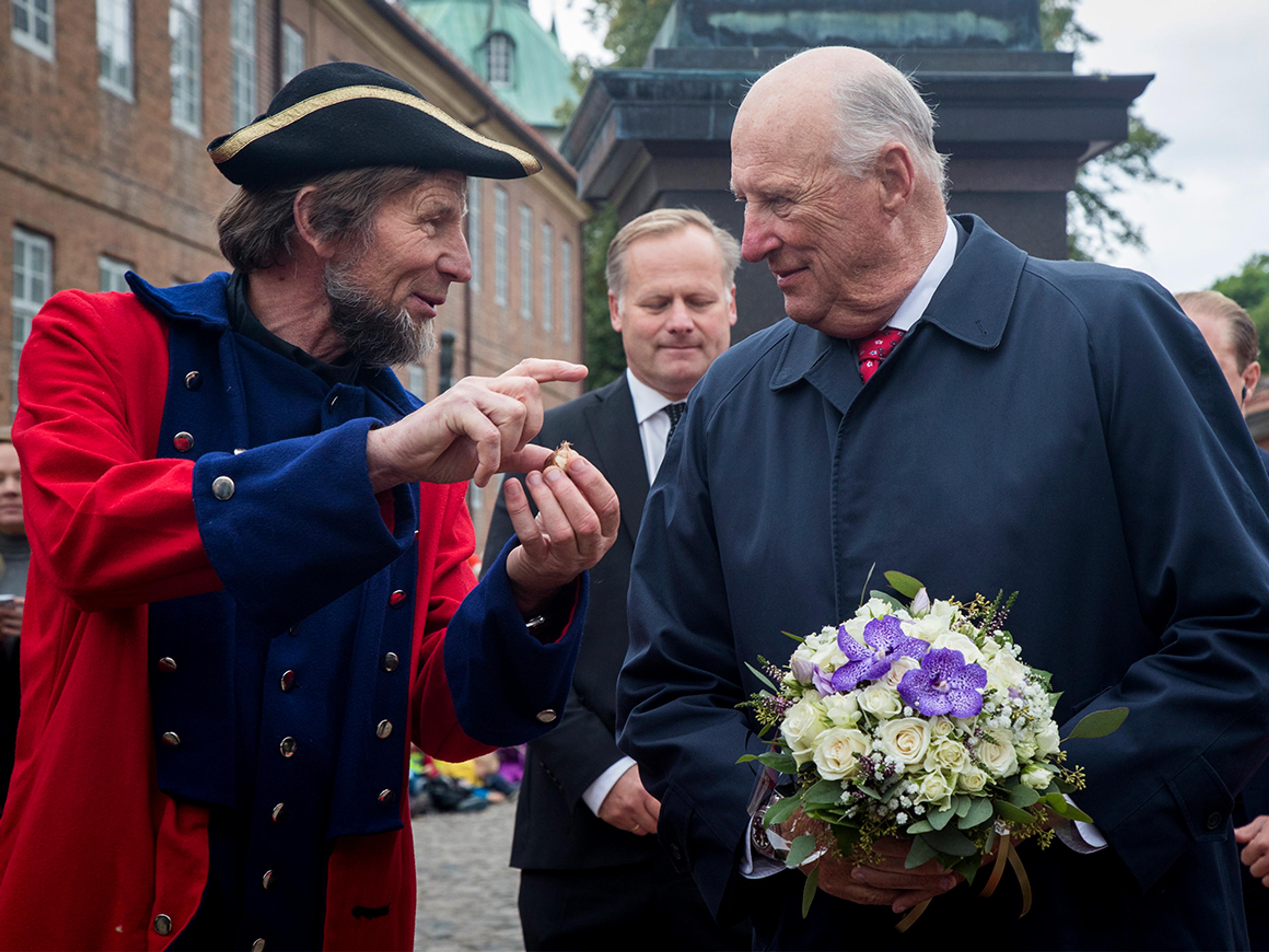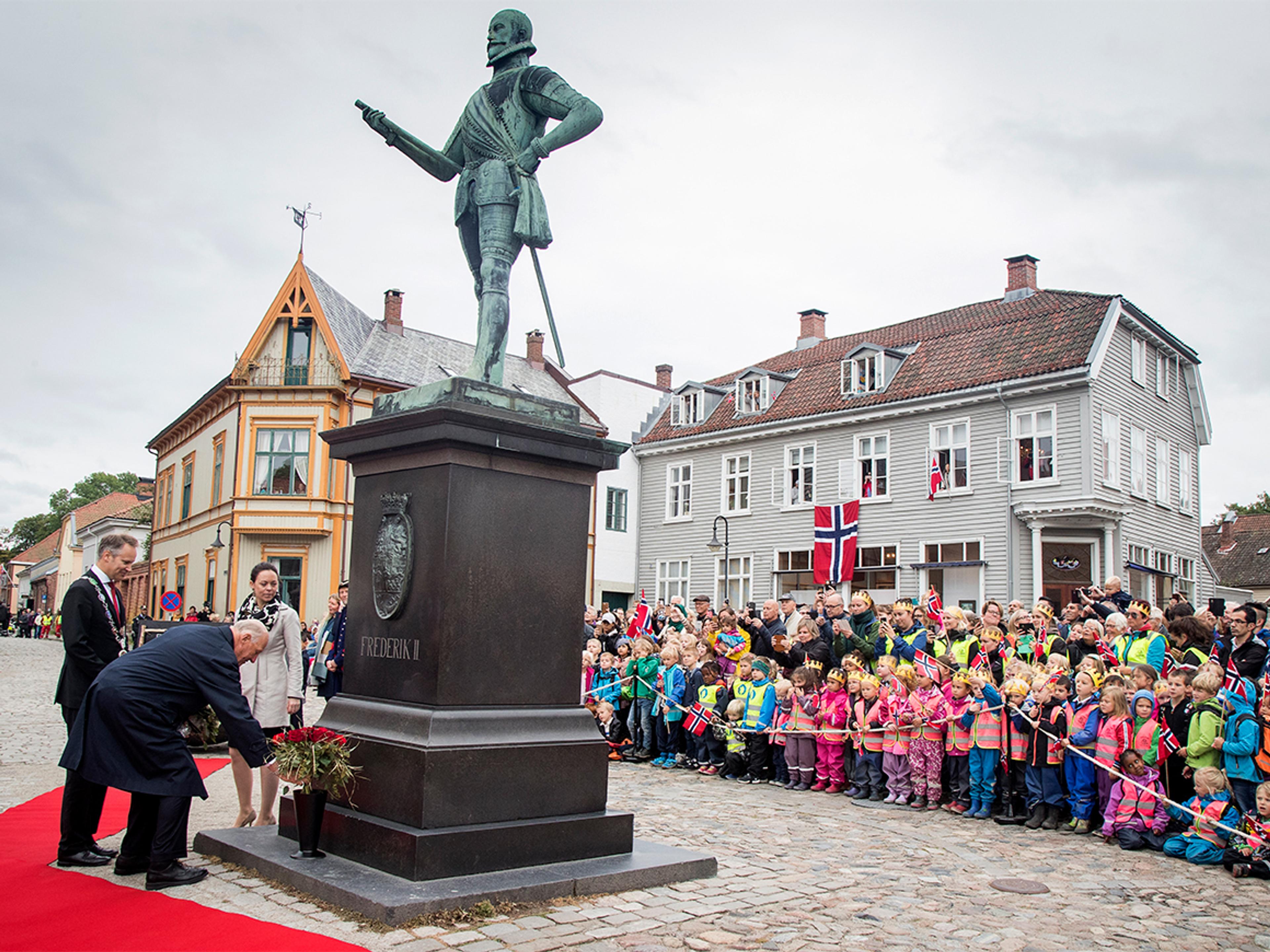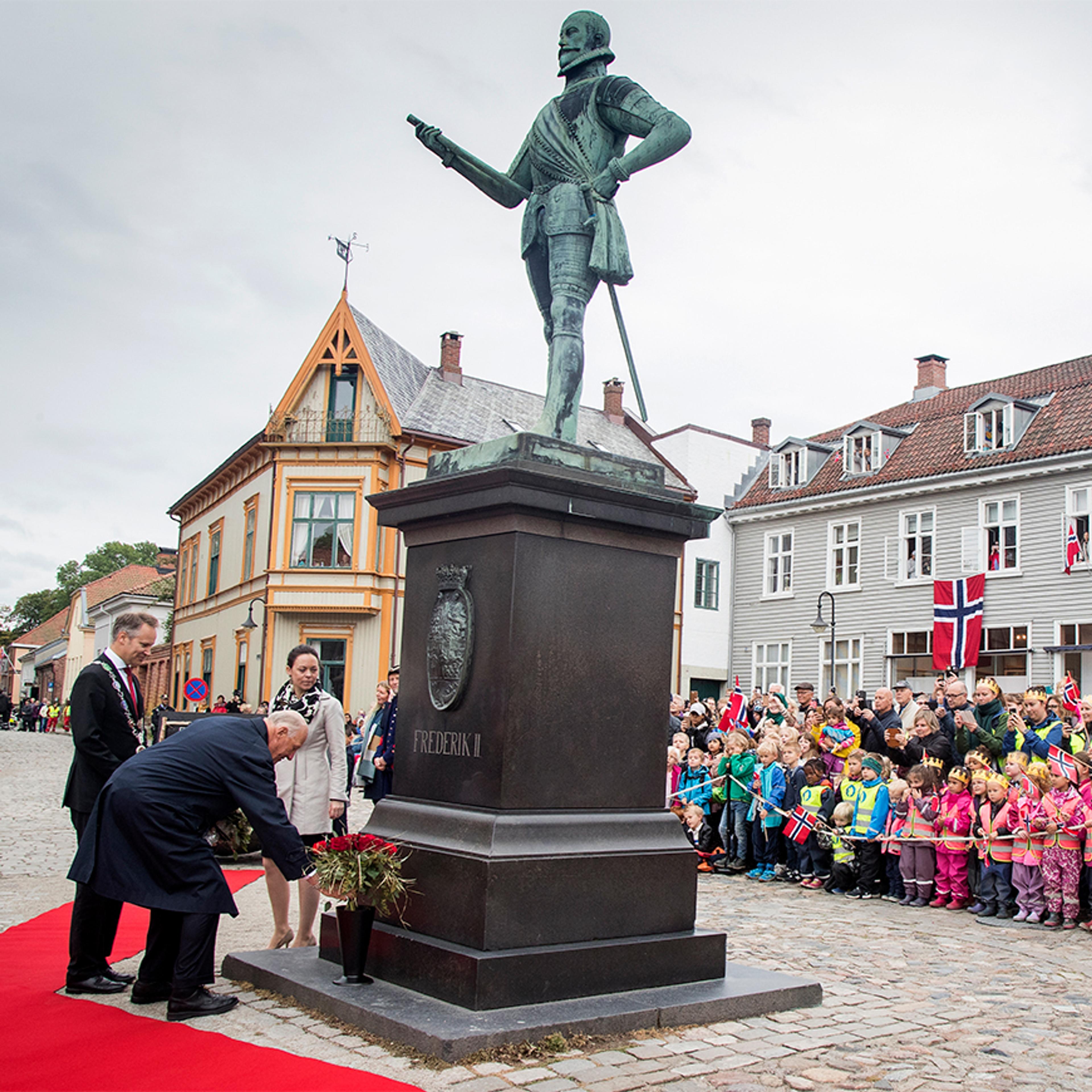 Kong Harald la ned blomster ved statuen av Kong Frederik II, byens grunnlegger, som står midt på torget. Statuen er laget av billedhuggeren Vilhelm Rasmussen og ble avduket for 100 år siden.