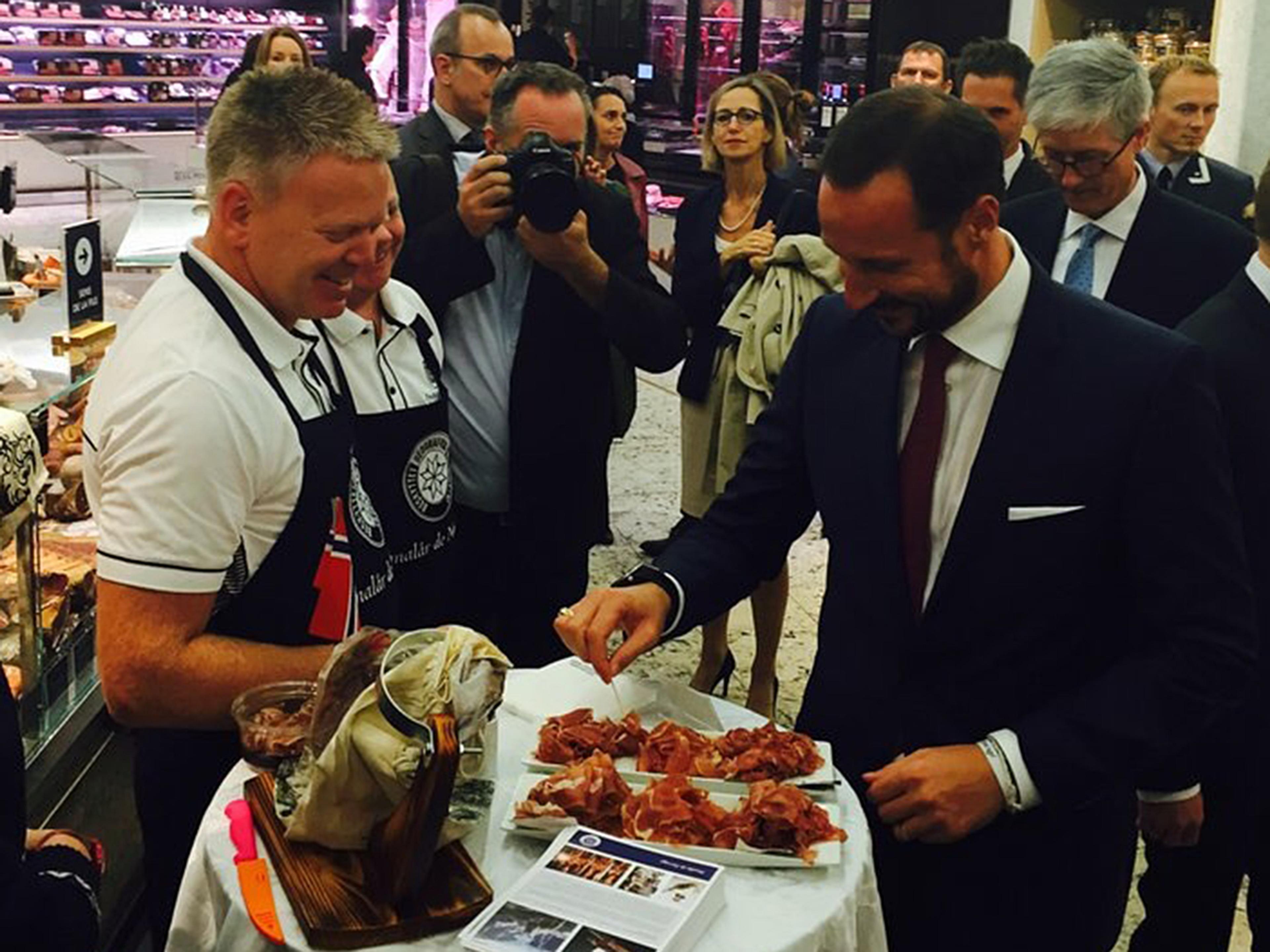 Hans Kongelige Høyhet Kronprinsen deltok i promoteringen av norske spesialiteter i ettermiddag. Norsk laks og fenalår sto på menyen på La Grande Epicerie.