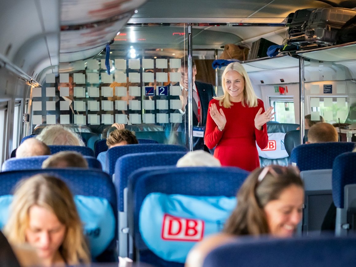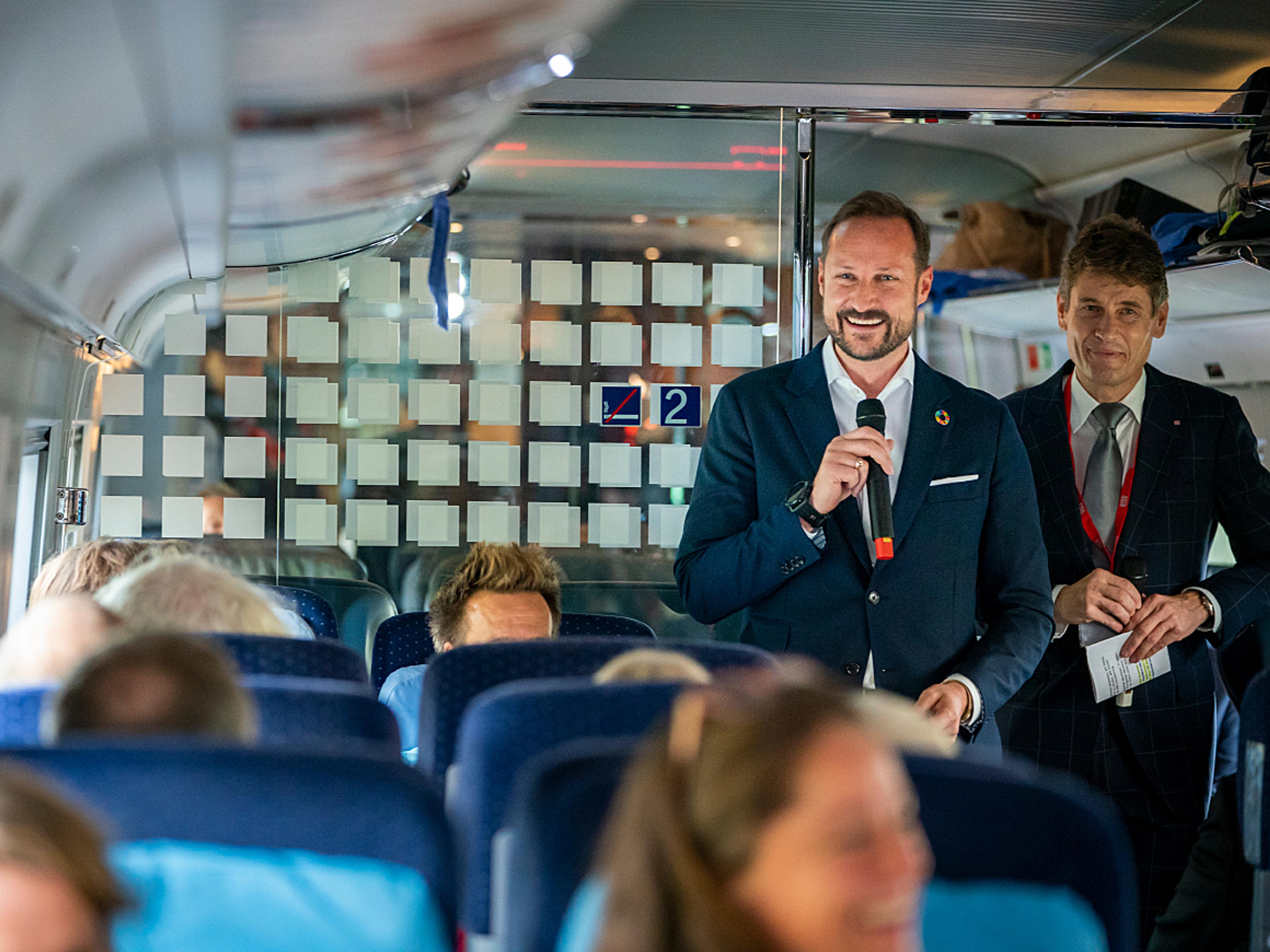 Kronprins Haakon ønsket alle velkommen ombord, og kunne fortelle om hvordan han under militærtjenesten, når muligheten bød seg på tokt med marinen, dykket ned i "Beatles" og "Salmer ved reisens slutt". I dag kunne Kronprinsen hilse på både Lars Saabye-Christensen og Erik Fosnes Hansen om bord på toget.