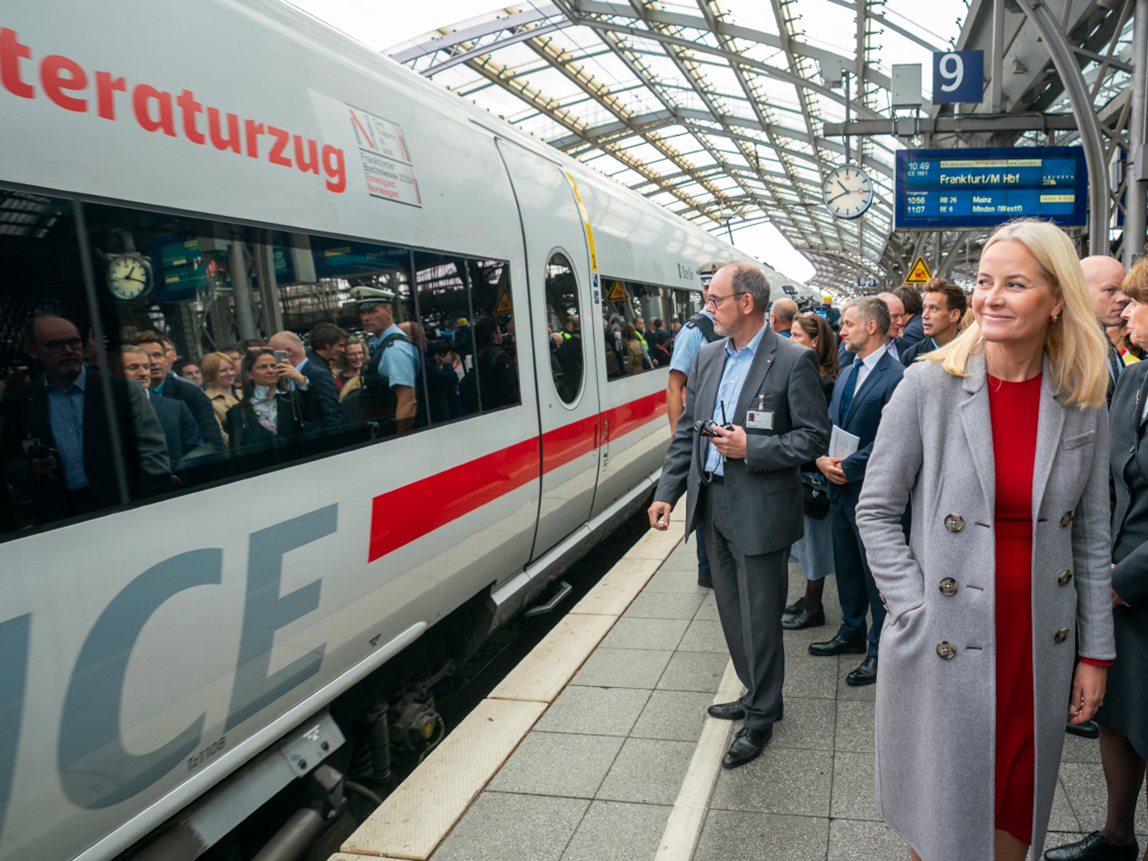 For første gang har Hennes Kongelige Høyhet Kronprinsessen tatt med seg Litteraturtoget til utlandet, og reisen går langs tyske jernbaneskinner. Mens toget i går var fylt opp med leselystne barn og unge, er det i dag de norske forfatterne som står i fokus. Fra stasjonen i Köln steg en rekke velkjente og en del litt mindre etablerte forfattere ombord i toget fra Deutsche Bahn, for anledningen omkledd som litteraturtog.