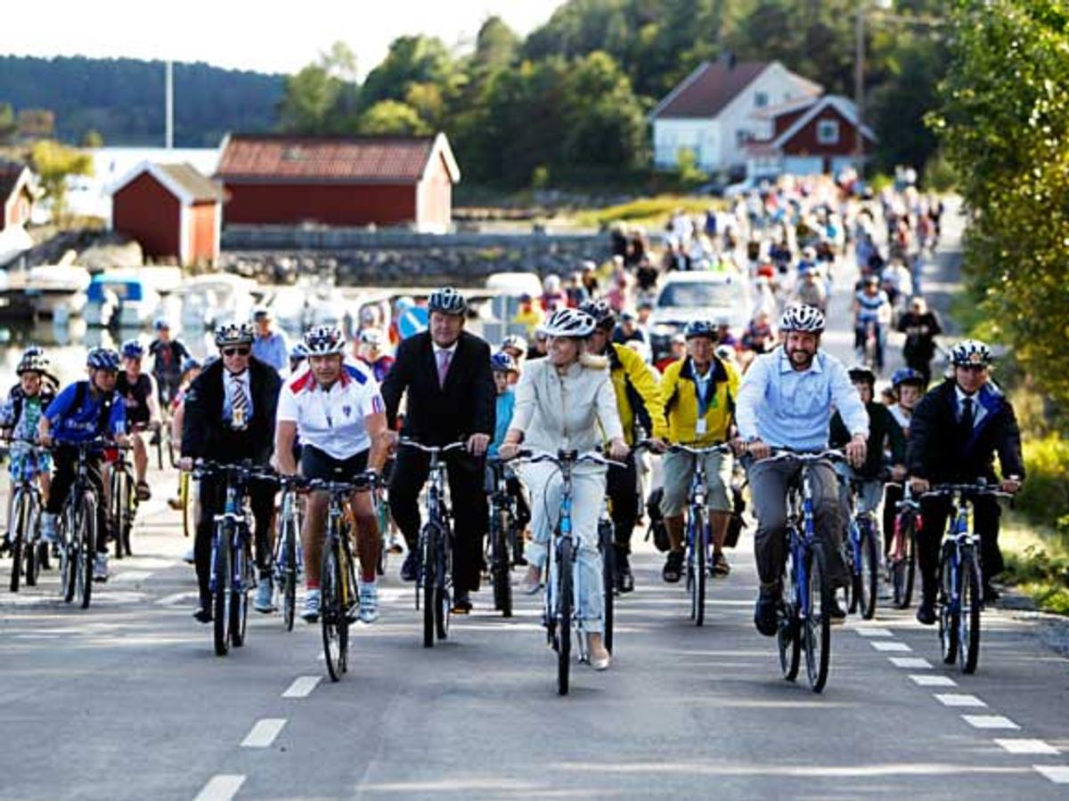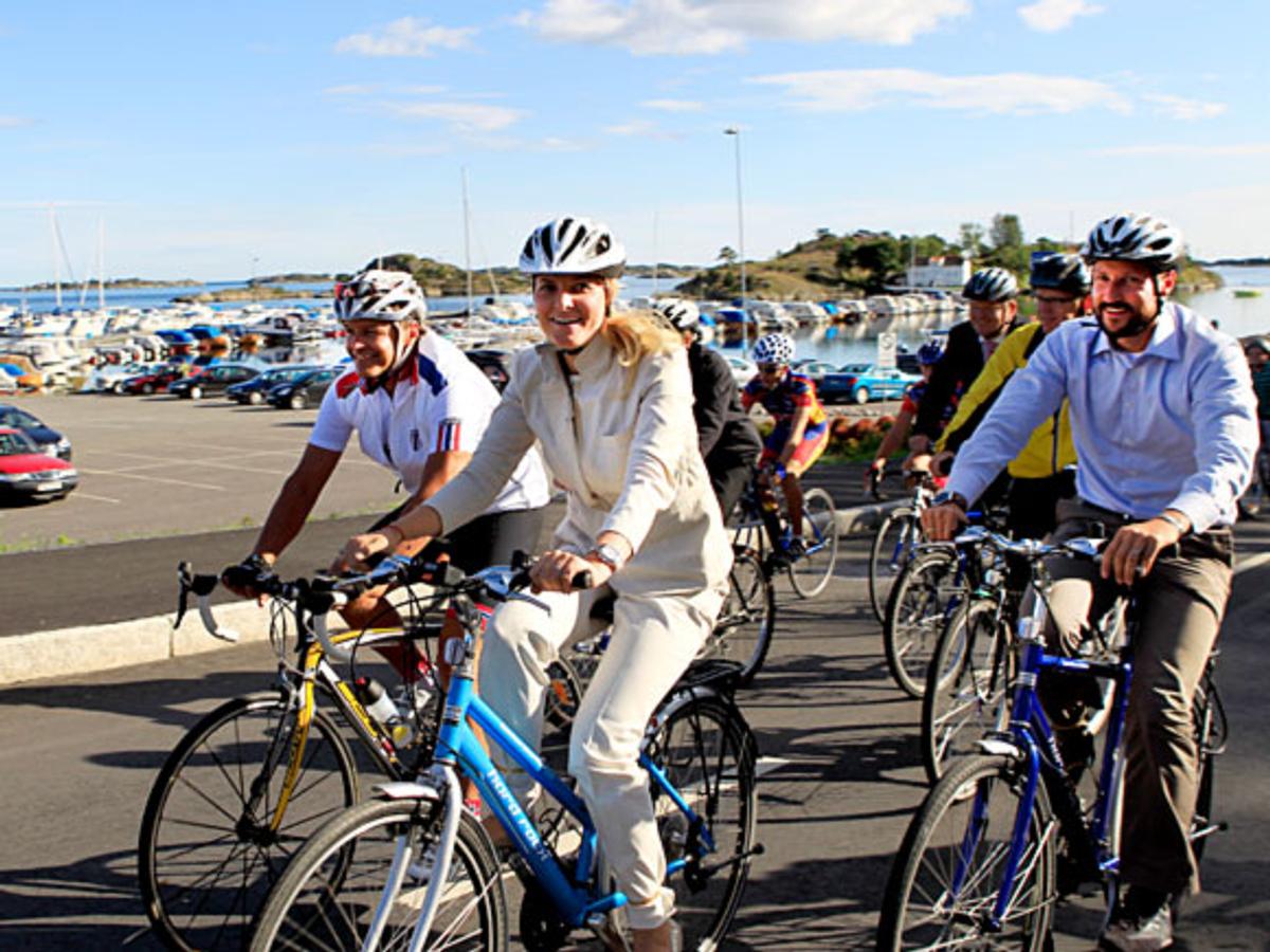 Deler av turen fra Campus og inn mot Grimstad sentrum, ble tilbakelagt på sykkel. Kronprins Haakon og Kronprinsesse Mette-Marit syklet miljøveien fra Holviga til Vesterled, som en markering av Sykkelbyen Grimstad. Mange var møtt fram langs veien for å hilse - eller ta sykkelturen sammen med Kronprinsparet.