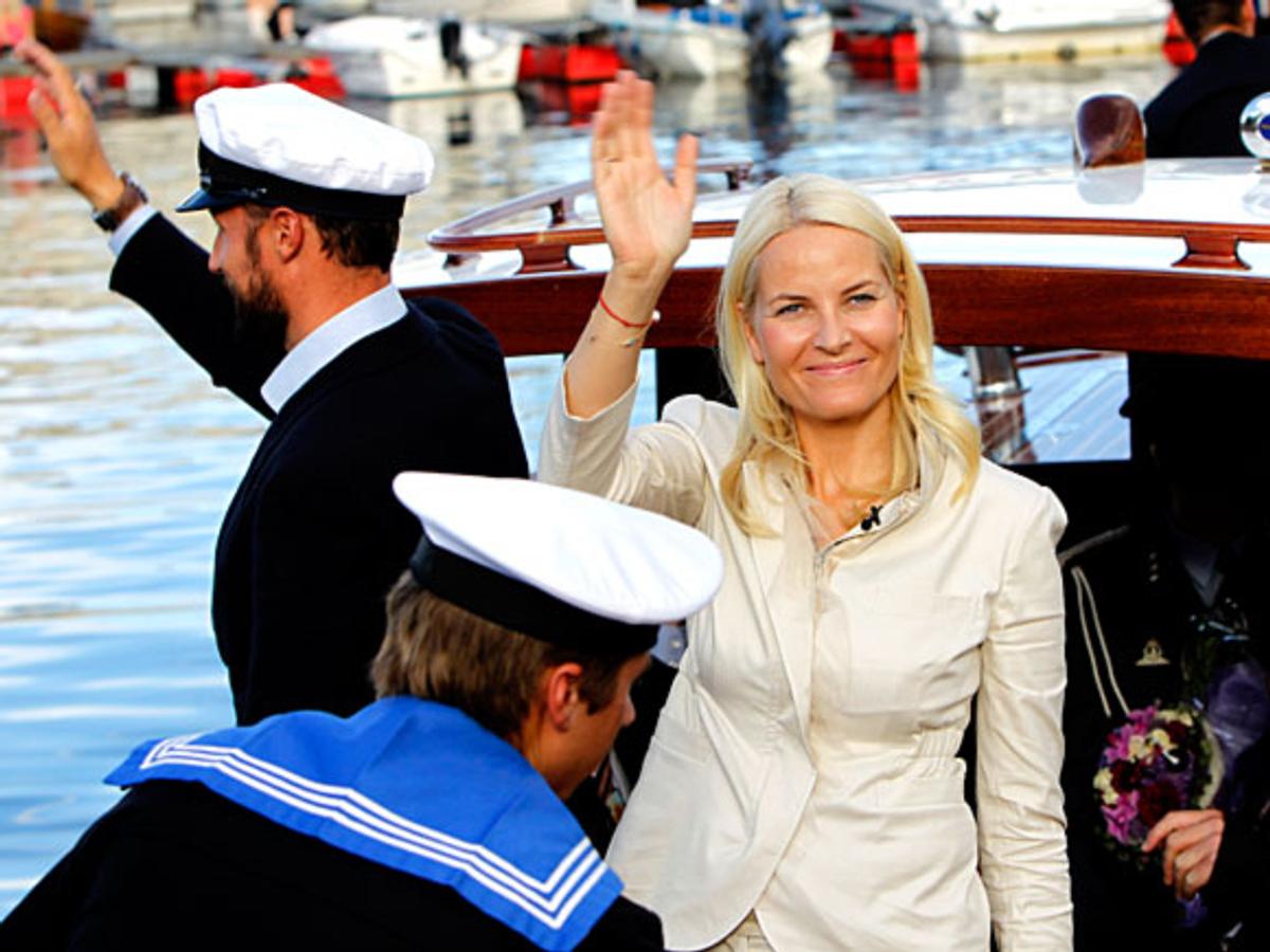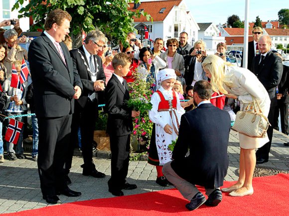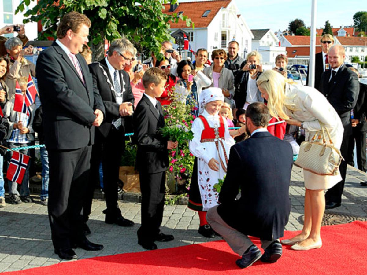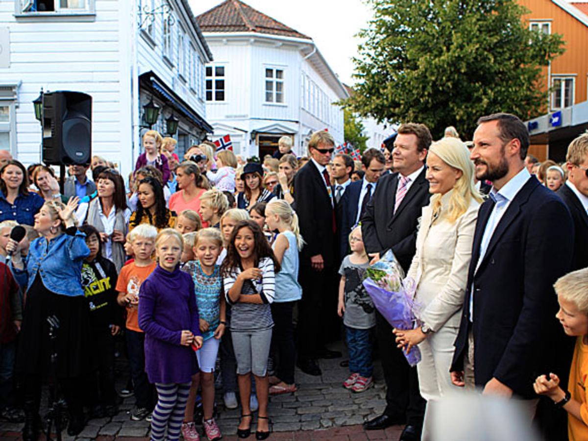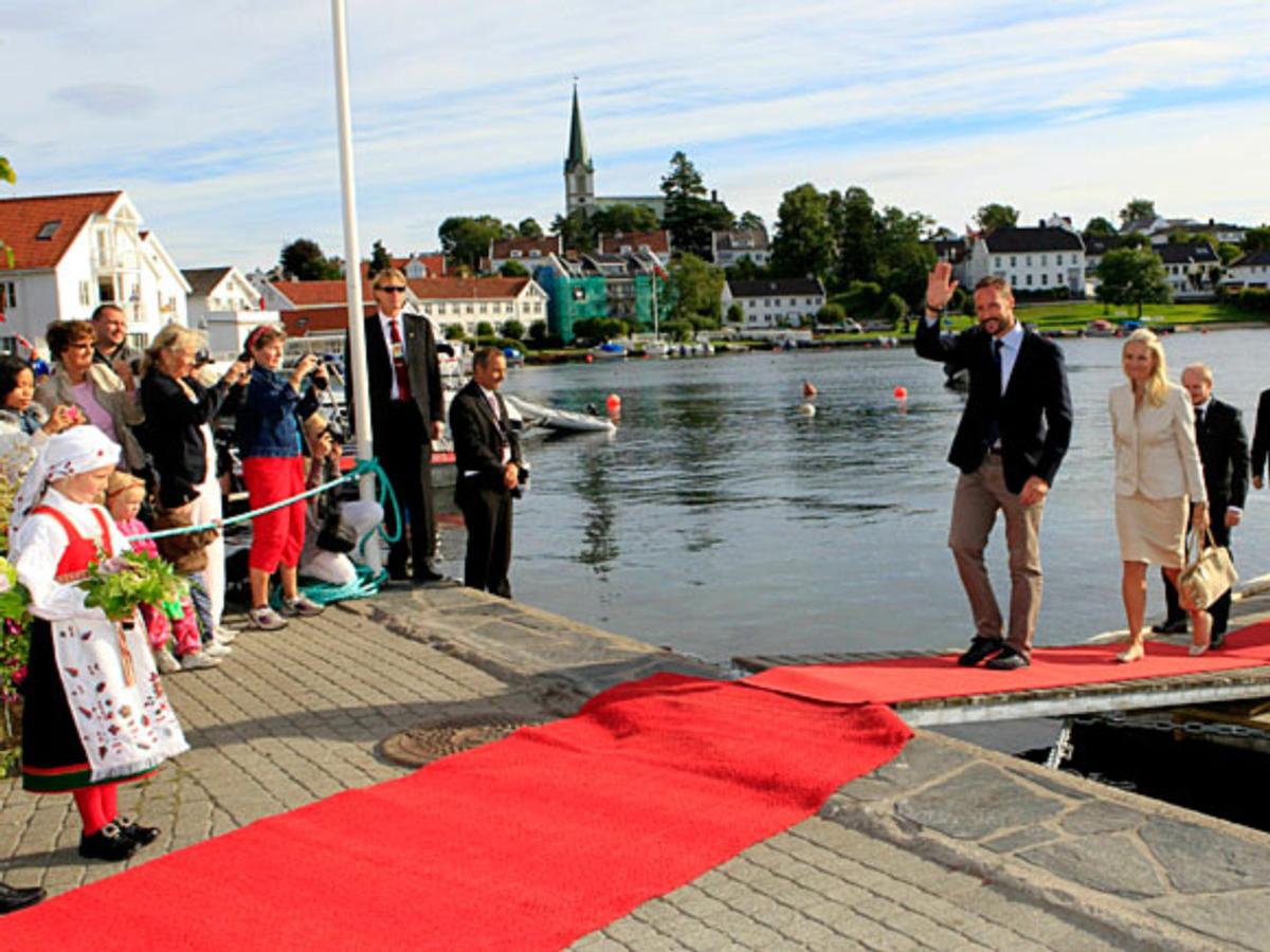 Vel framme i Grimstad ble det byvandring gjennom sentrum. Langs veien ble Kronprinsparet traktert med både Ibsen-tablå, barnekor og jazz, før de gikk om bord i sjaluppen for å reise ut til Kongeskipet.