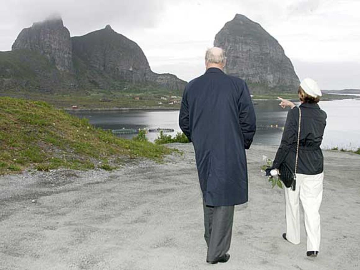 Etter ei offisiell mottaking spaserte Kong Harald og Dronning Sonja opp til kystkvinnebautaen og minnebautaene over omkomne på havet, der Kongeparet la ned krans.