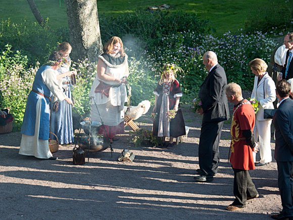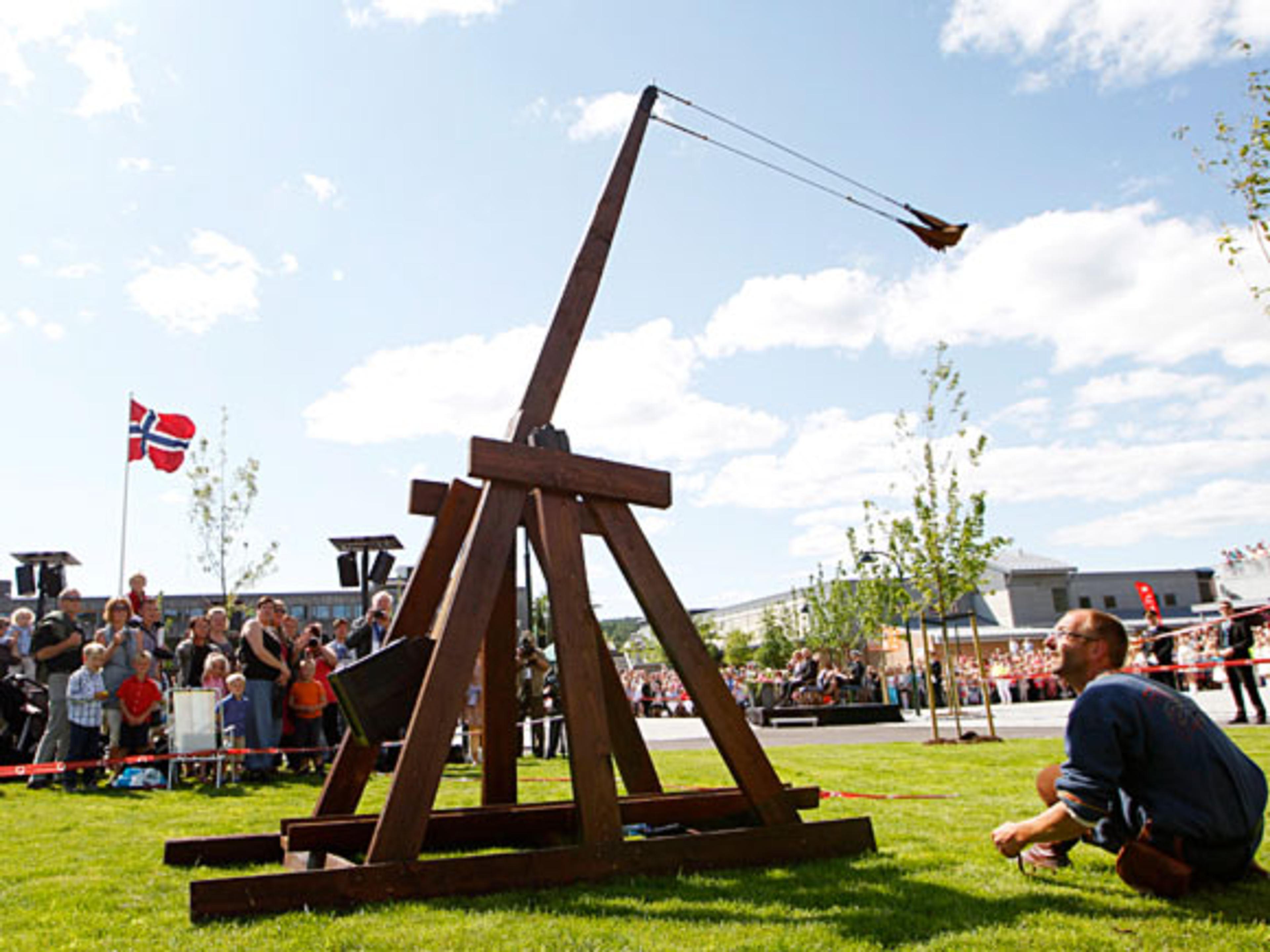 Det finnes mange minner om vikingtiden i Vestfold, og hvert år holdes det middelalderfestival i Re. Kongeparet fikk en smak av dette i Revetal park i dag, der det middelalderske kastevåpenet trebuchet viste seg svært effektivt til å skyte kålrot med.