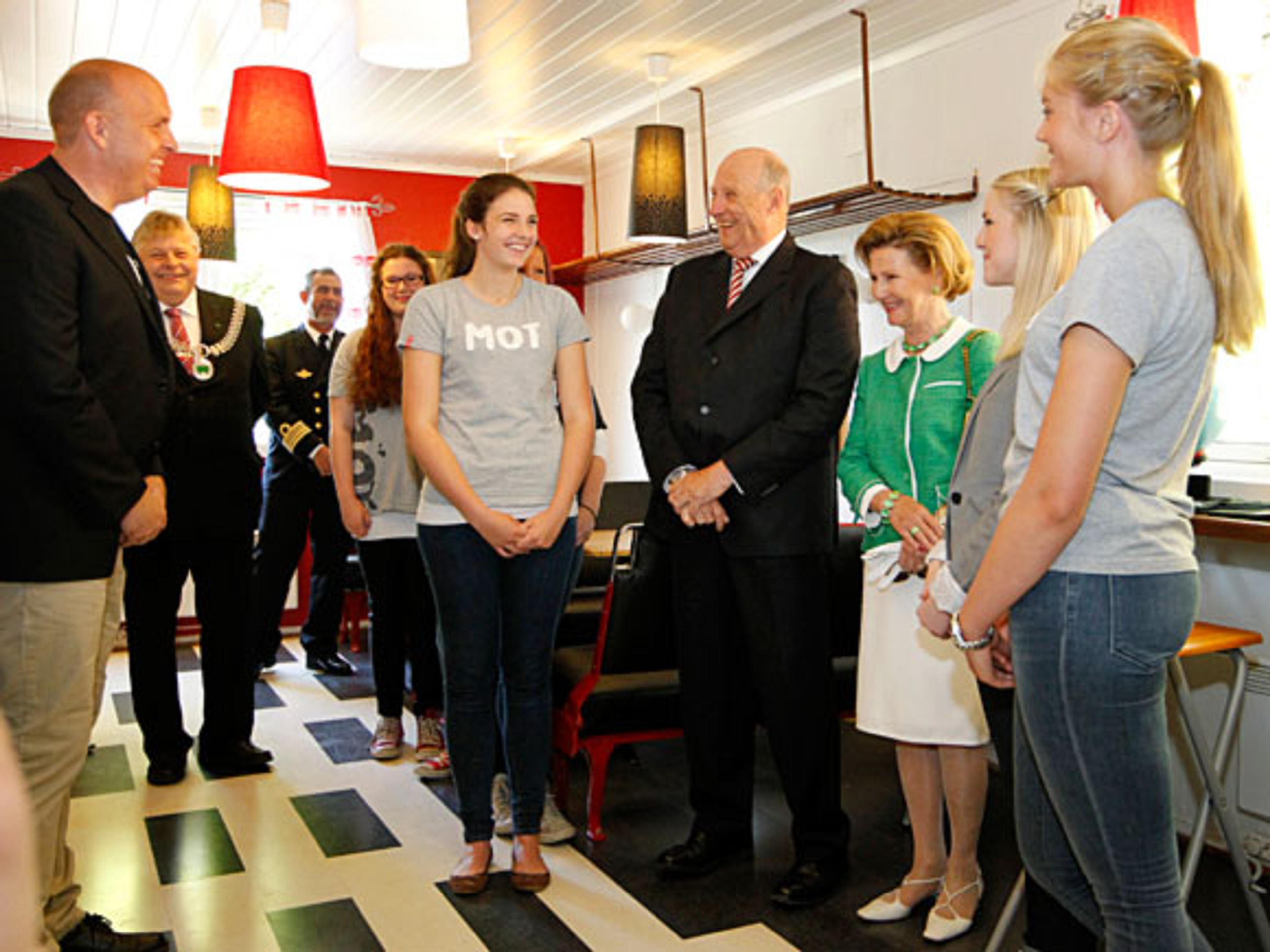 «Det store gule huset» huser flere frivillige organisasjoner, og i dag avla Kongen og Dronningen et besøk på ungdomskafeen MOT nettopp har åpnet her. MOT arbeider for og med ungdom og lokalsamfunn, og søker å bidra til trygge miljø der unge tar vare på hverandre og tør å vise MOT.
