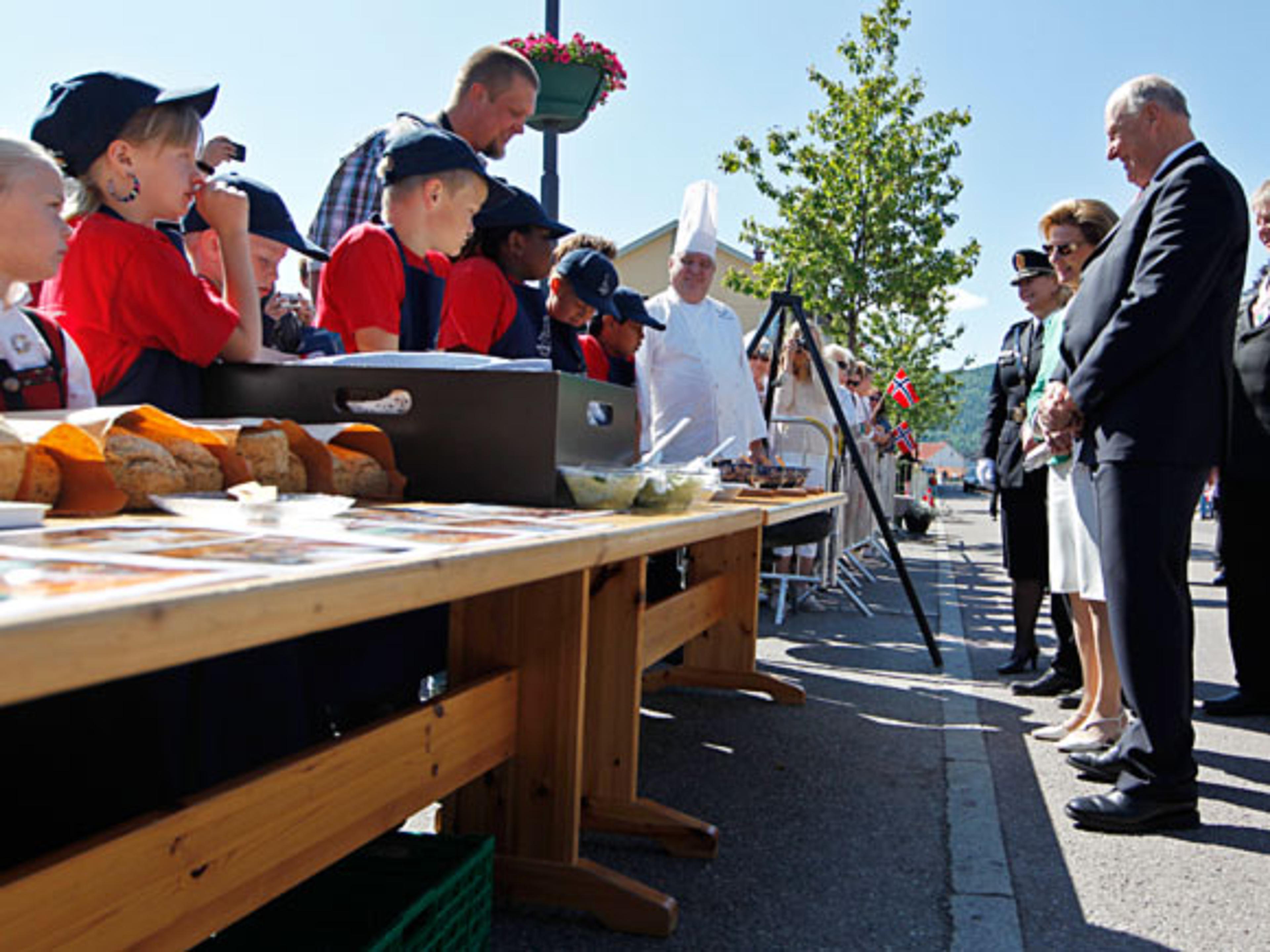 På sin vandring langs Fila fikk Kongeparet smake småsuppe og annen mat som barn fra SFO og prosjektet Kul Mat hadde laget. Mer enn halvdelen av maten som serveres i SFO i Sande er laget på økologiske matvarer, i tråd med kommunens satsning på økologisk landbruk.