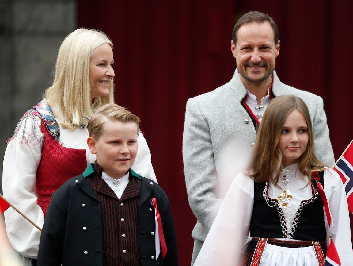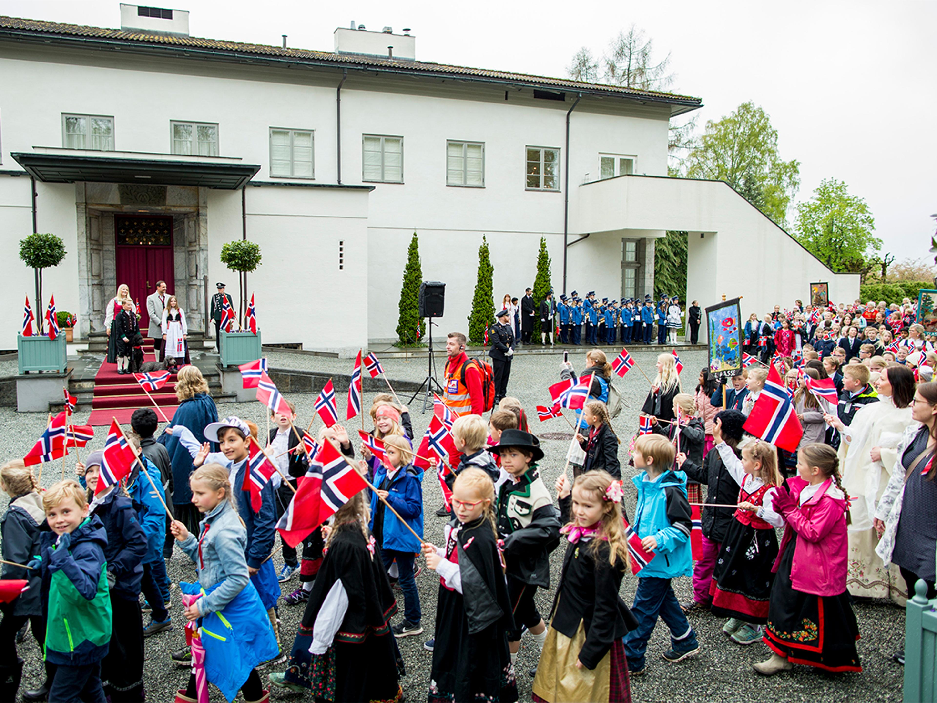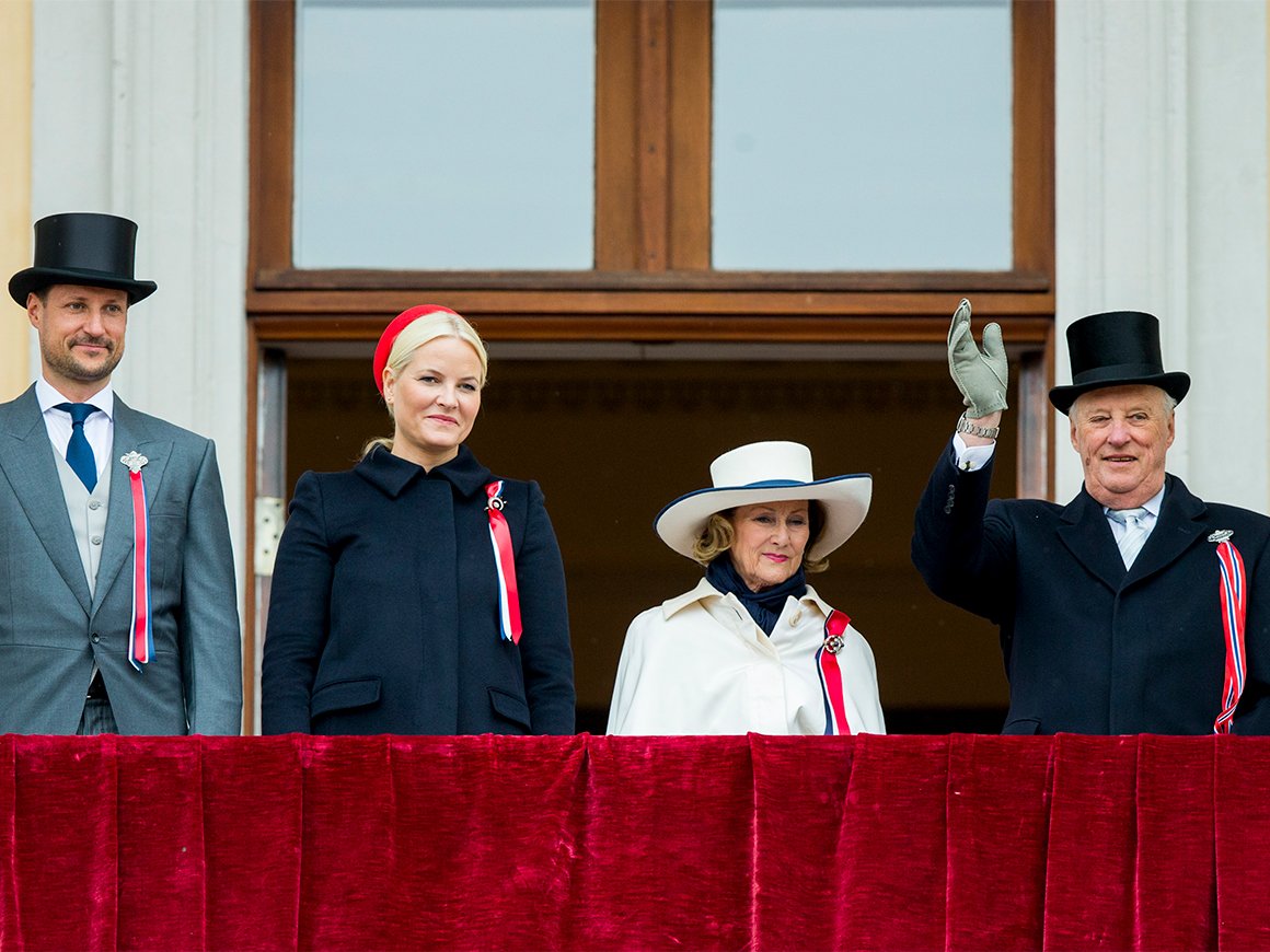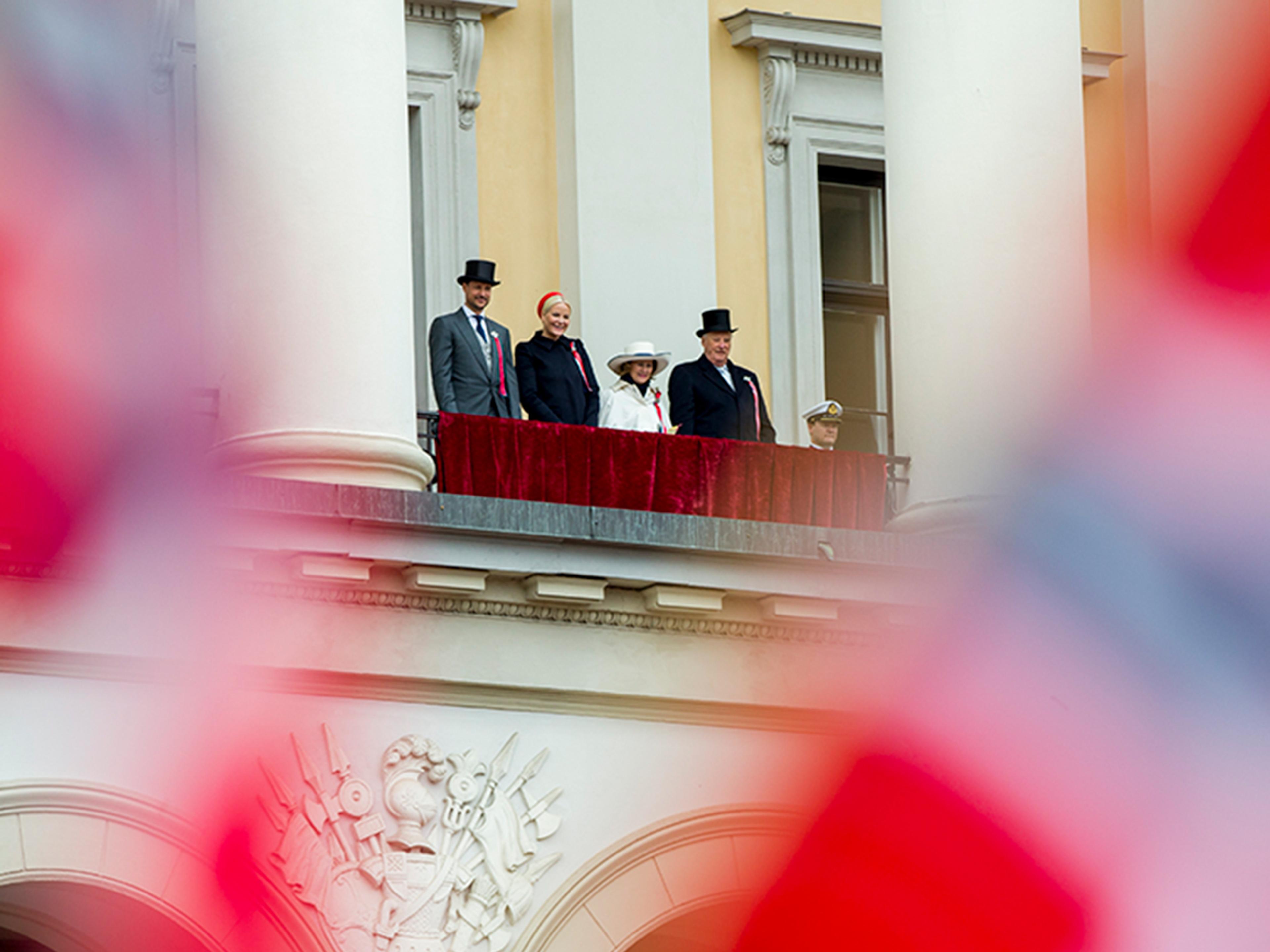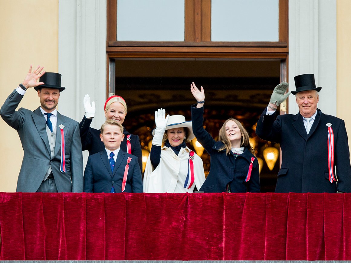 Kongefamilien inntok sin tradisjonsrike plass på Slottsbalkongen for å helse barnetoget 10.30. Da hadde Kronprinsfamilien alt møtt barnetoget i Asker, som passerte Skaugum 08.15.