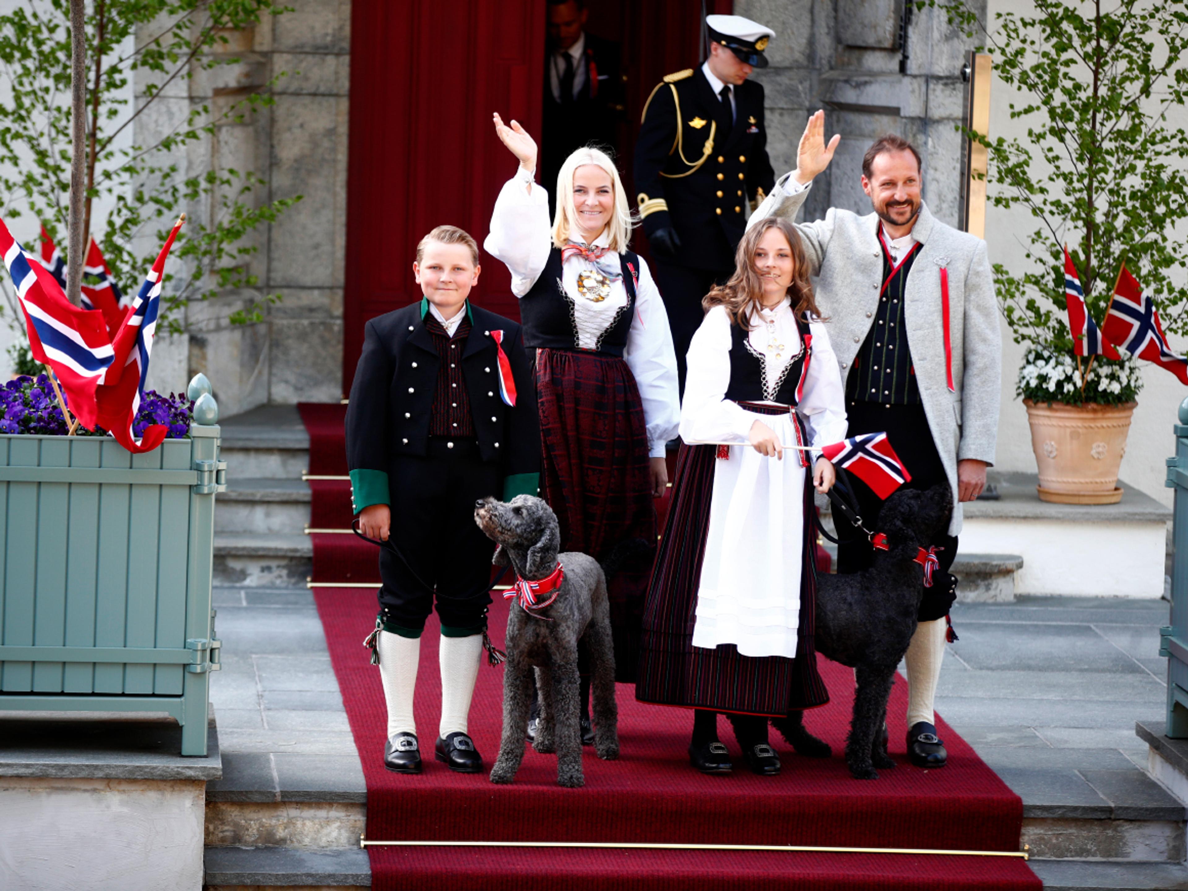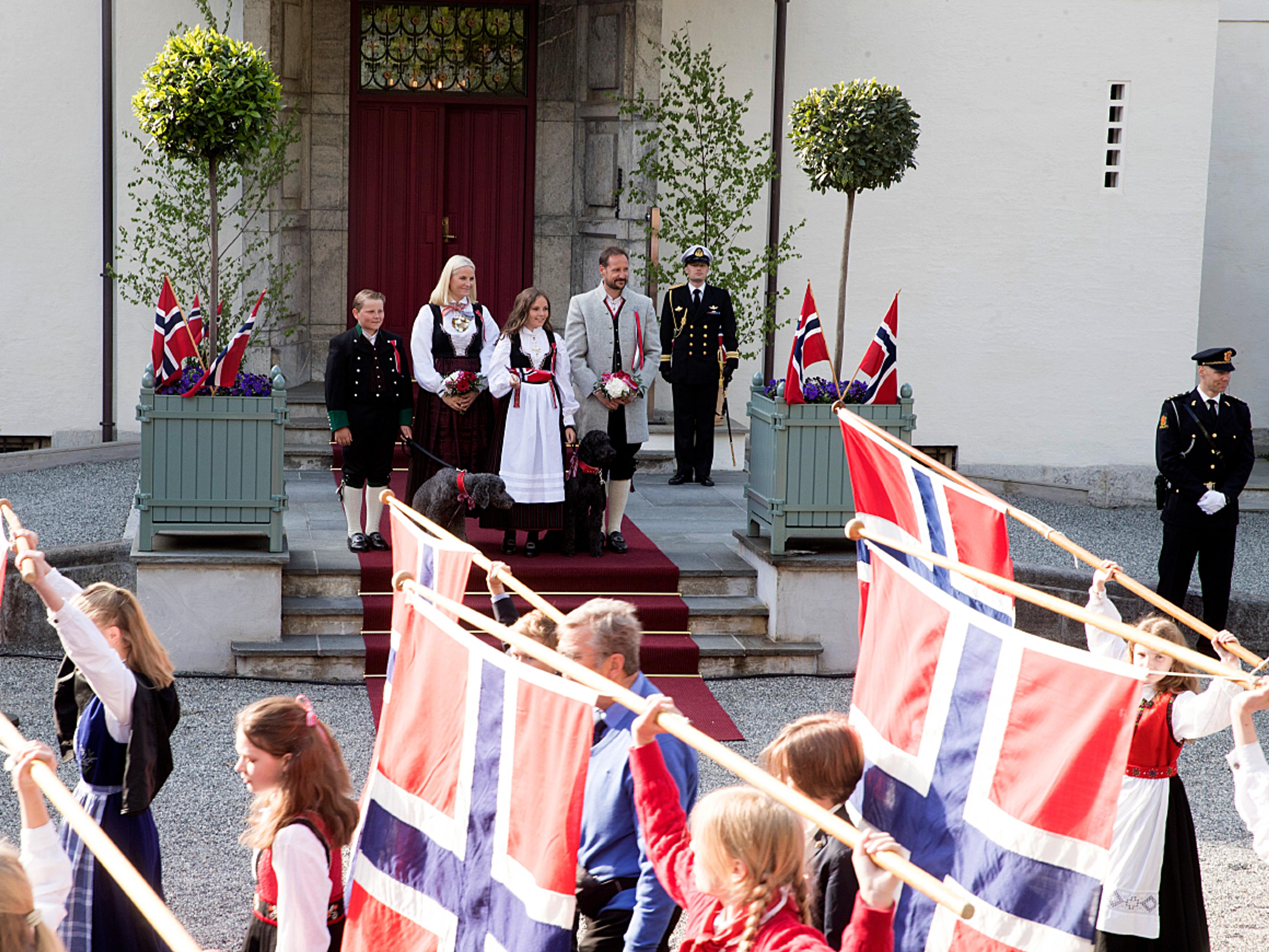 Kronprinsfamilien starta dagen med å helse barnetoget i Asker. Det passerer Skaugum frå omkring klokka 08.00.