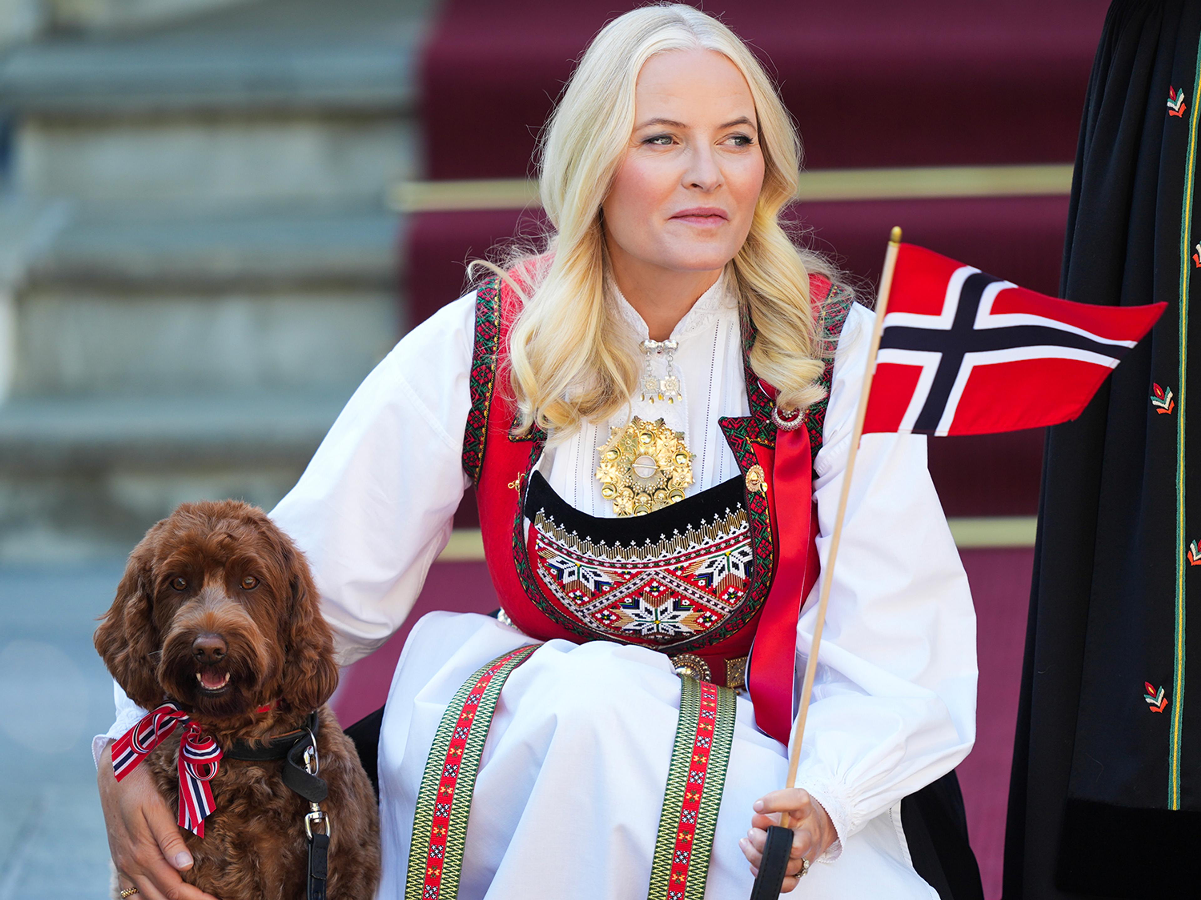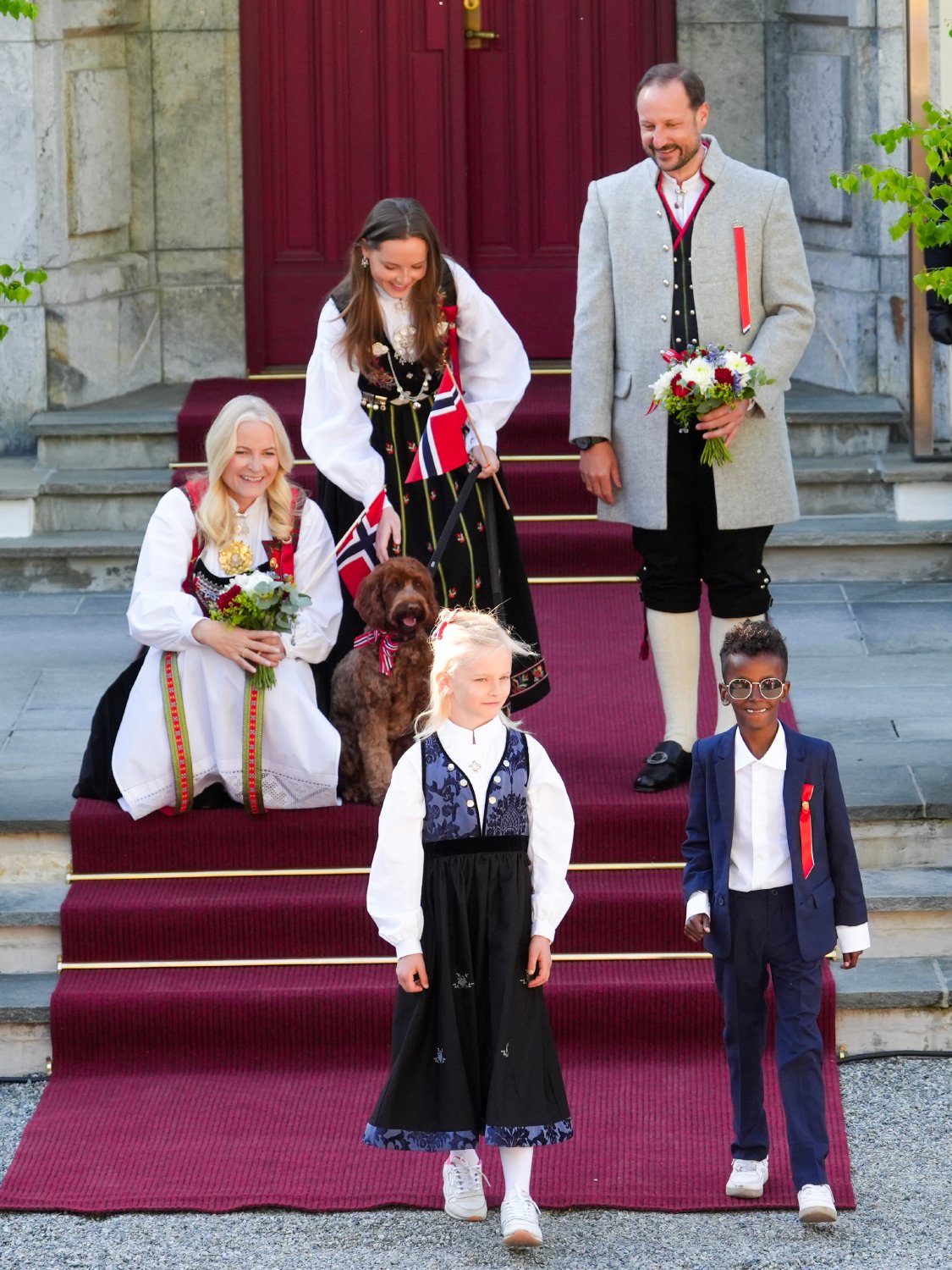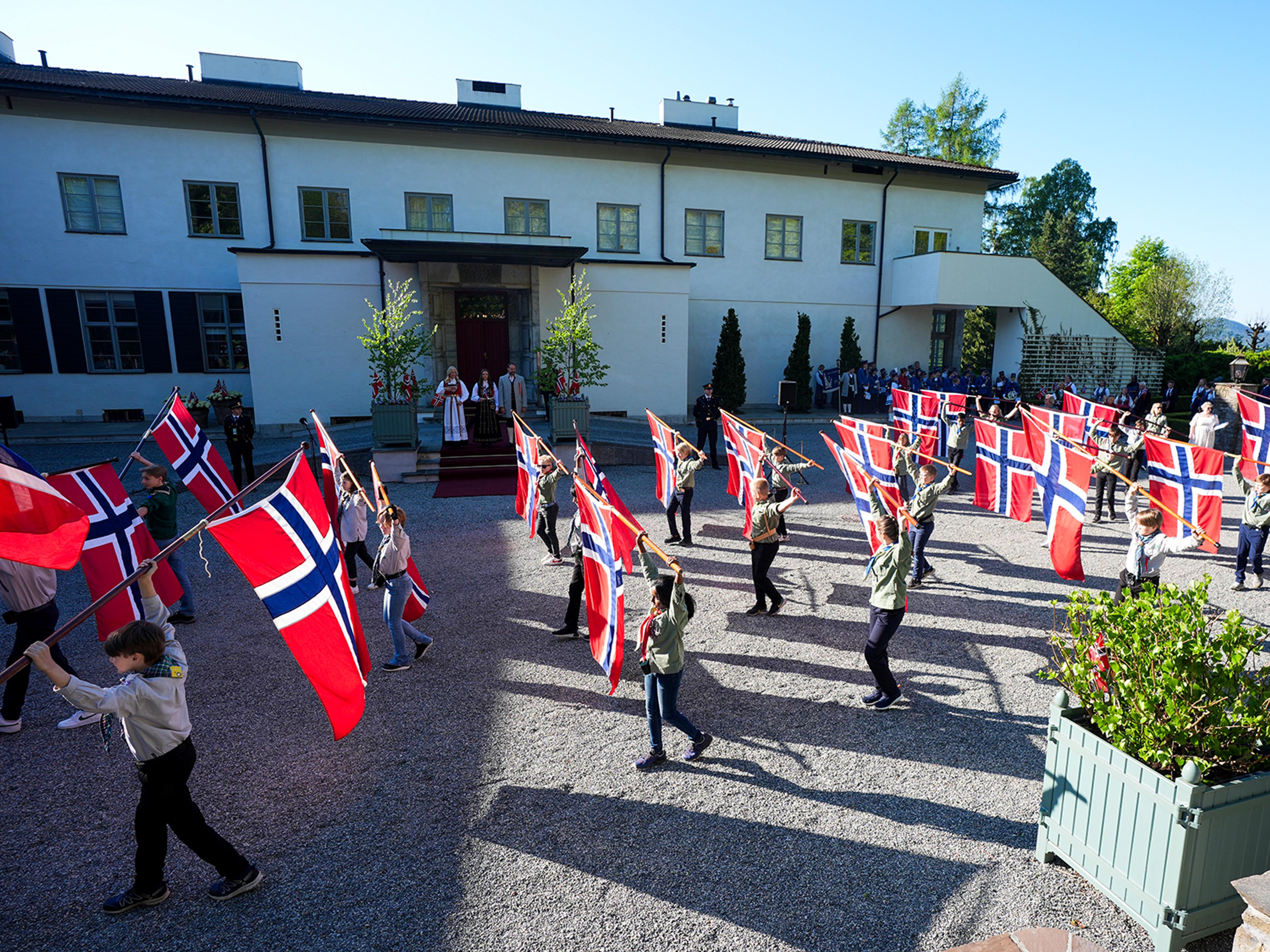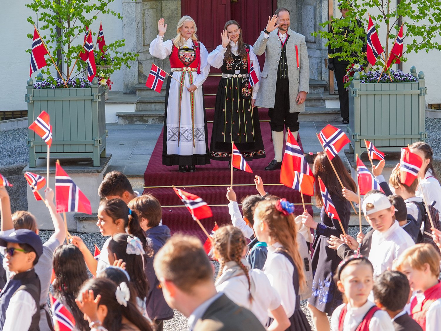 Tradisjonen tro startet Kronprinsparet og Prinsesse Ingrid Alexandra dagen på Skaugum der de hilste barnetoget i Asker.