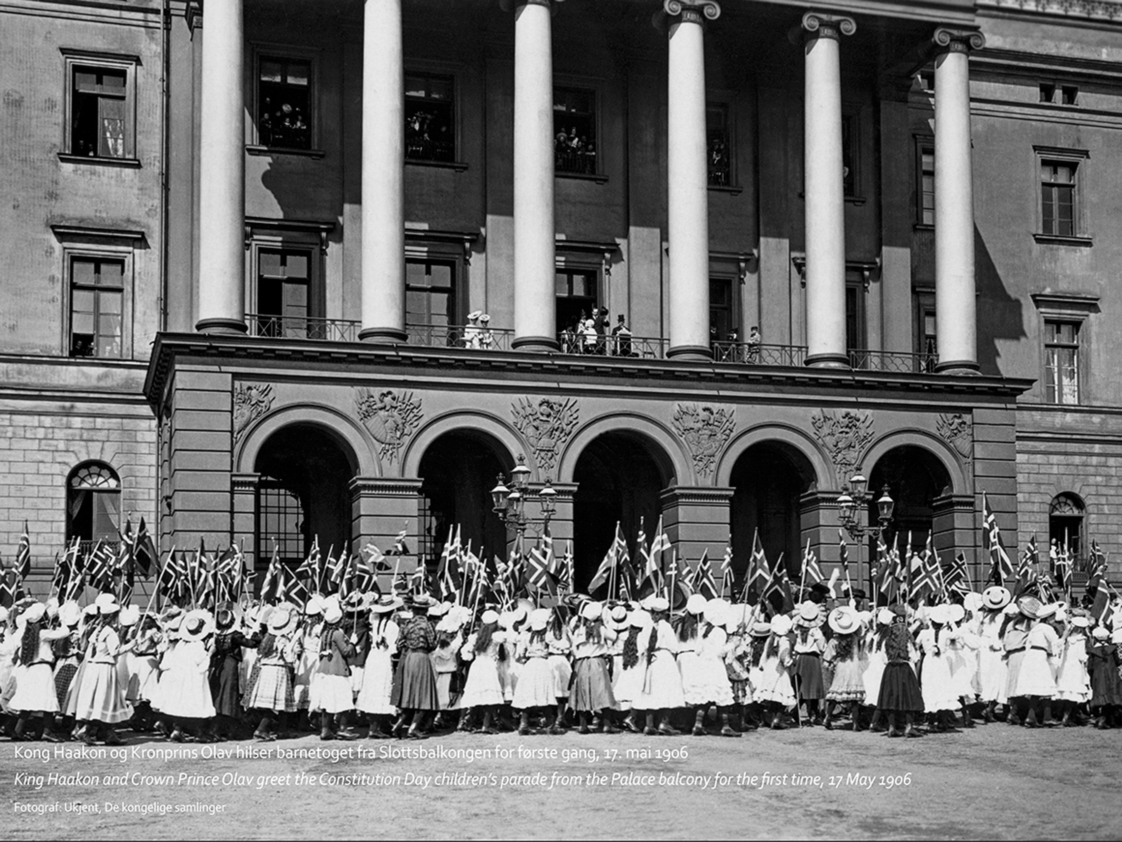 1906: Kong Haakon og Dronning Maud innstifter skikken med å hilse barnetoget i Oslo fra Slottsbalkongen.