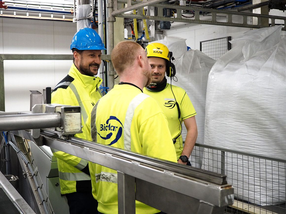 Under bedriftsbesøket på BioMar fekk Kronprinsen ei orientering og guida tur gjennom fabrikkområdet av administrerande direktør Jan Sverre Røsstad og Tore Gunnar Wikdal i BioMar. Dei fortalte om berekraftige løysingar, innovasjon og vekst på naturens premissar.