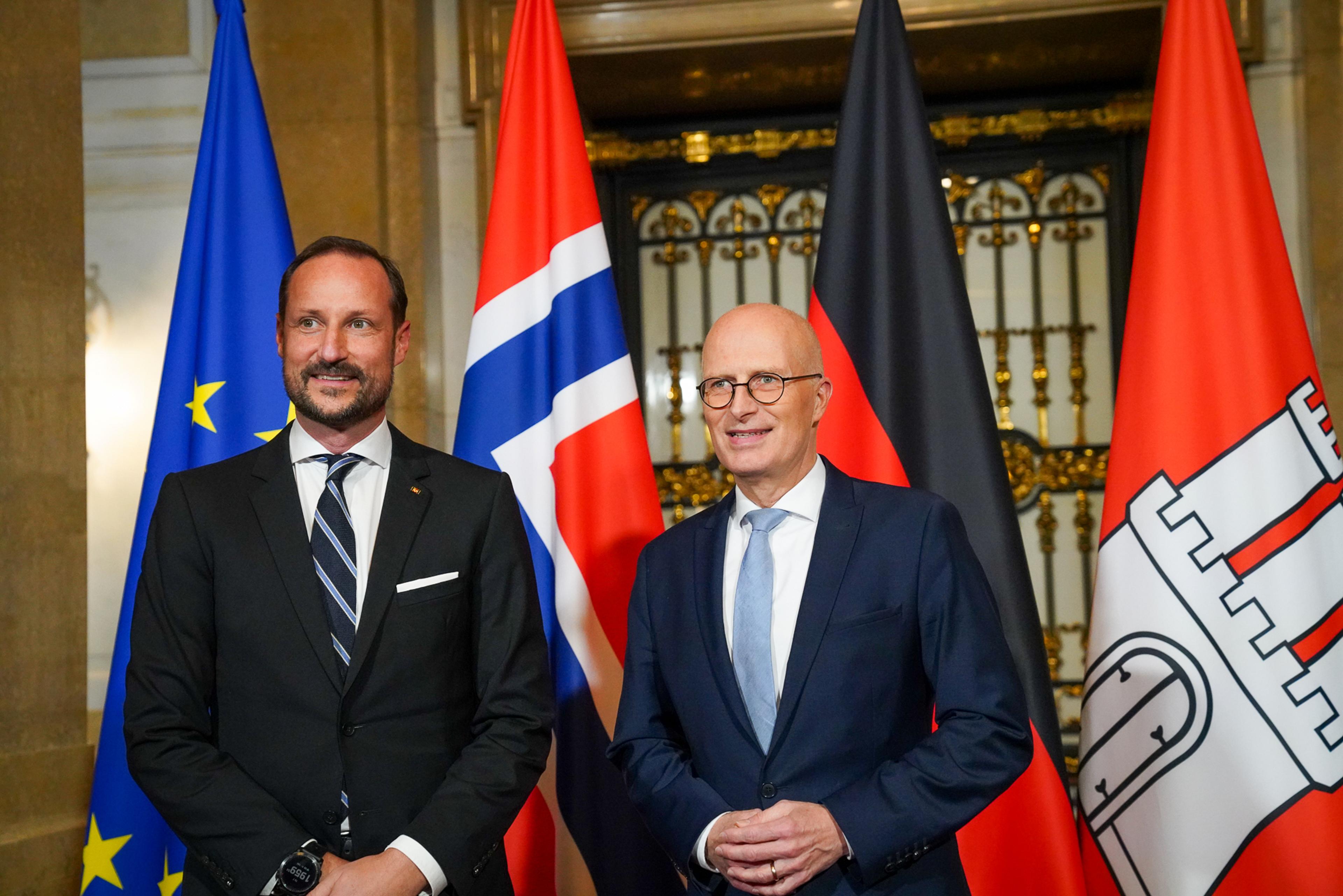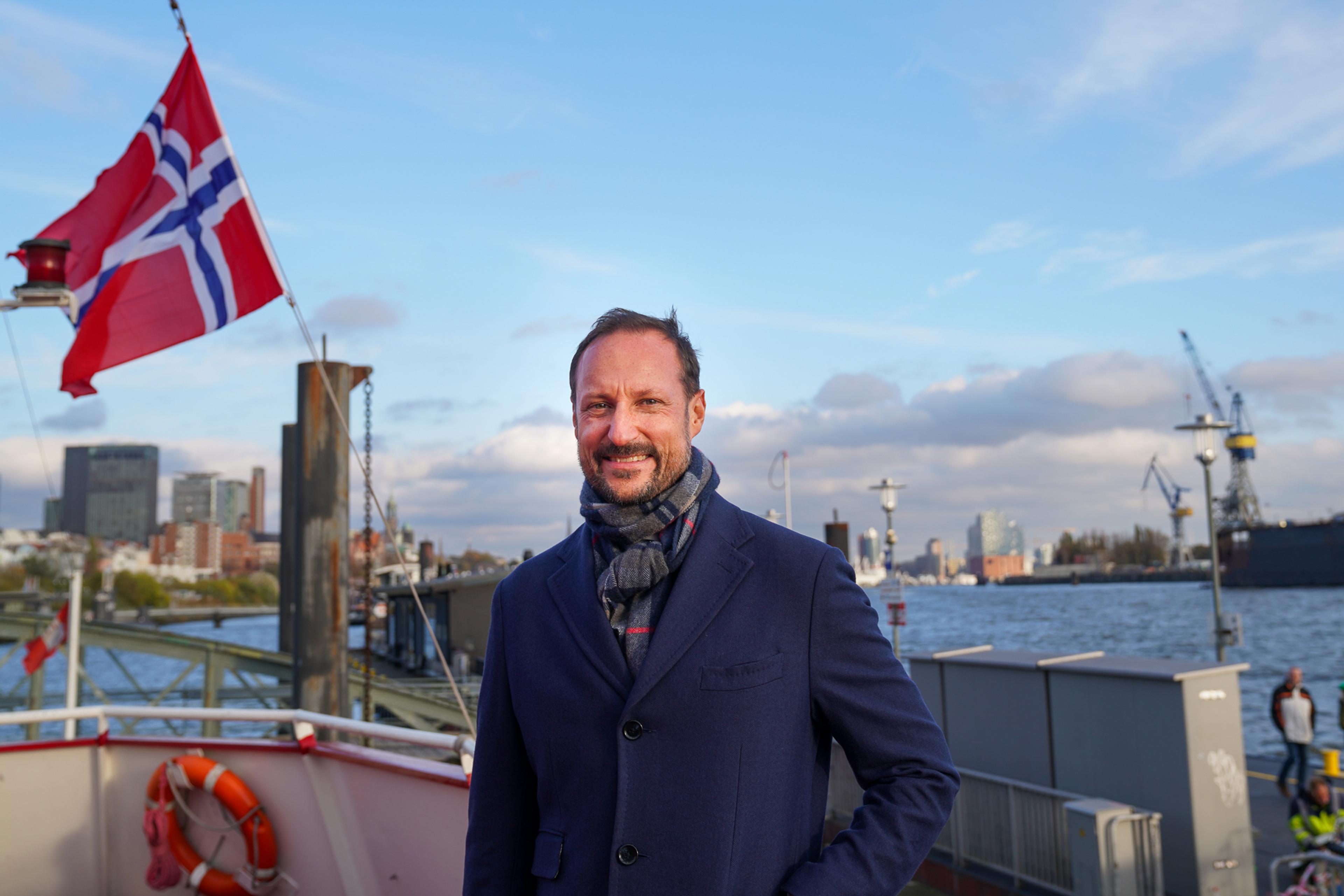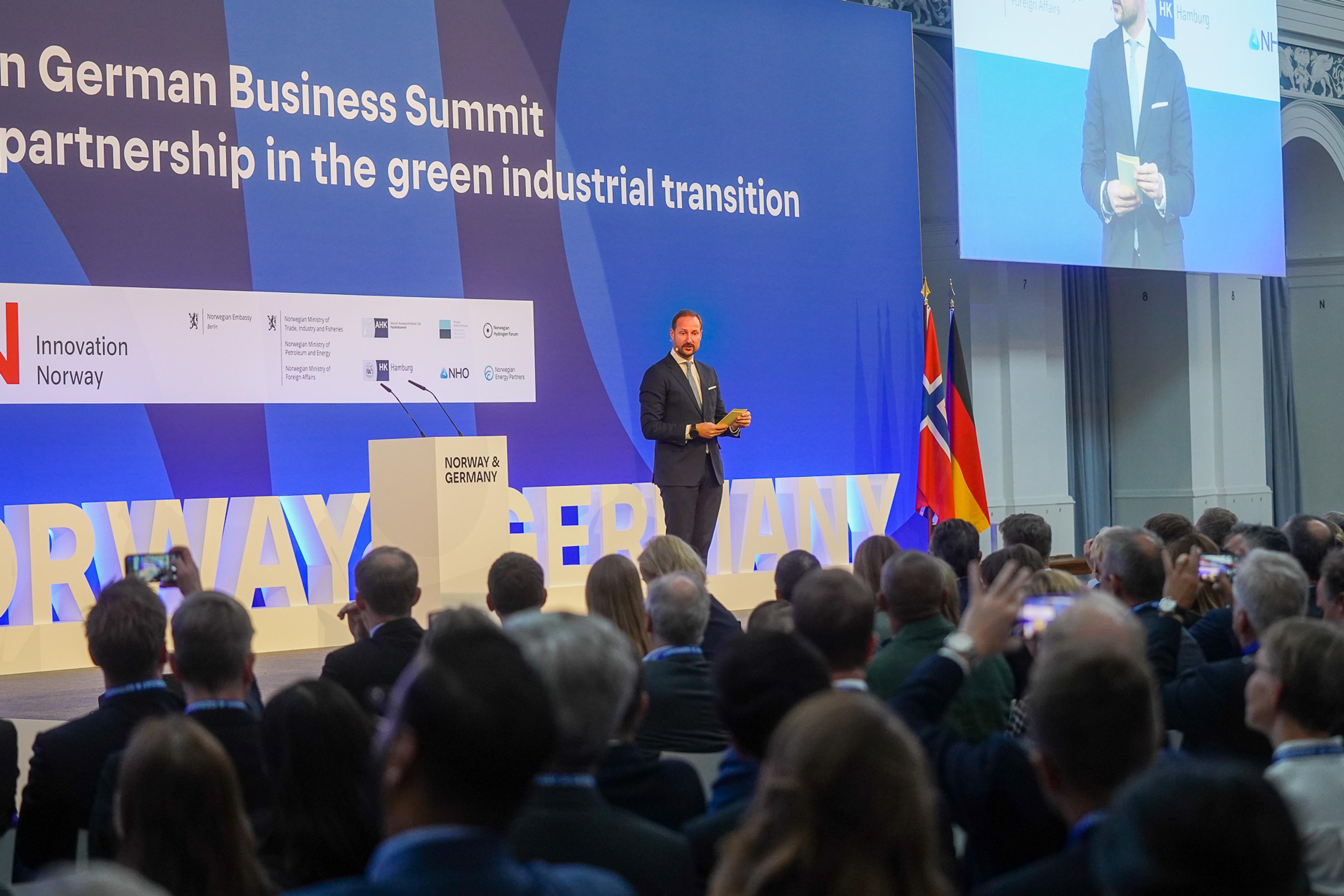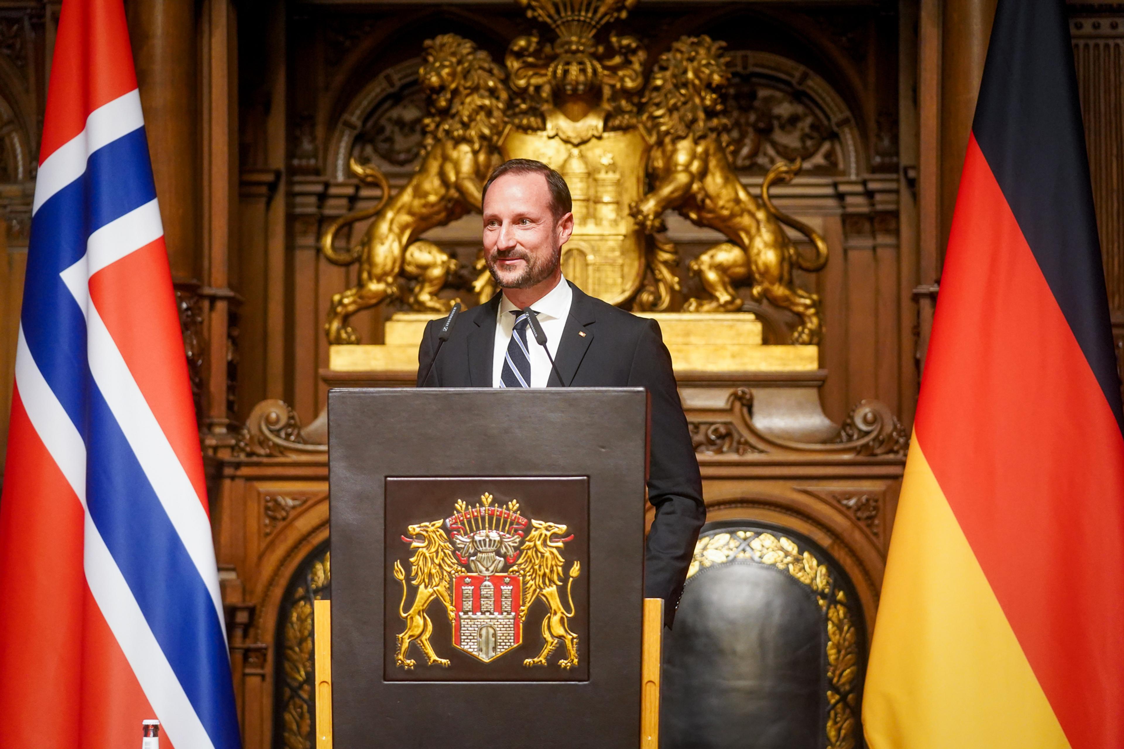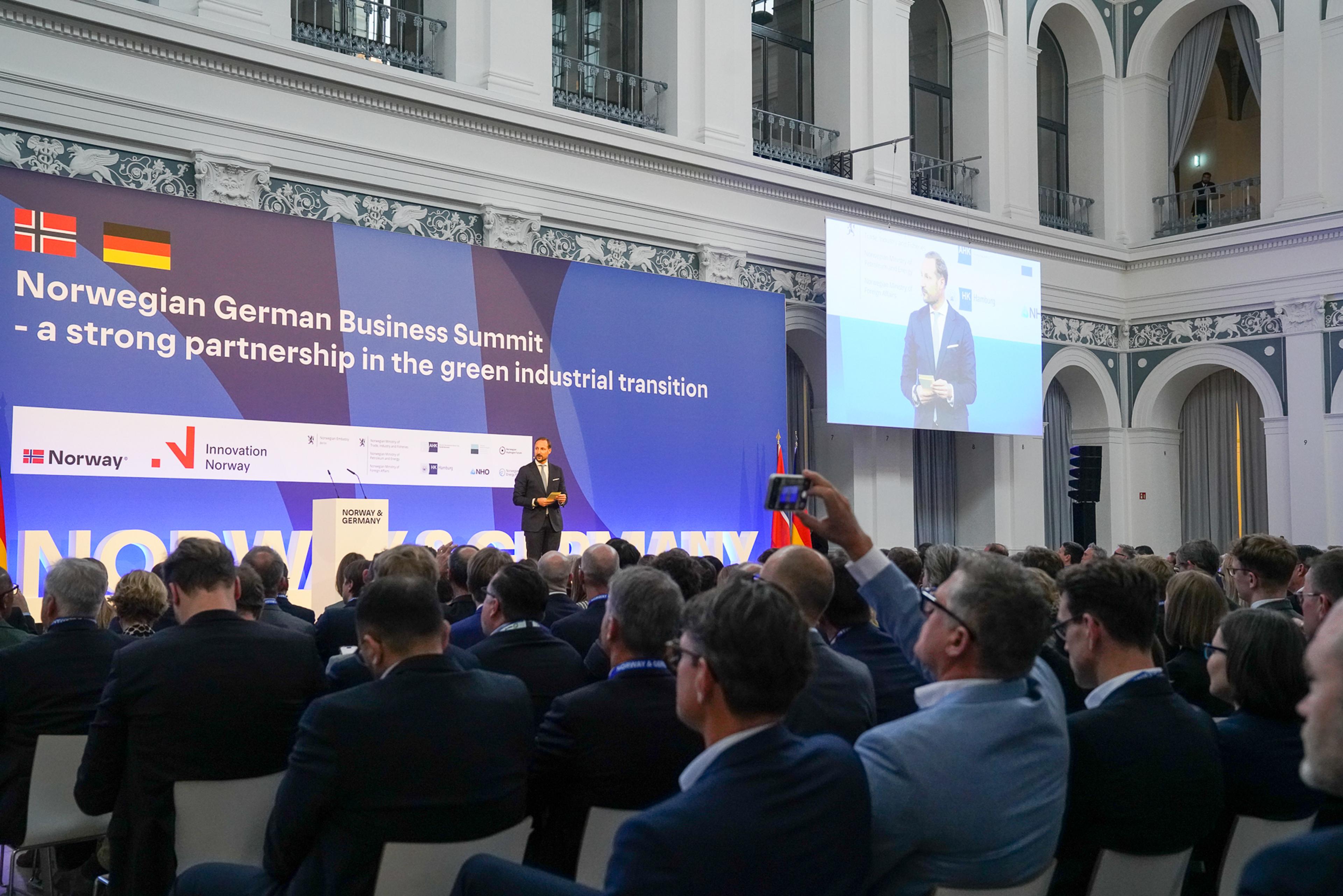 Kronprinsen var også til stede og talte under plenumsåpningen av en næringslivskonferanse om grønn omstilling ved Handelskammeret i Hamburg med tittelen "Norway and Germany - A strong partnership in the green industrial transition" onsdag.