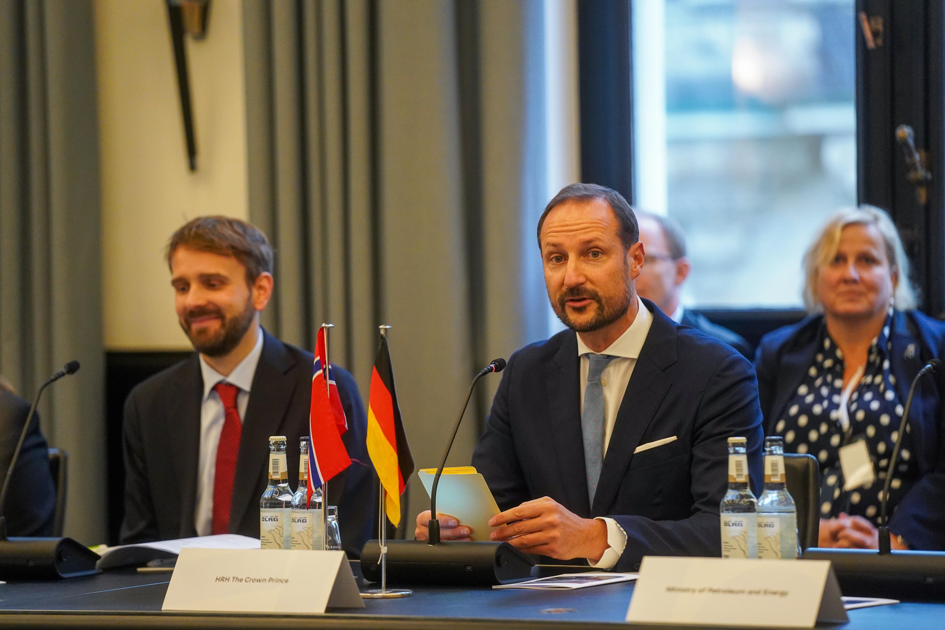 Kronprins Haakon startet dagen på en høynivå-rundebordskonferanse om hydrogen. Sammen jobber Norge og Tyskland med å utforske mulighetene for verdikjeder innenfor hydrogen- og lavkarbonløsninger.