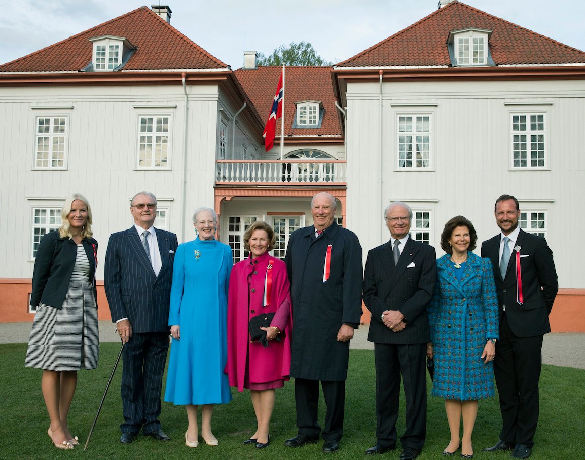 Dronning Margrethe og Prins Henrik, Kong Carl Gustaf og Dronning Silvia, Kong Harald og Dronning Sonja, og Kronprins Haakon og Kronprinsesse Mette-Marit ankom Eidsvoll-bygningen klokken 19.00.