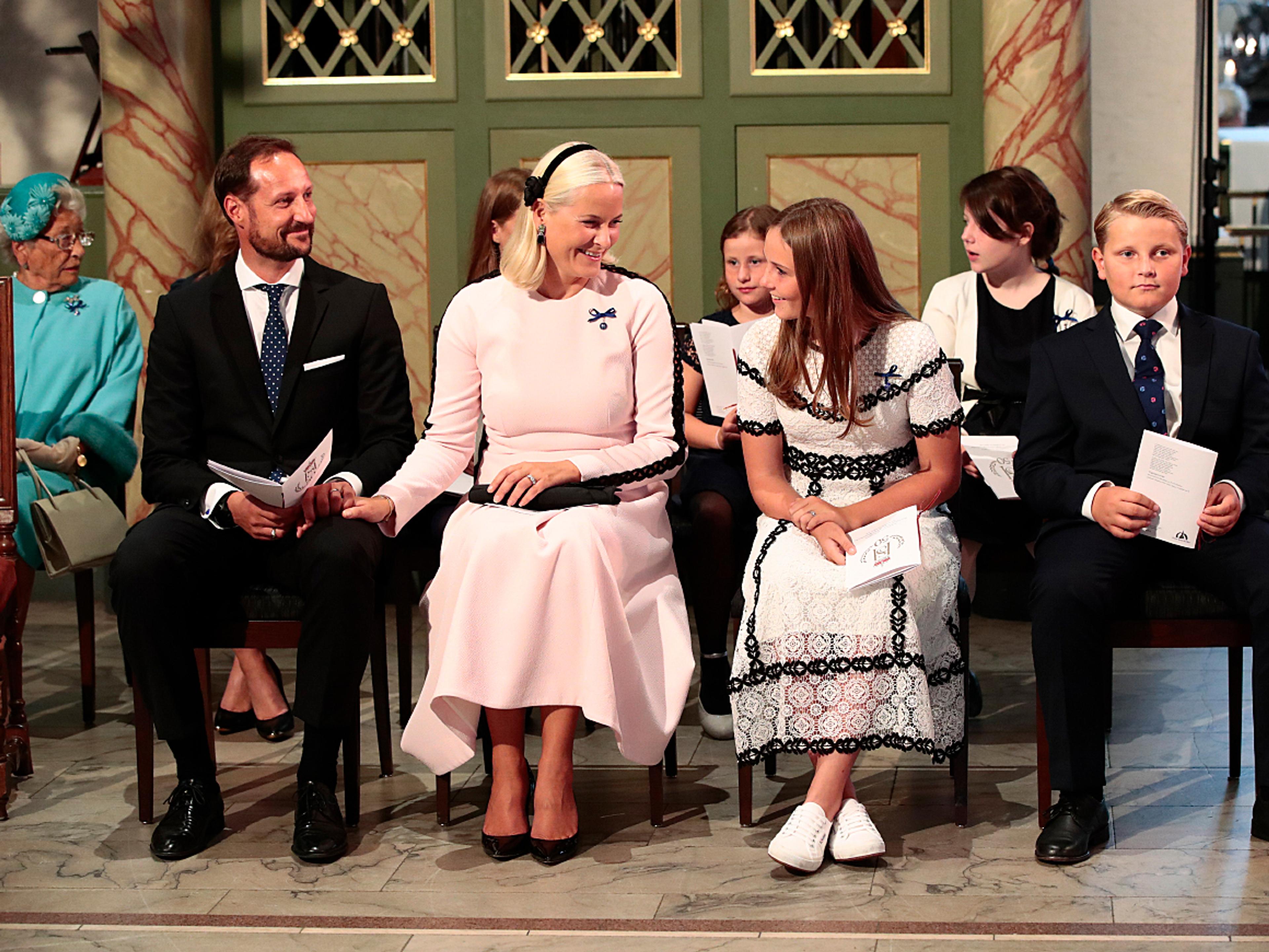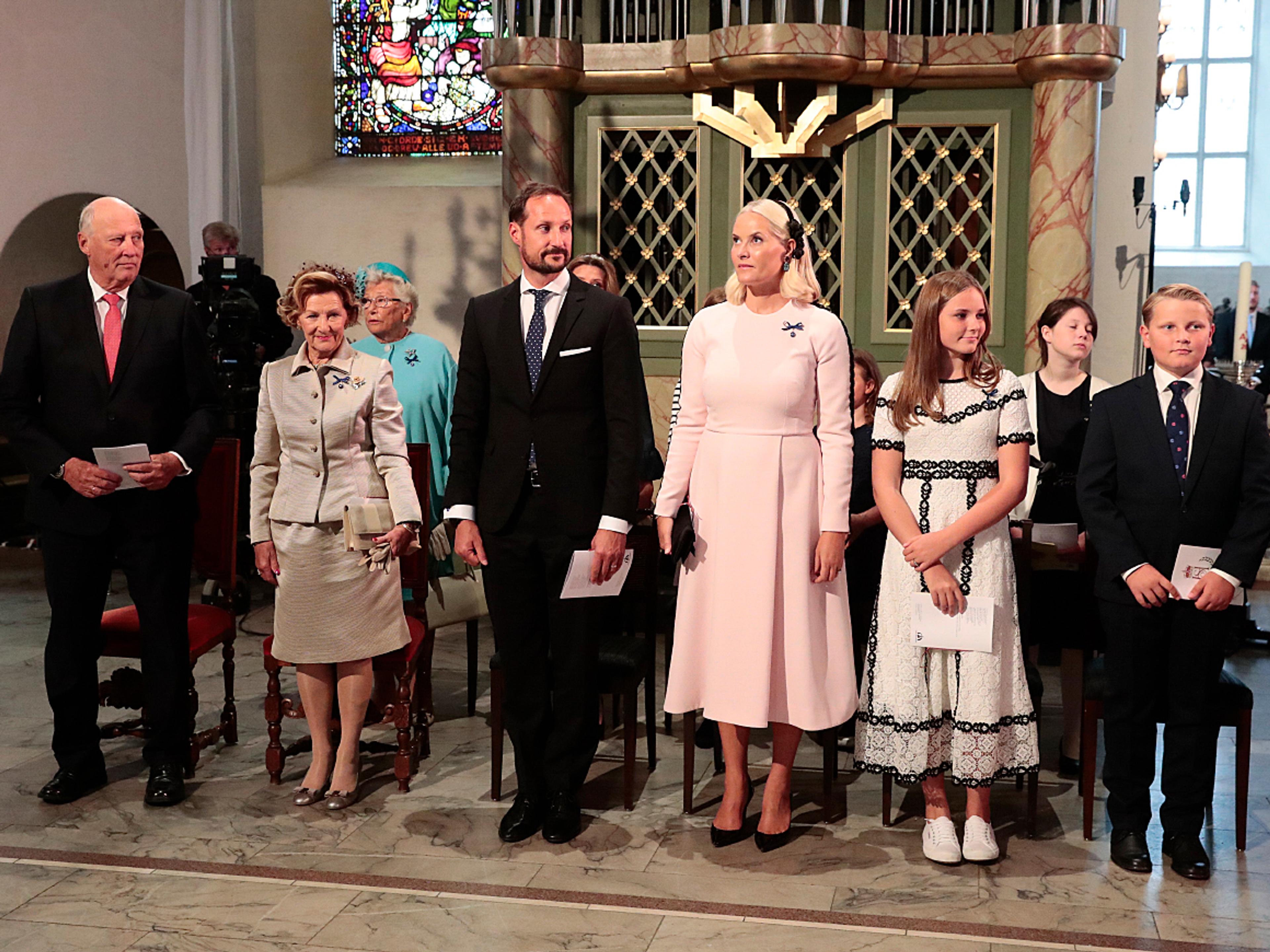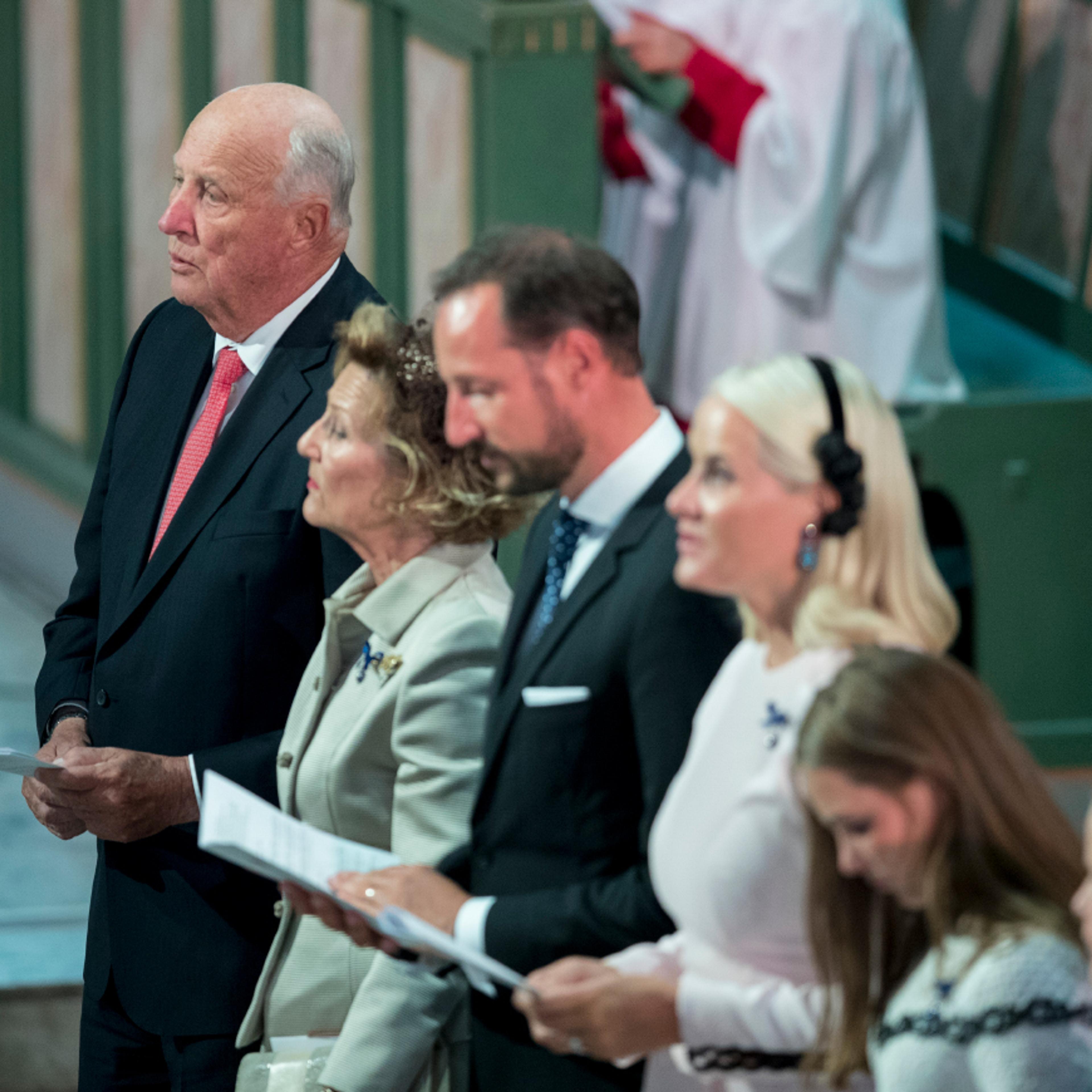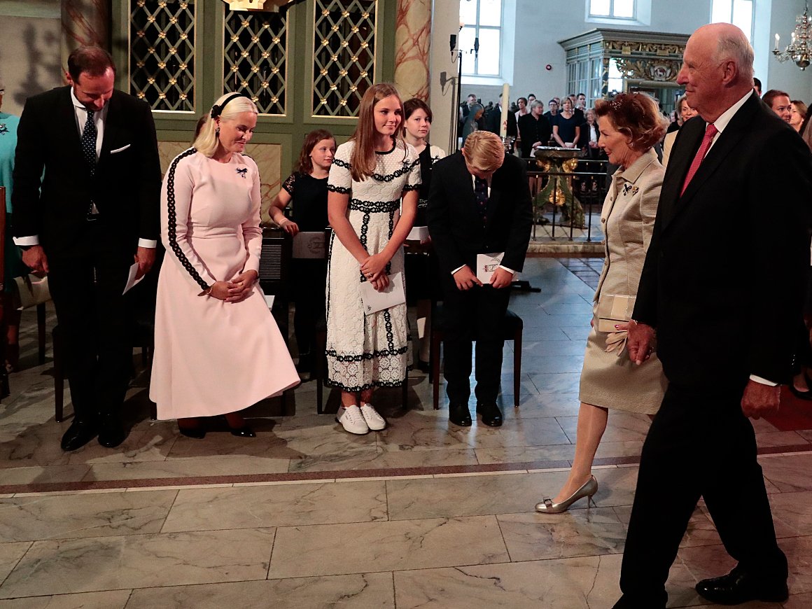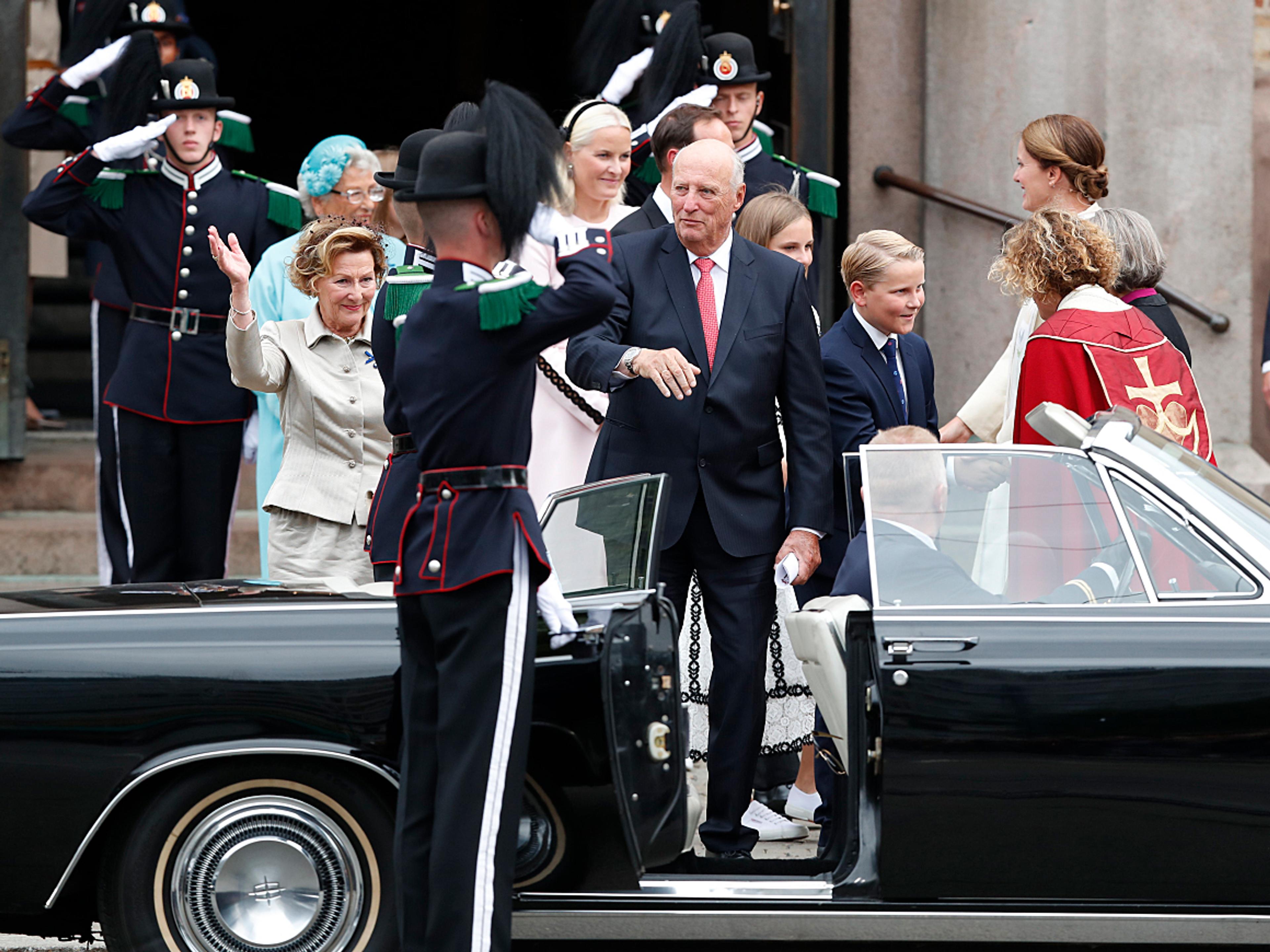 Noen minutter før gudstjenesten skulle ta til, reiste Kong Harald og Dronning Sonja fra Slottet i åpen bil - i A5, den samme bilen som tok dem fra Domkirken til Slottet som nygift par i 1968. Det var også denne bilen som kjørte Kronprinsparet etter deres bryllup i 2001.