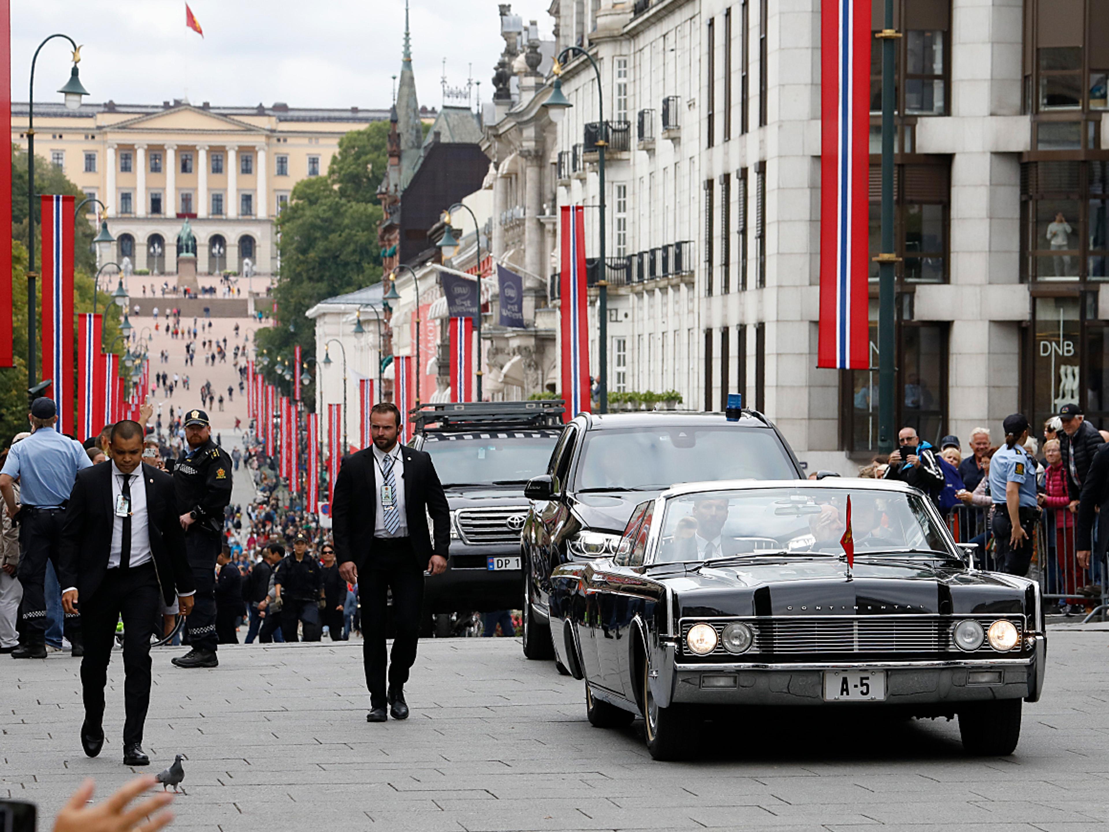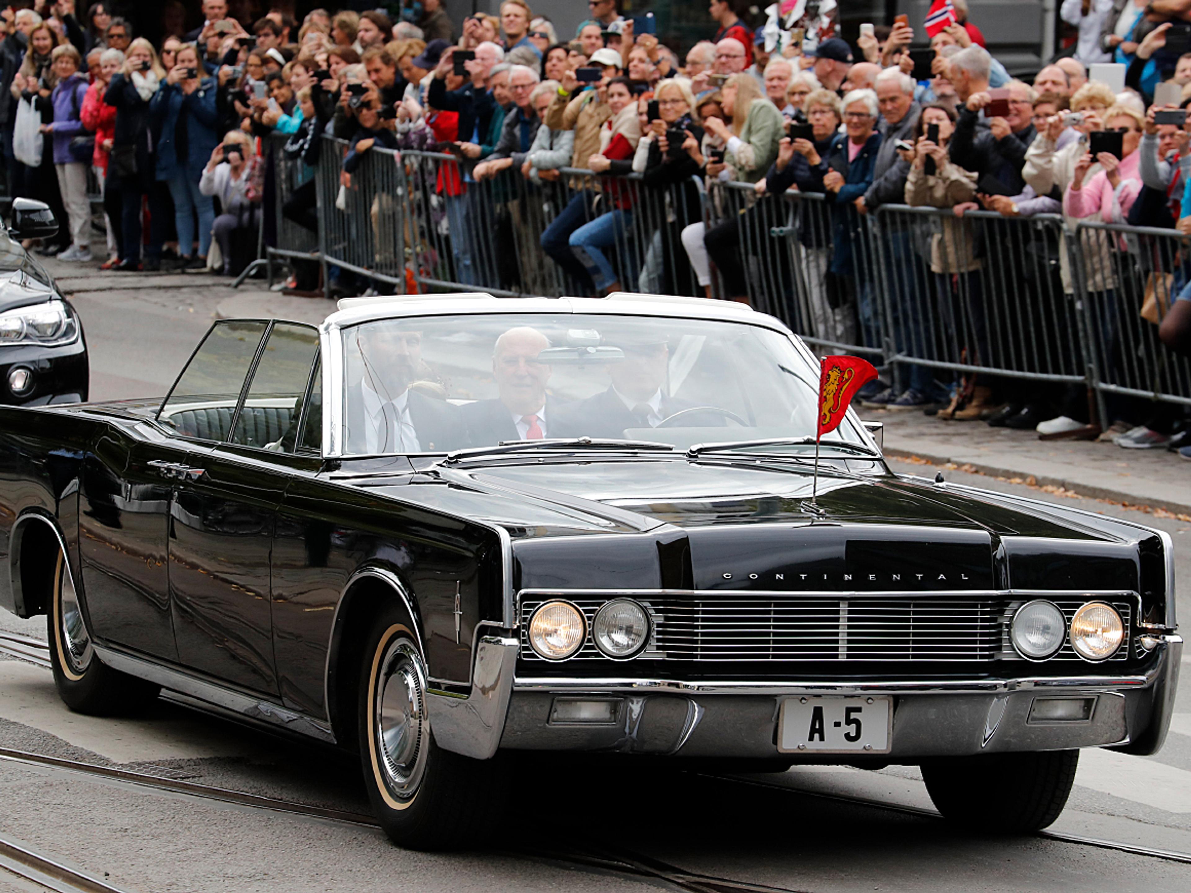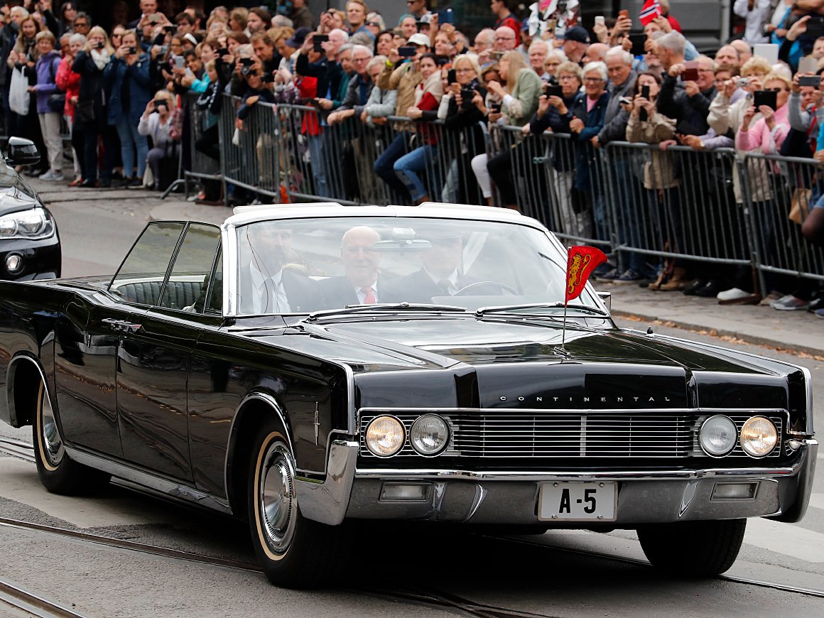 Etter gudstjenesten vendte Kong Harald og Dronning Sonja tilbake til Slottet, også denne gangen i klassiske A5.