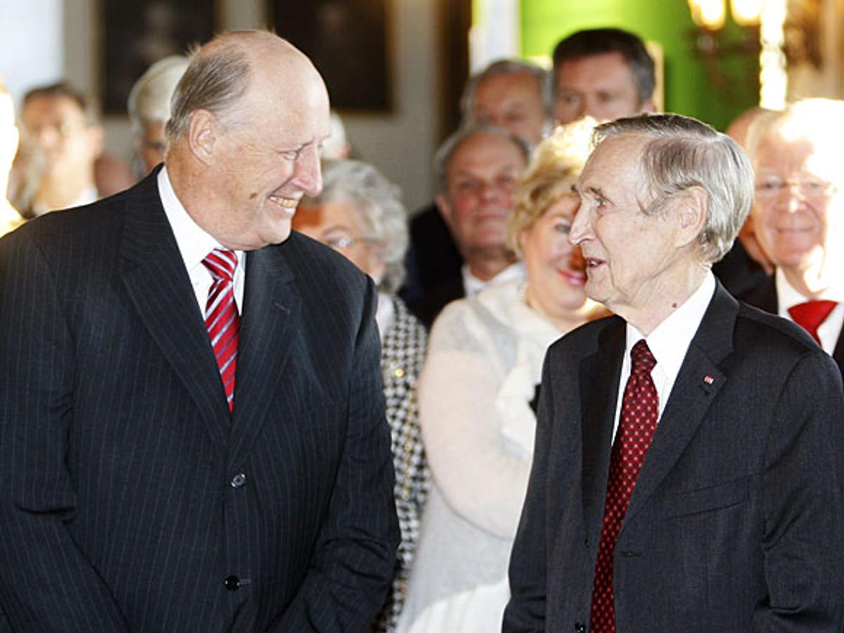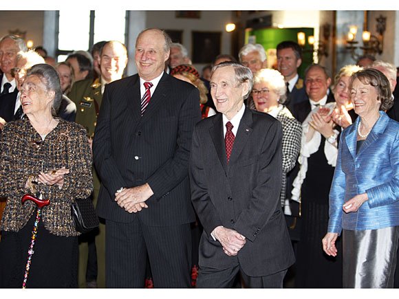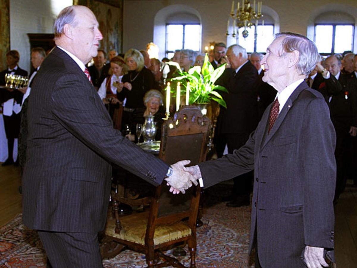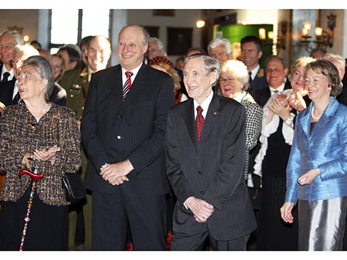 Både H.M. Kongen, H.K.H. Kronprinsen, Prinsesse Raghnild og Prinsesse Astrid var til stede da Gunnar Sønstebys 90-årsdag i dag ble markert med en mottakelse på Akershus slott.
