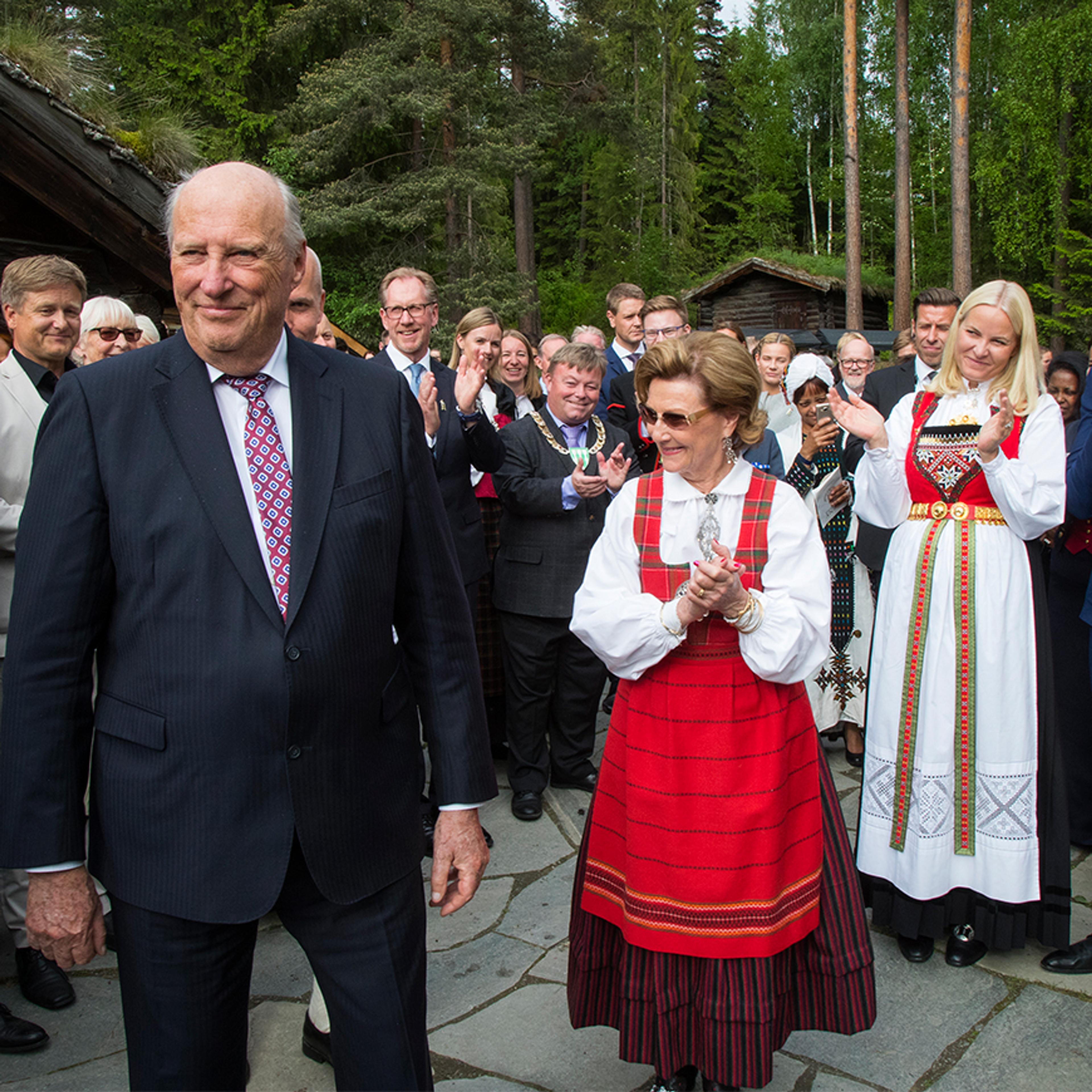 Kongeparet kjenner Maihaugen godt, og besøker Jørstad ofte. Det store friluftsmuseet på Lillehammer rommer 200 bygninger - og det inkluderer huset der Dronning Sonja vokste opp. Et faktum Kong Harald ikke unnlot å kommentere i talen sin i dag: