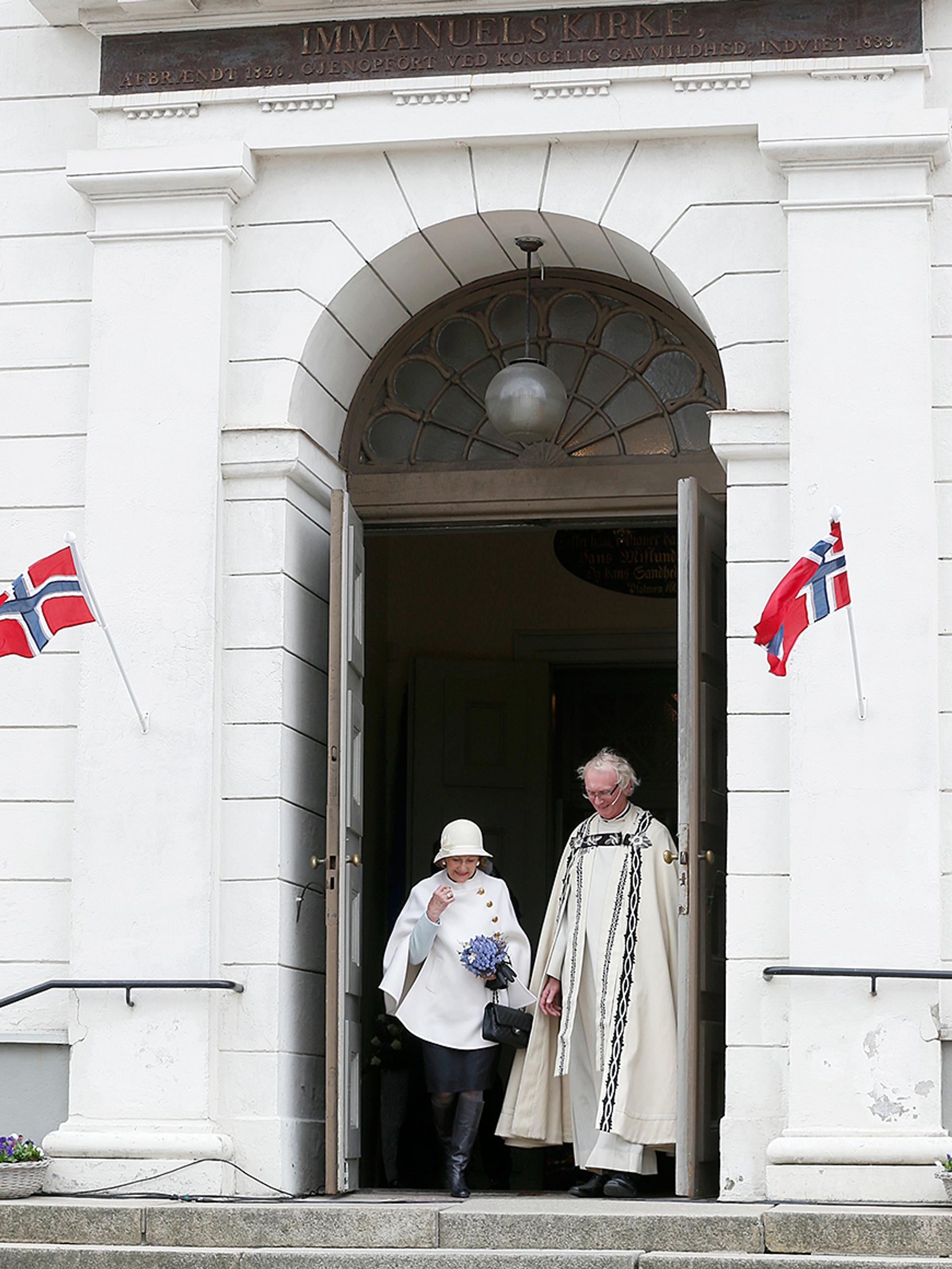Byvåpenet i Halden bærer teksten «Gud med oss». På hebraisk betyr "Immanuel" nettopp "Gud med oss", og det er årsaken til at byens største kirke heter Immanuels Kirke. Hit to Dronningen etter avdukningen, for å være til stede under dagens festgudstjeneste.