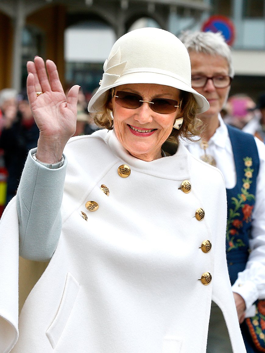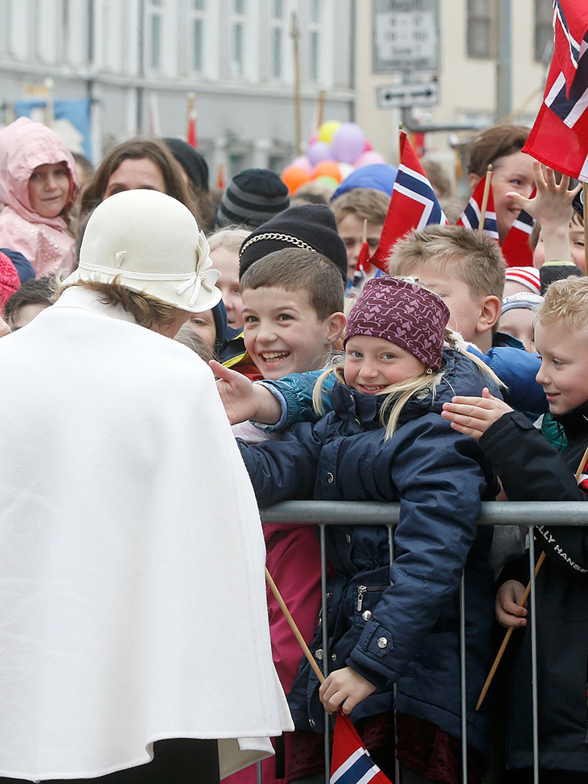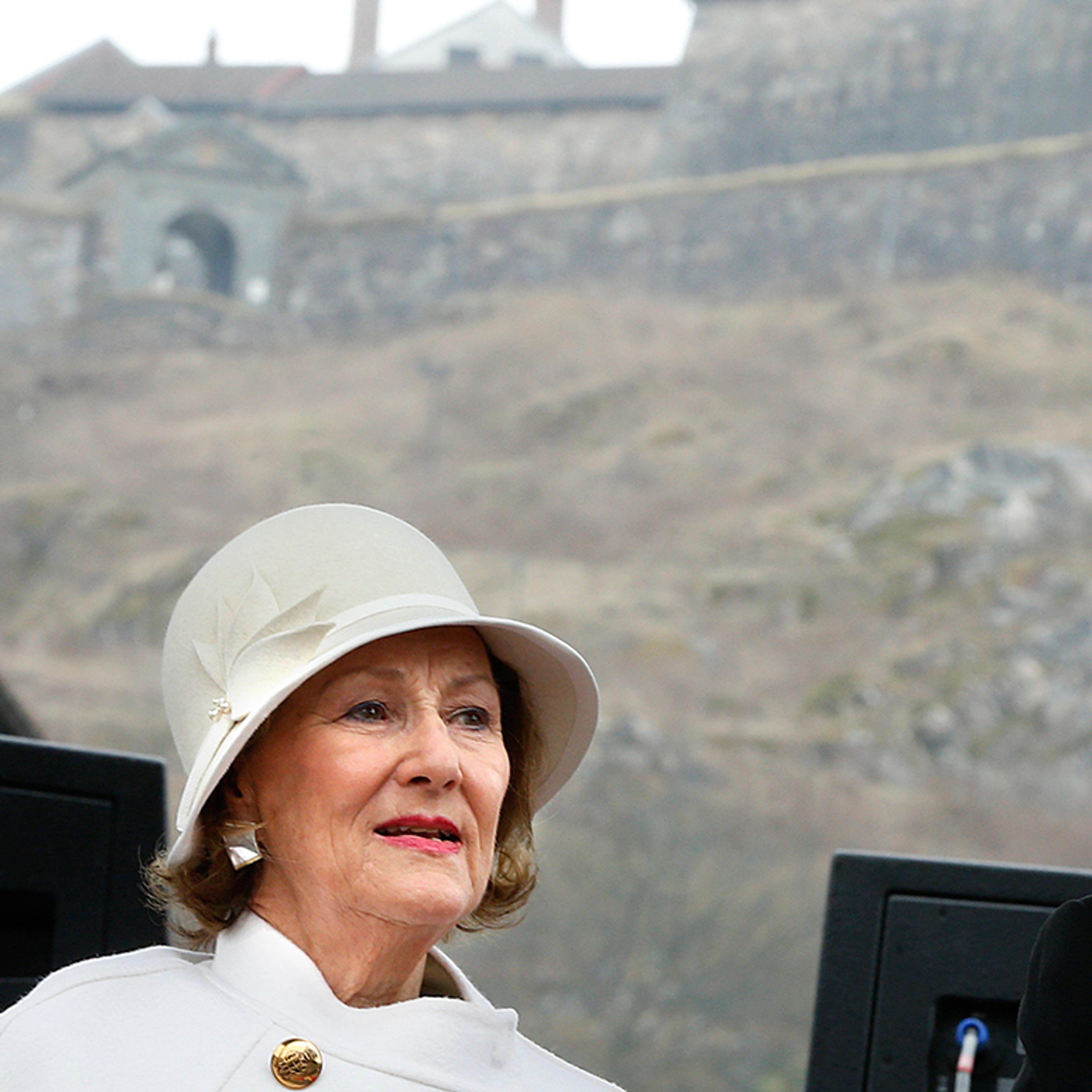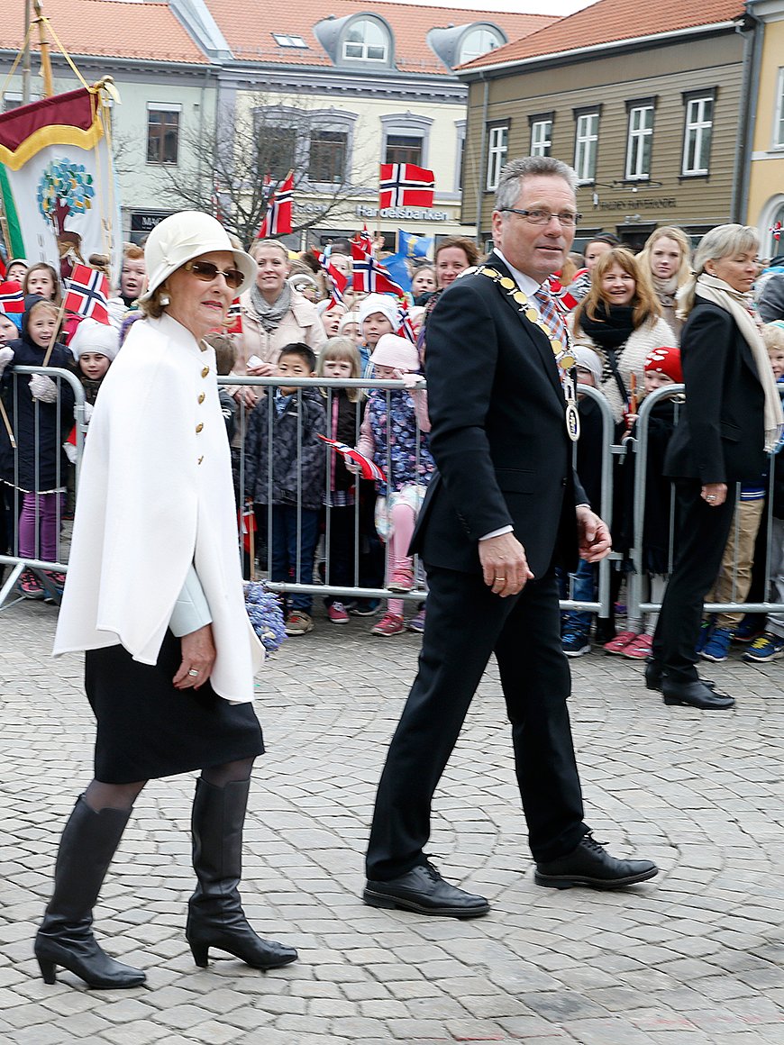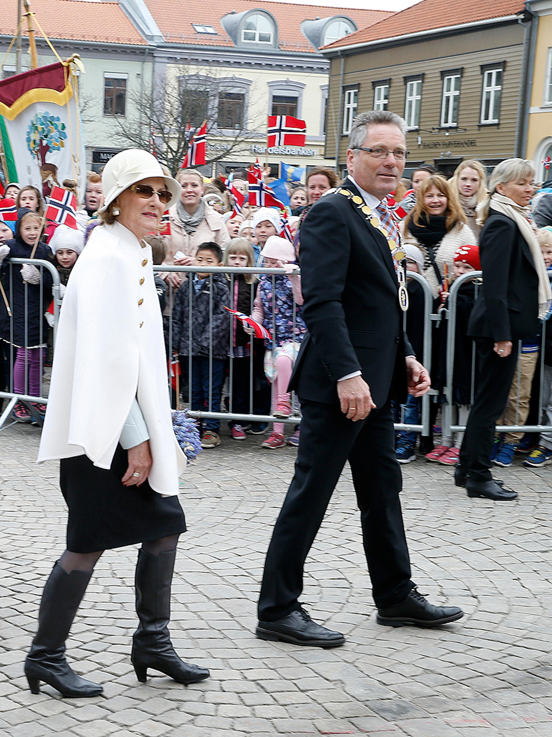 Dronning Sonja fikk blomster fra andreklassingene Julie Fredén Westby og Leon Torpangen da hun ankom torget i Halden i formiddag. Barnetoget marsjerte, og både musikkorpset og kulturskolen underholdt. Nasjonalsangen og Kongesangen ble sunget før Gaute Jacobsen, direktør for Halden Historiske Samlinger, fortalte om byprivilegiet.
