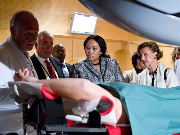 Dronning Sonja og fru Zuma besøkte òg kreftavdelinga, der dei fekk ei innføring i arbeidet, og professor Kjell Magne Tveit demonstrerte korleis strålebehandling av ein pasient skjer i praksis.