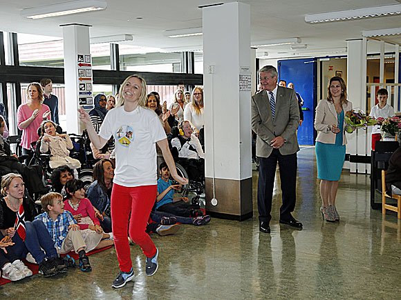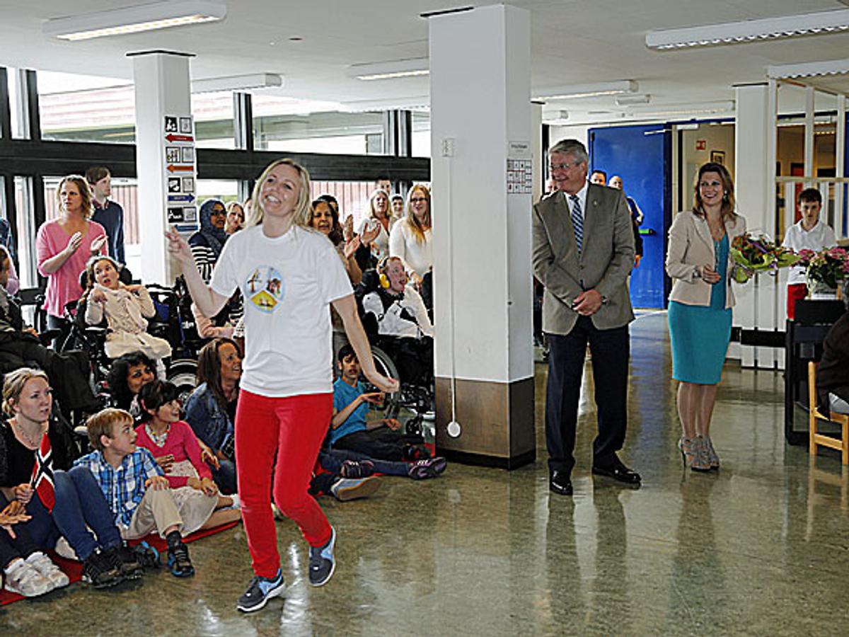 I ankomsthallen underholdt skolens kor før en elev ledsaget Prinsessen til trappeoppgangen hvor et nylaget kunstverk med elevers håndtrykk i mange farger ble vist fram.