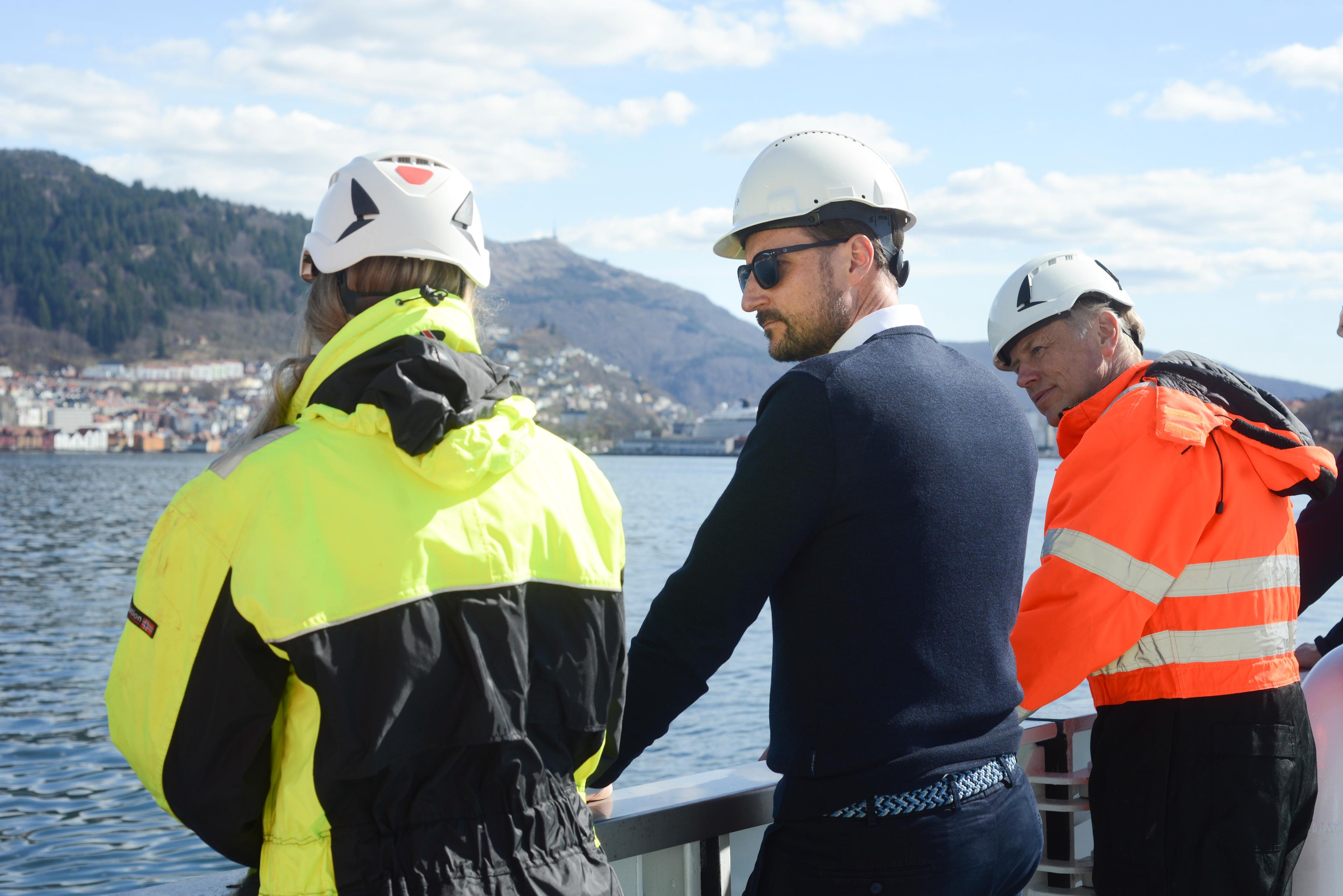 Dagen i Bergen ble rundet av ombord i forskningsfartøyet Prinsesse Ingrid Alexandra hvor Kronprinsen var med Havforskningsinstituttet på forskningstokt i byfjorden. Kronprinsen ble tatt imot på skipet av kaptein Rune Kleppe og forsker Bjørn Einar Grøsvik.