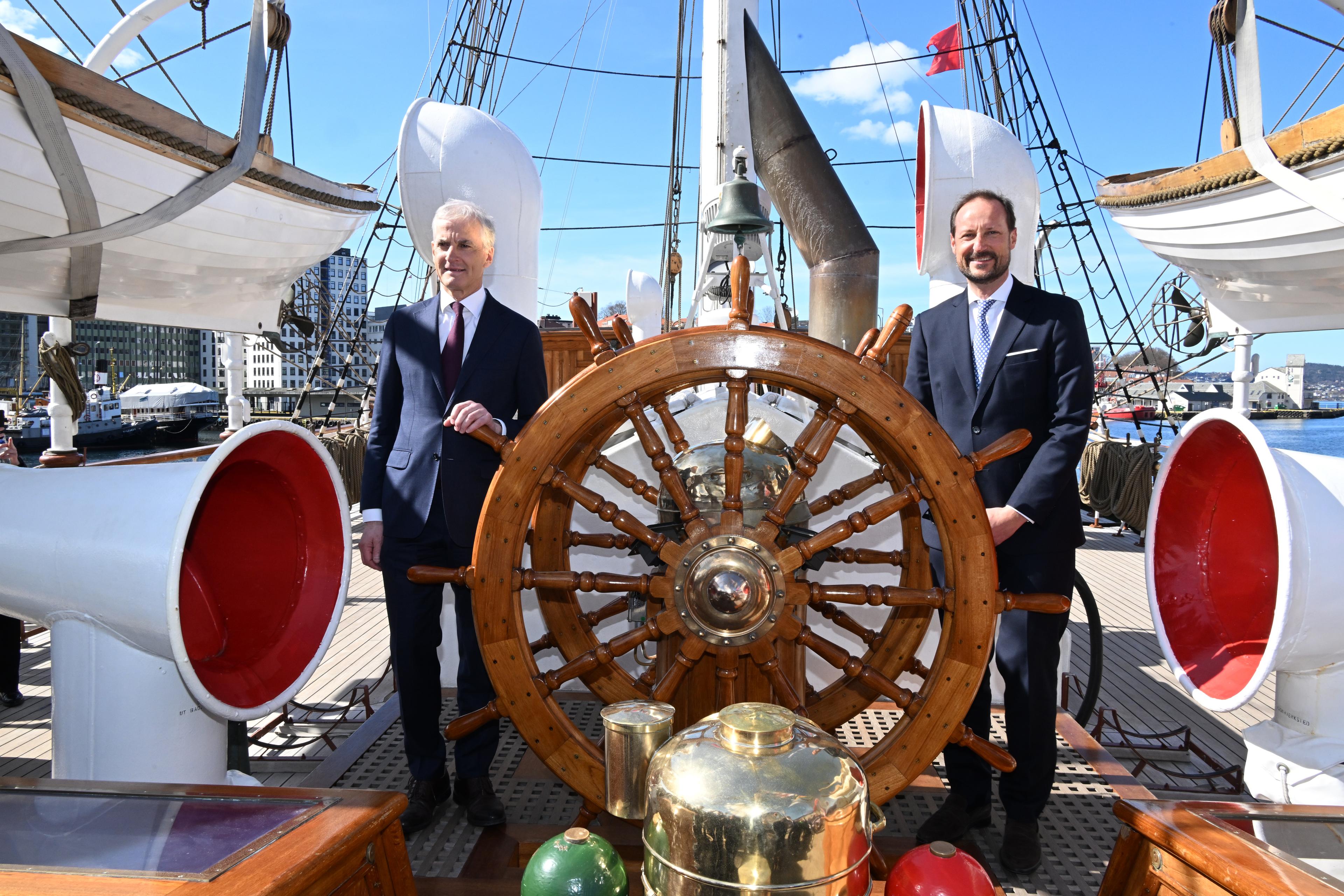 Om bord i Statsraad Lehmkuhl som vendte tilbake til Bergen etter 20 måneders seilas i helgen, var Kronprinsen til stede under en lunsj og samtale med blant andre biologen Sylvia Earle og klima- og miljøminister Espen Barth Eide i anledning regjeringens havkonferanse.