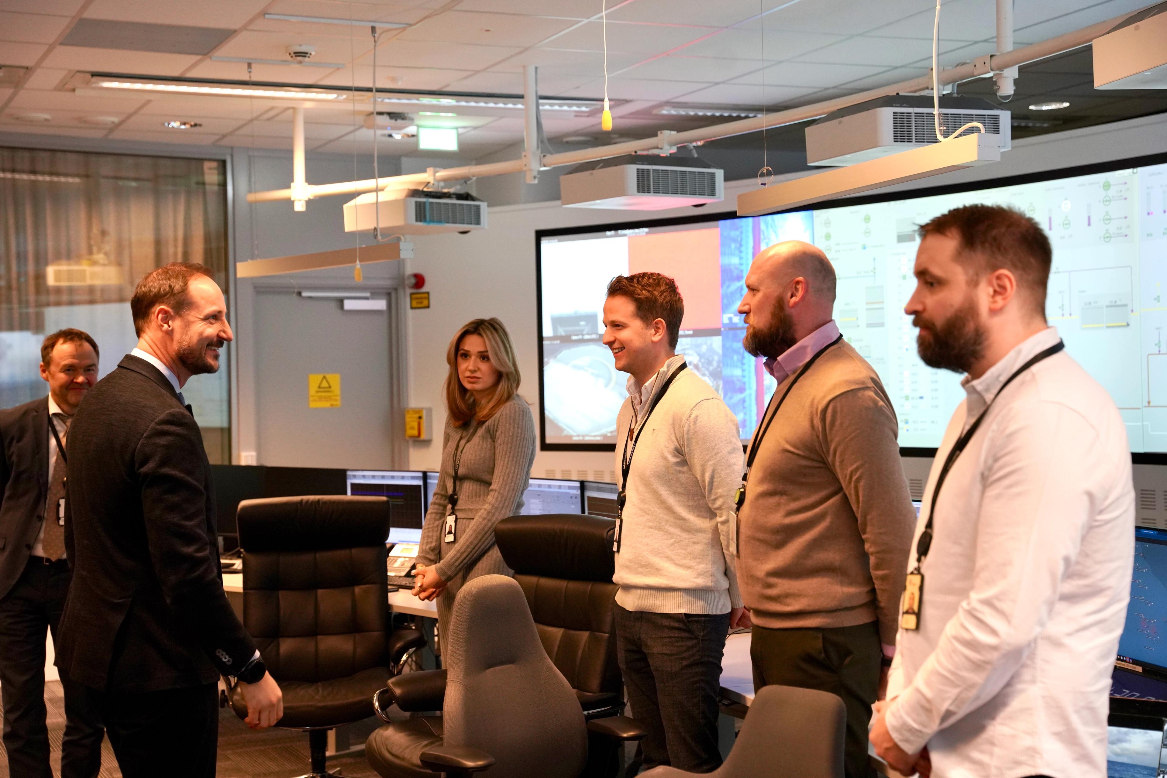 Under besøket til Equinor fikk Kronprinsen også en omvisning og orientering i kontrollrommet for Hywind Tampen - verdens største flytende havvindpark som blant annet forsyner olje- og gassprodusenter i Nordsjøen med elektrisk kraft for å kutte CO2-utslipp. Kronprinsen var til stede under den offisielle åpningen av Hywind Tampen på Gullfaks C-plattformen i fjor.