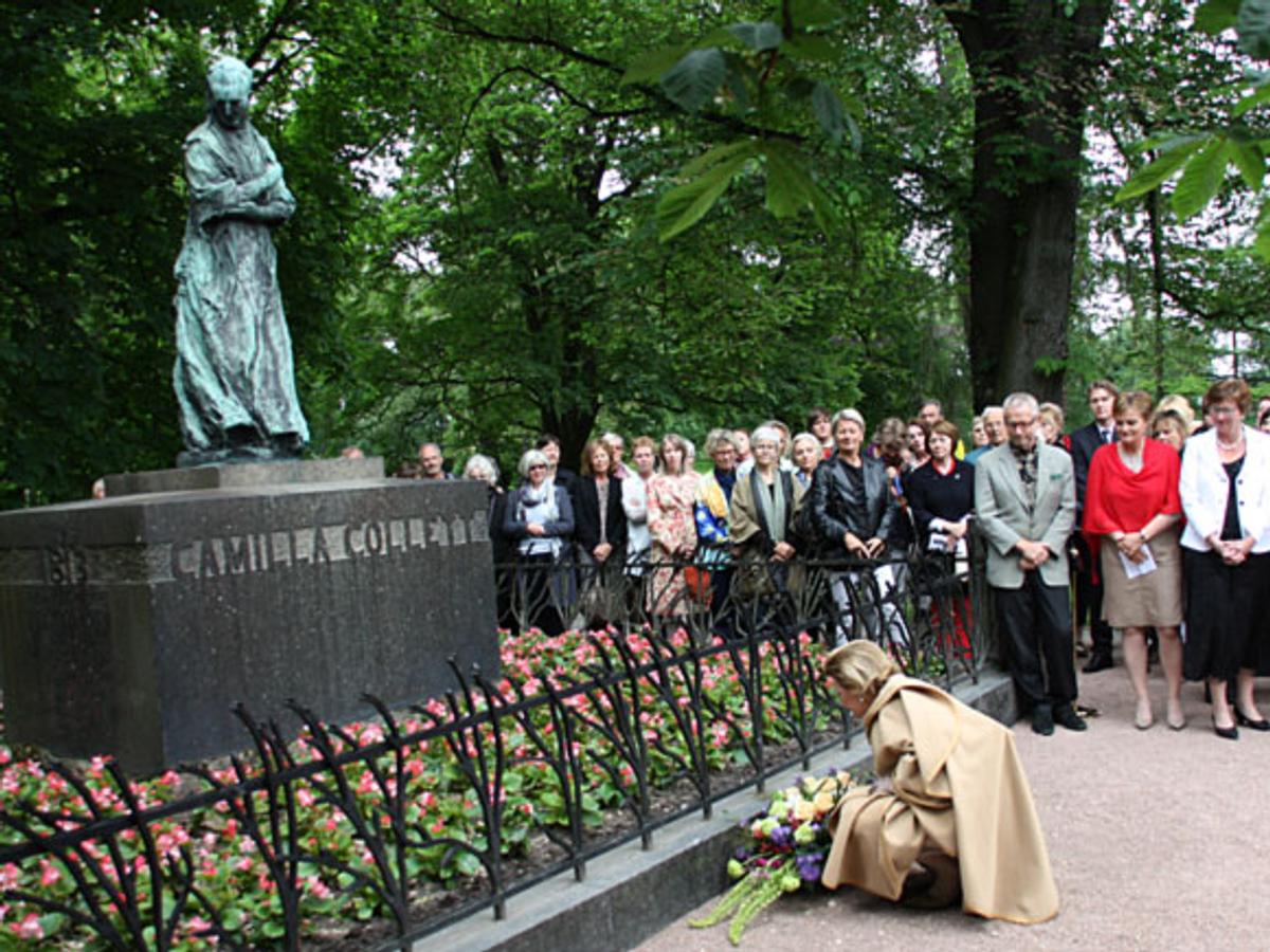 Etter forestillingen fortsatte arrangementet ved Camilla Collett-statuen i Slottsparken, der Dronningen la ned blomster.