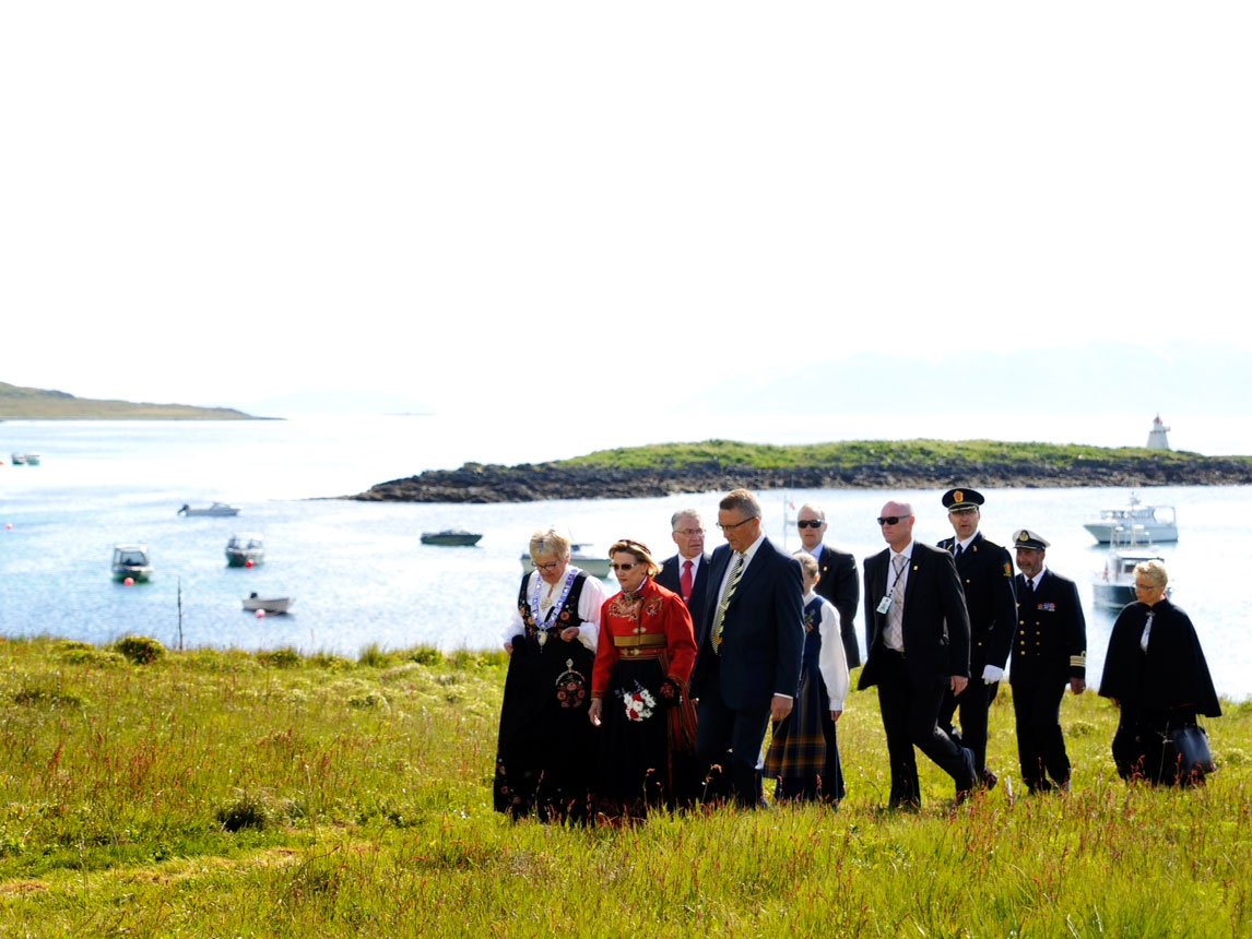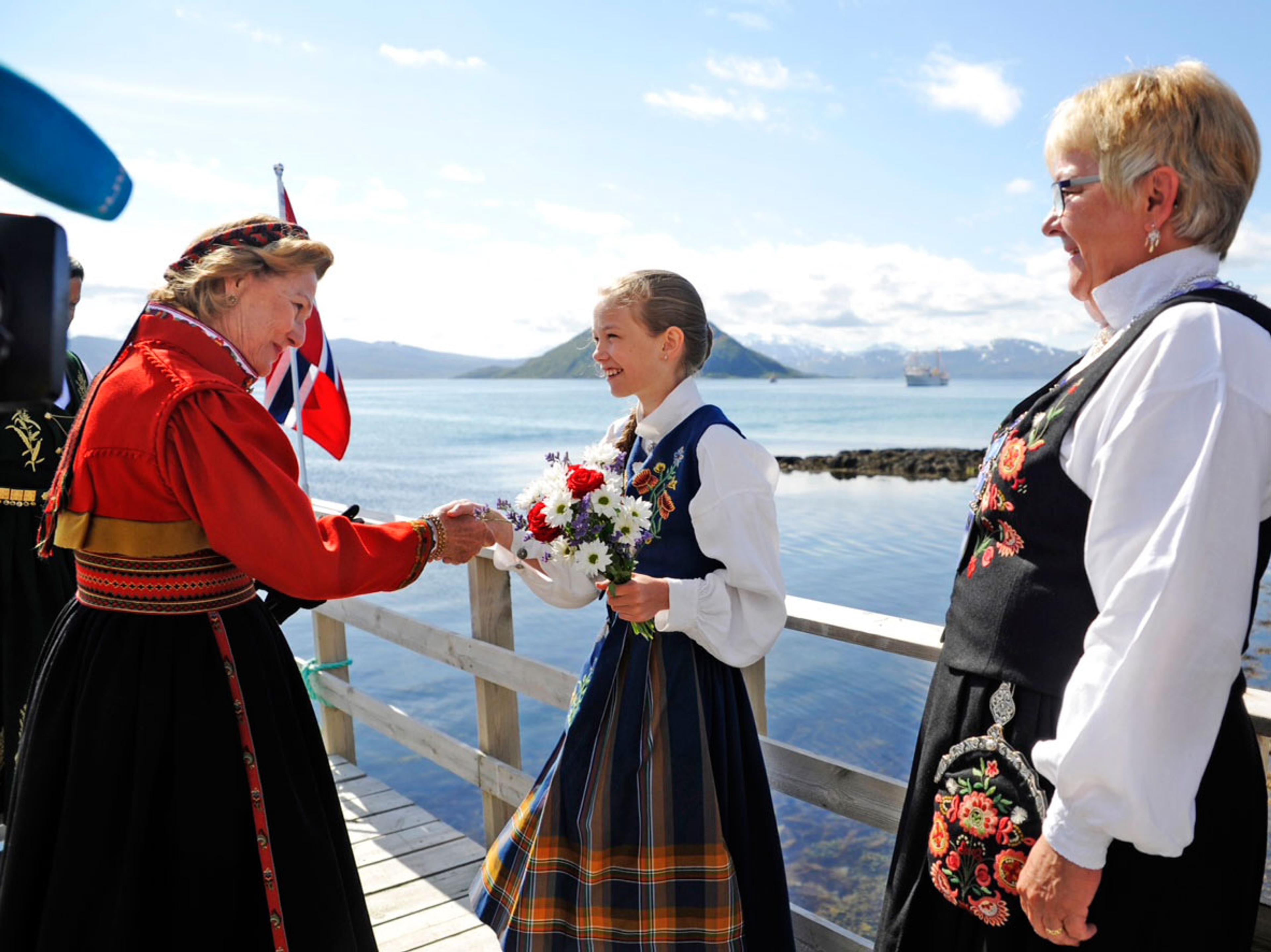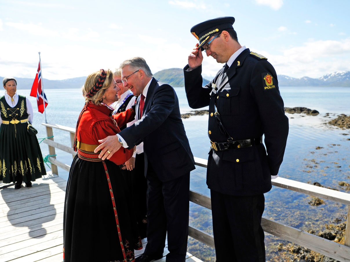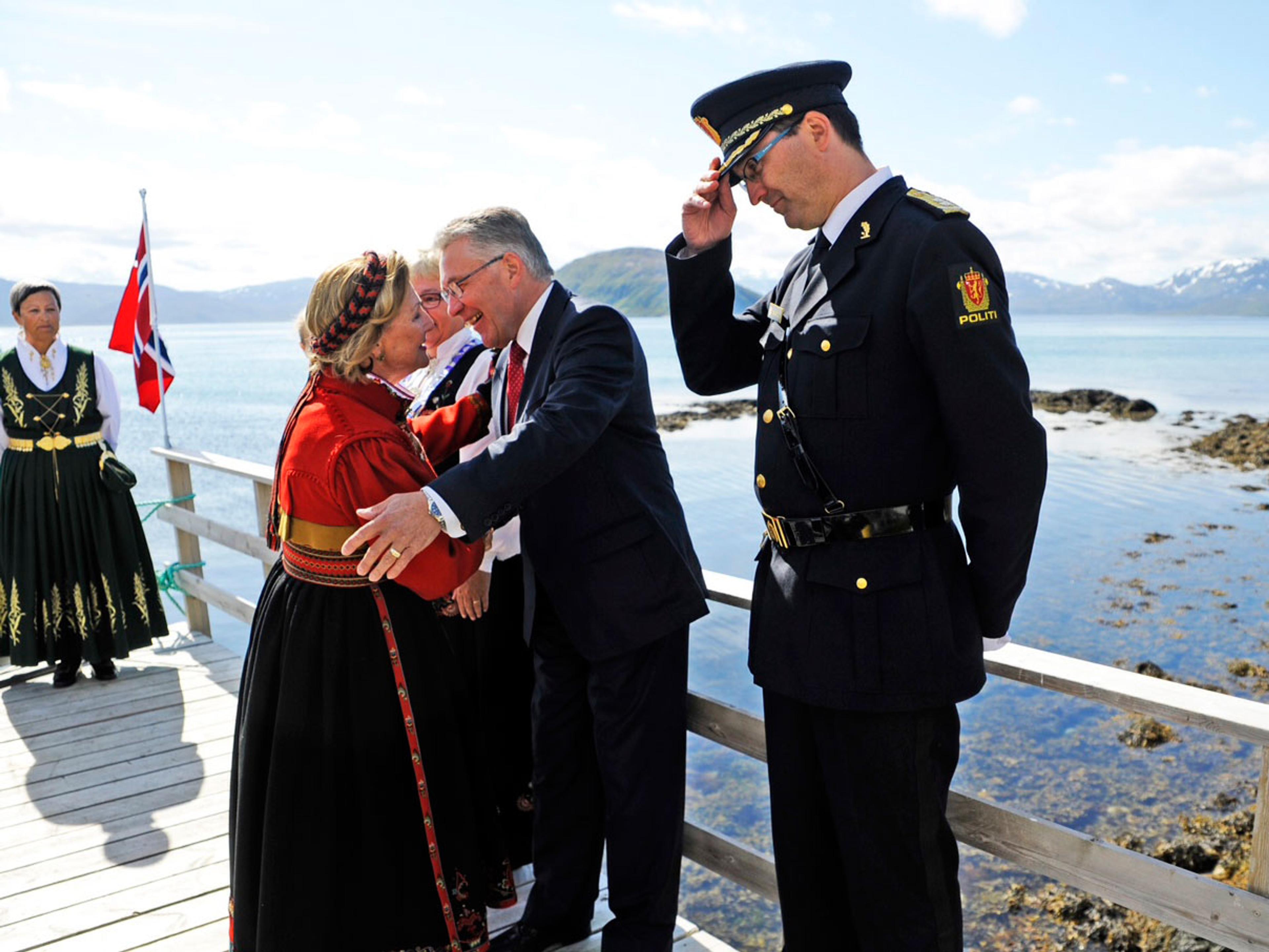 Dronninga kom til Helgøya i Karlsøy kommune med Kongeskipet «Norge» og helsa blant anna på Jim Mølnes, eldsjel bak restaureringa.