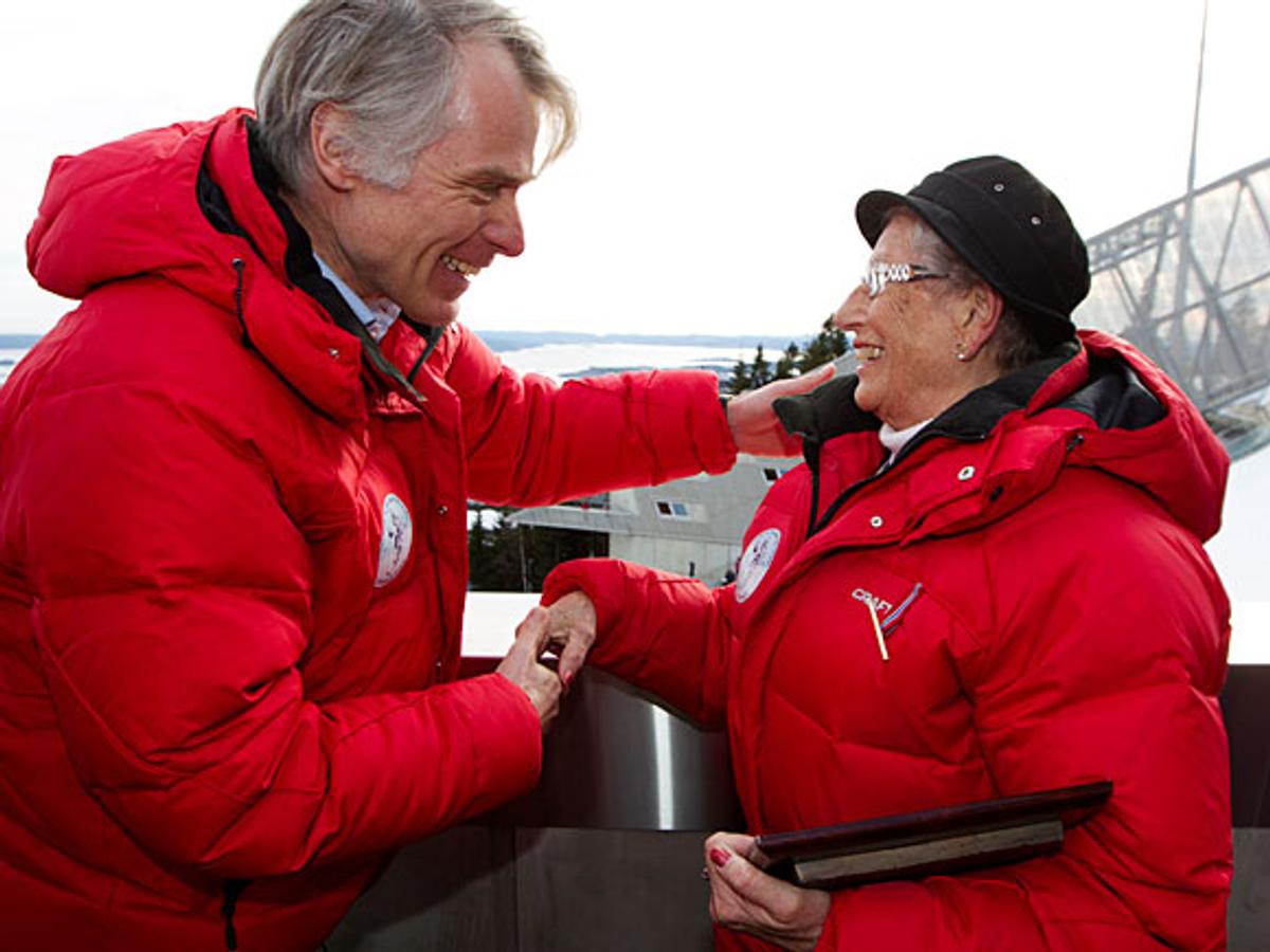 Prinsesse Astrid, fru Ferner ble tildelt Birkebeinerplaketten - Skiforeningens høyeste utmerkelse - i pausen mellom omgangene i hopprennet i dag. Skiforeningens styreleder begrunnet tildelingen slik under overrekkelsen i dag: