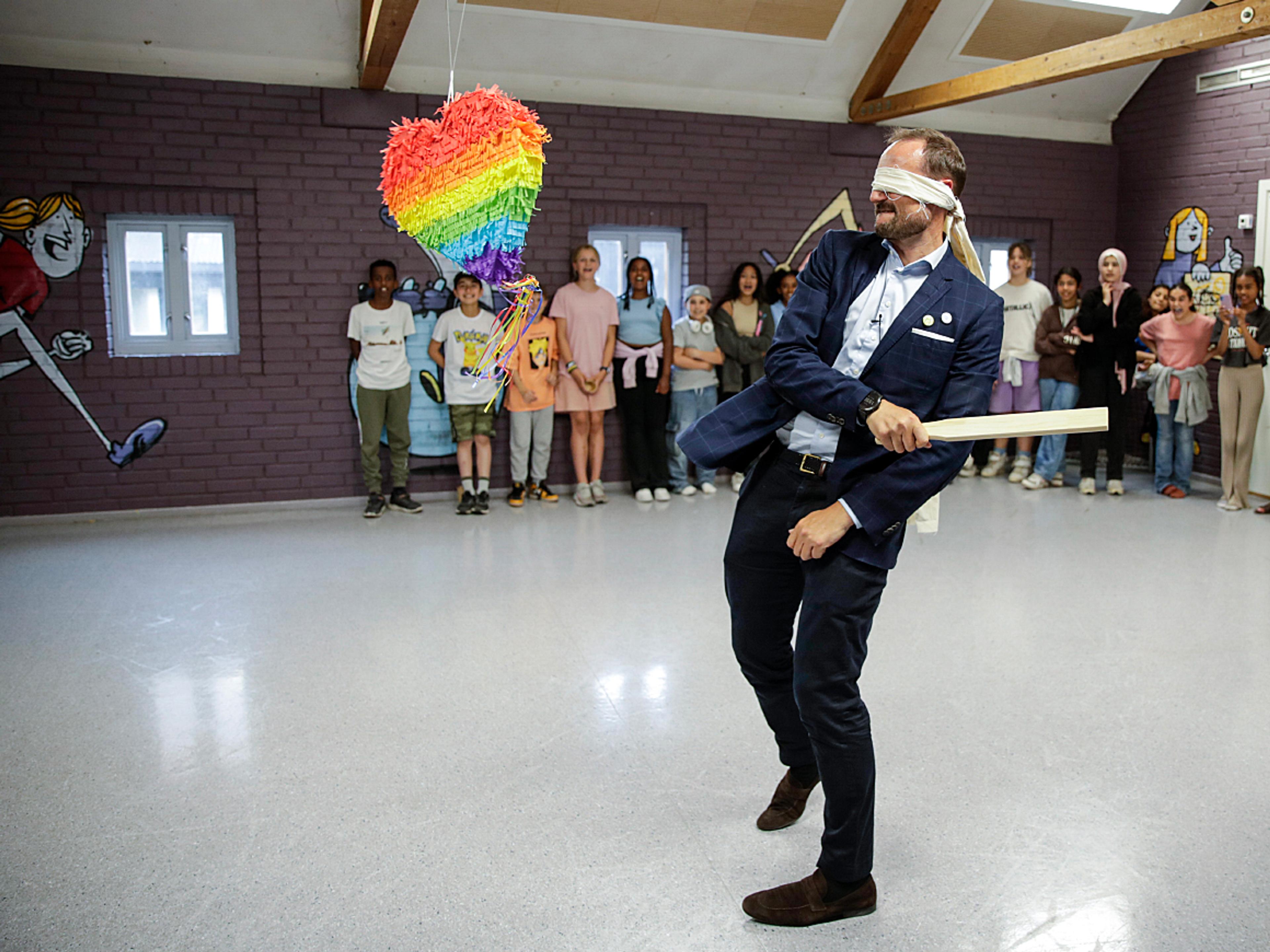 Gjestene besøkte både diskorommet, hobbyrommet, kjøkkenet og musikkrommet. I gymsalen var det hengt opp en piñata med bursdagsgodteri, og Kronprinsen fikk æren av å gjøre de første forsøkene på å knuse den.