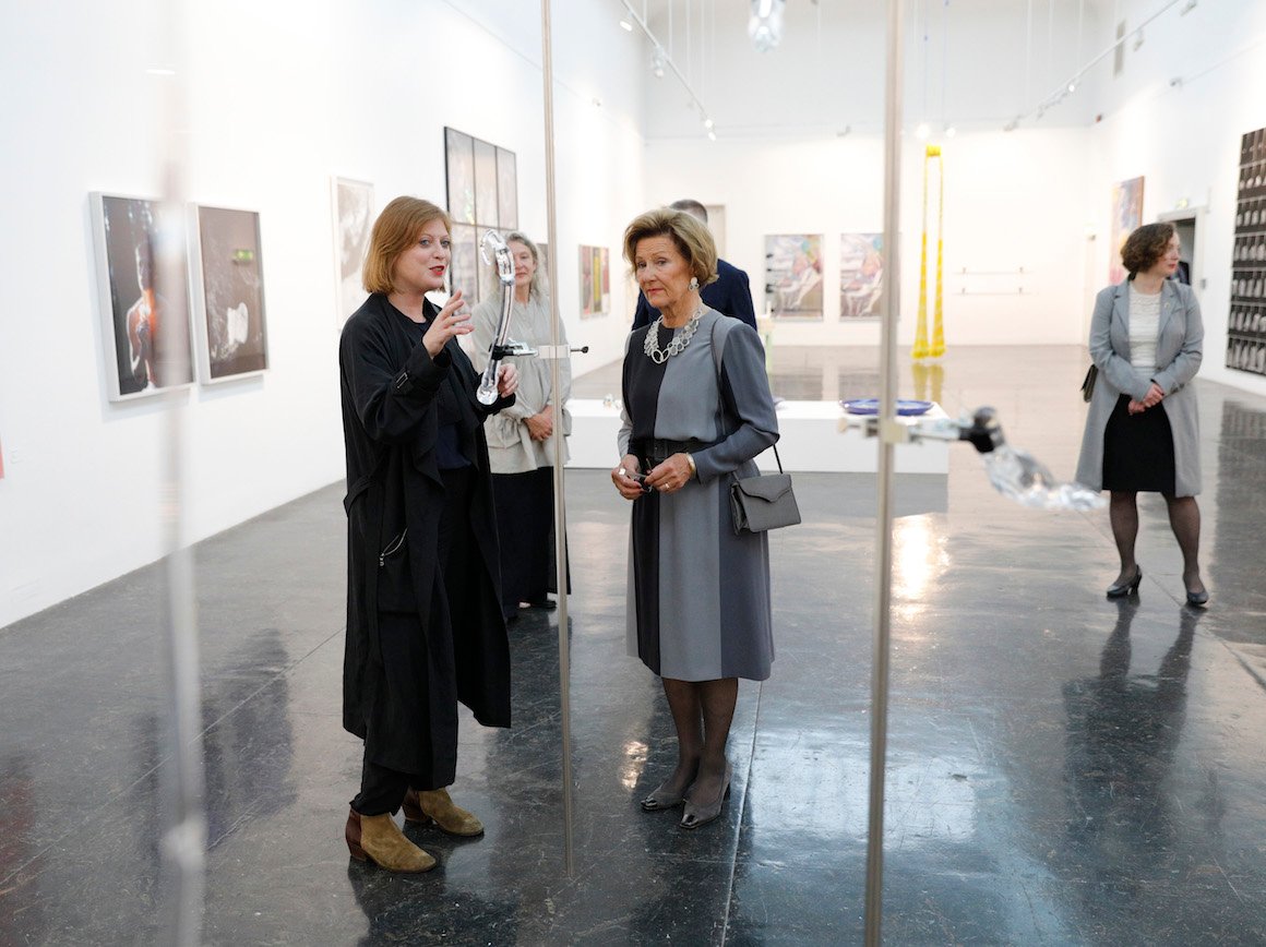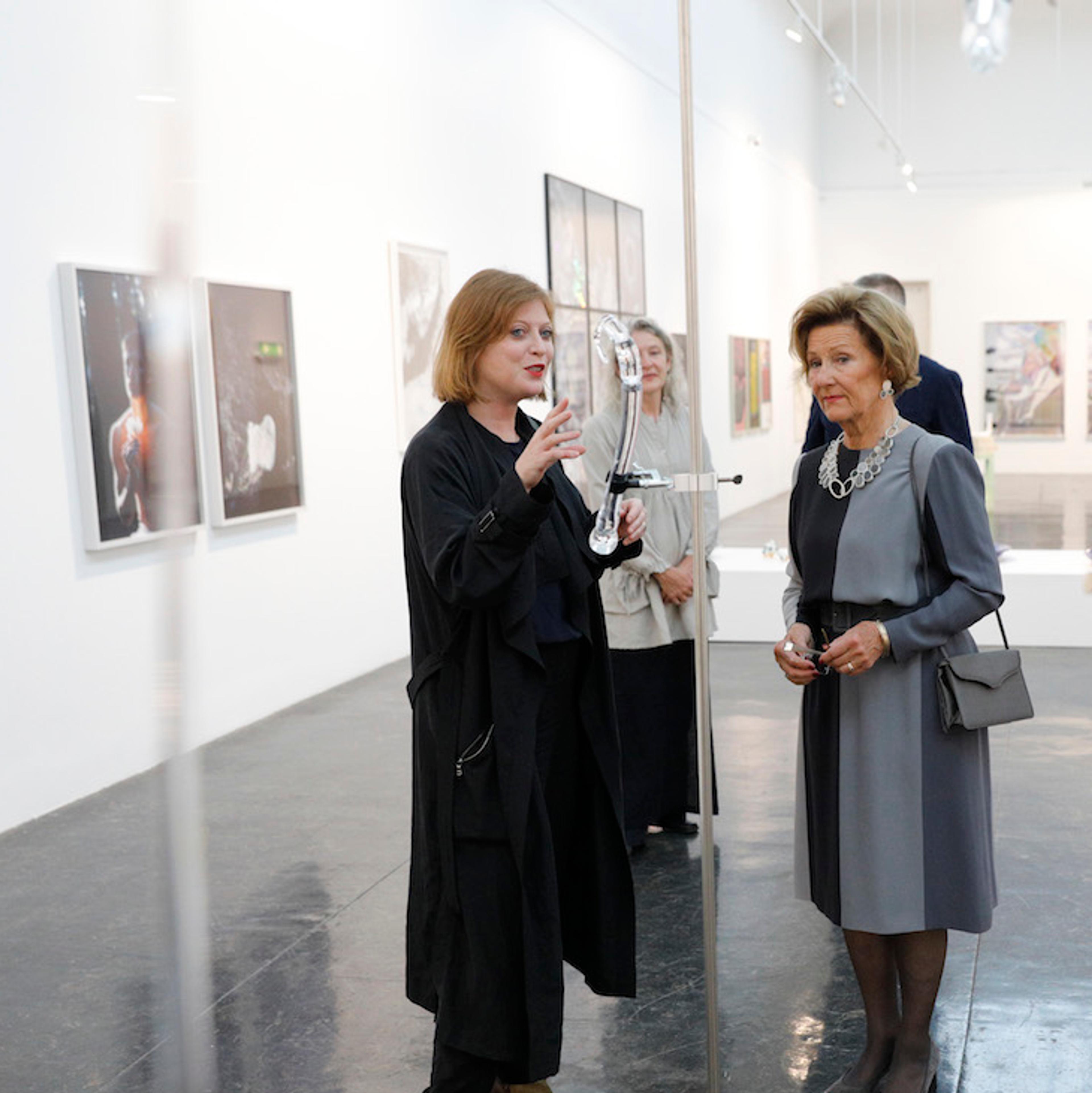 Like etter ankomst fikk vår kunstinteresserte Dronning en omvisning i årets utstilling. Underveis fikk hun hun møte årets nasjonale jury, og samtalen dreide seg naturlig nok om årets kunstnere og verk. Dronnign Sonja var til stede under åpningsarrangementet som fulgte, sammen med blant annet kulturminister Linda Cathrine Hofstad Helleland.