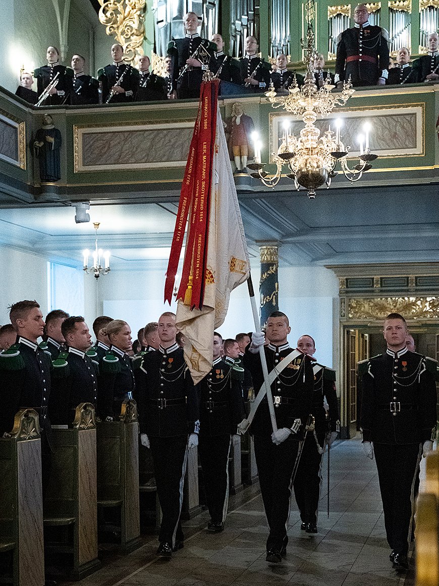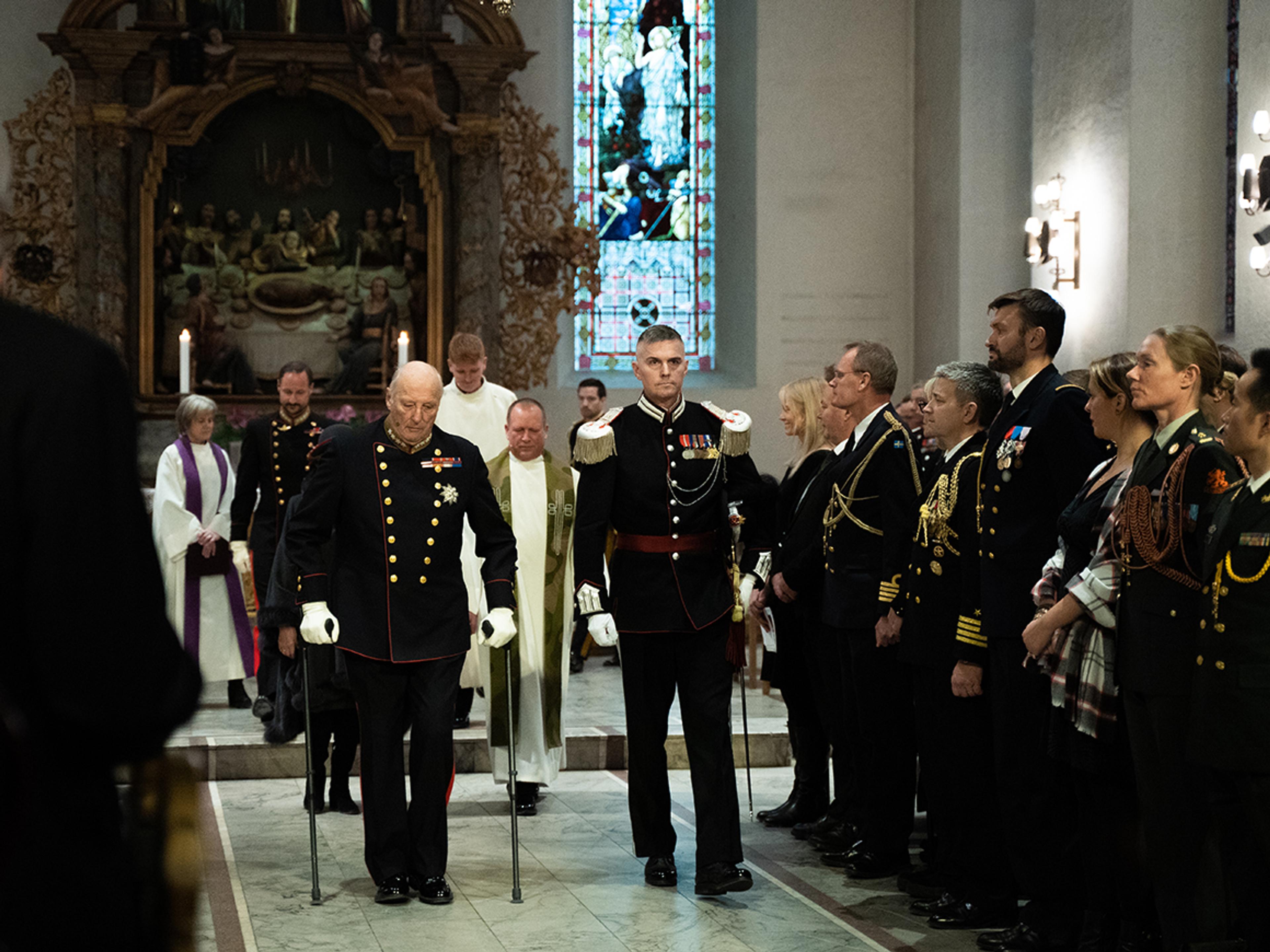 Dette var første gang Hennes Majestet Dronning Sonja var til stede under den tradisjonsrike gudstjenesten. Gardesjef oberstløytnant Trond Robert Forbregd ledsaget Kongeparet og Kronprins Haakon inn i domkirken, og fanen ble ført frem.
