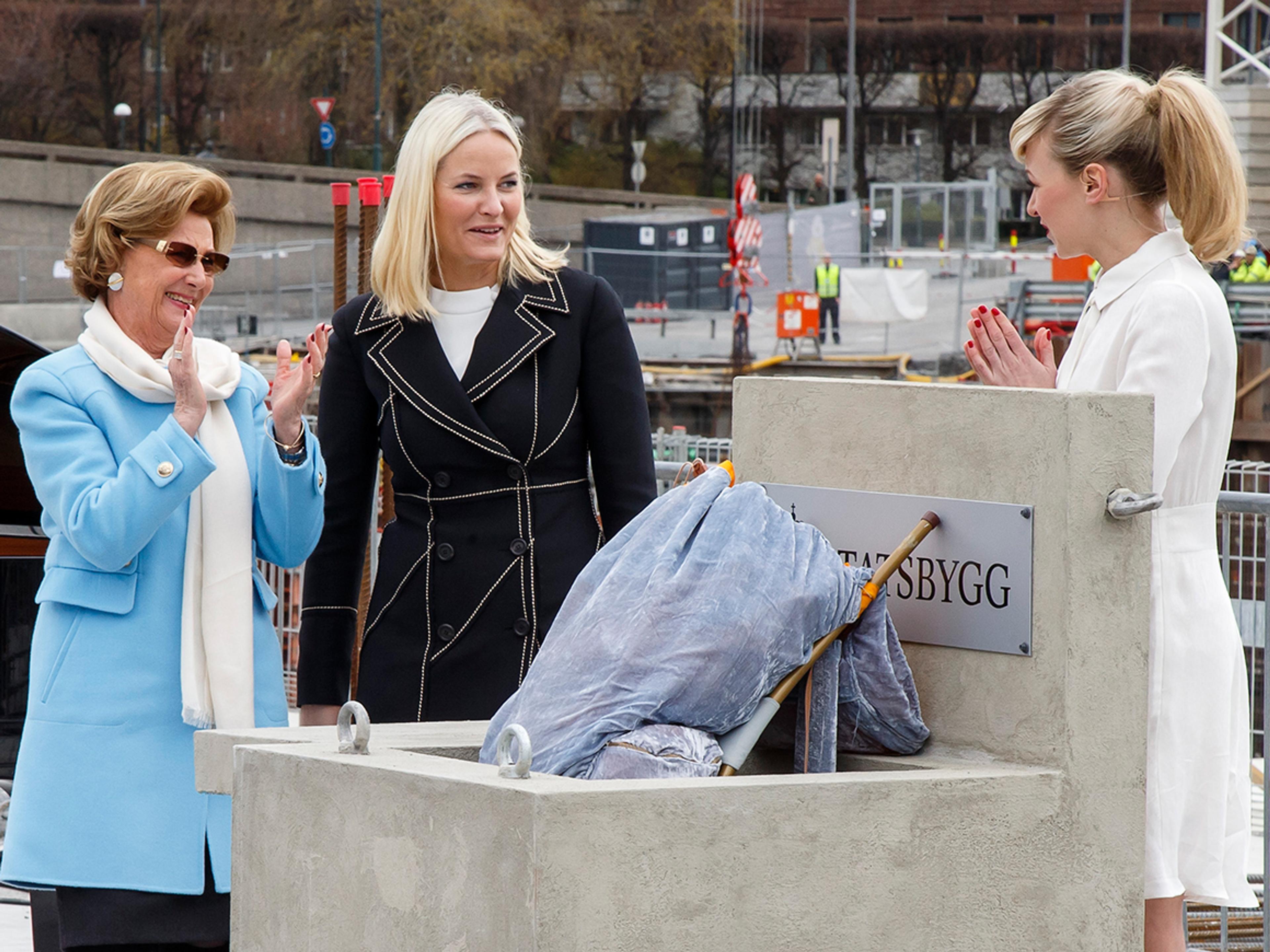 Sammen la Dronningen og Kronprinsessen ned grunnsteinsskrinet. Skrinet inneholder et fargetrykk av Norges riksvåpen, tegninger av bygget, byggedokumenter, et årssett av mynter, et årssett av frimerker, invitasjonen og gjestelisten for grunnsteinsnedleggelsen. Med skrinet i en sekk, ble performancekunstneren Tori Wrånes heist opp av en kran og fraktet inn over byggeplassen der steinen skulle legges ned. Levende musikk og salutt fra båter ved havna ga en mesterlig ramme rundt arrangementet.