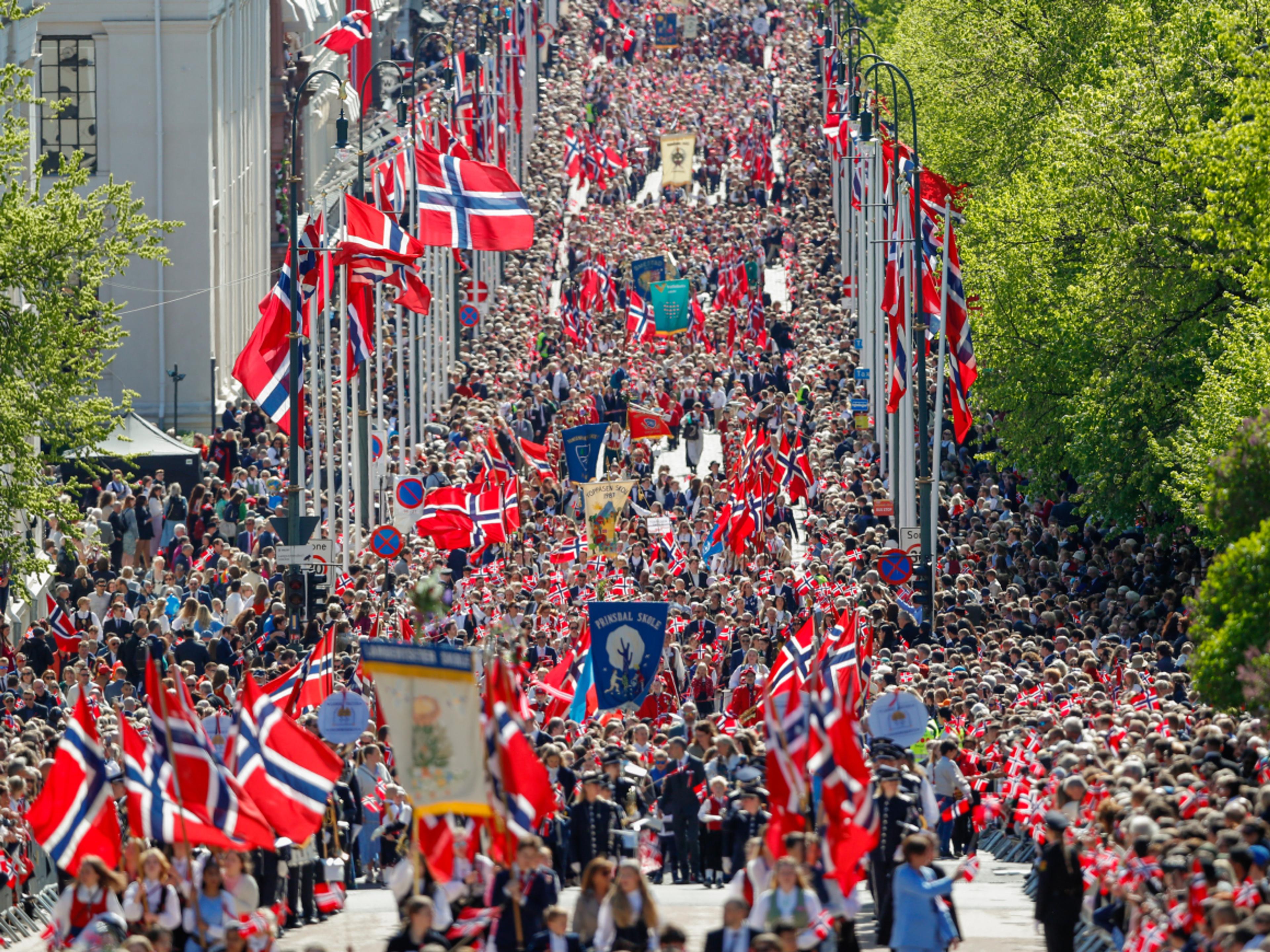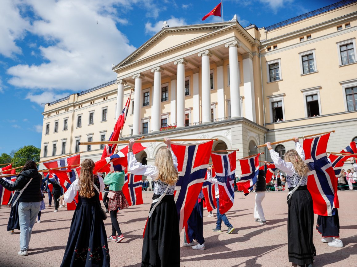 1906: Kong Haakon og Dronning Maud innstifter skikken med å hilse barnetoget i Oslo fra Slottsbalkongen.