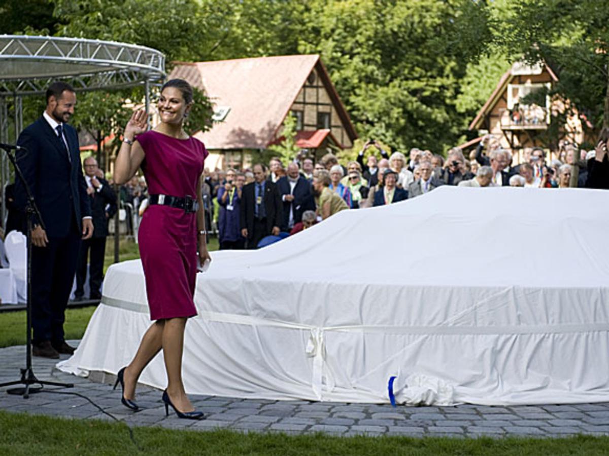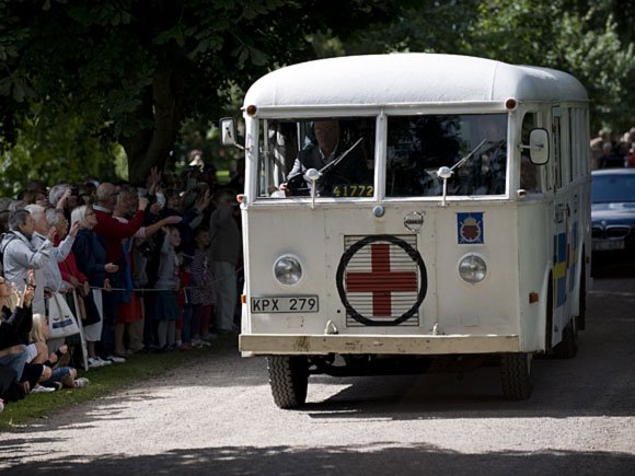 Kronprins Haakon og Kronprinsesse Victoria kom til seremoniplassen ved Ramlösa Brunnspark i en av de originale hvite bussene.