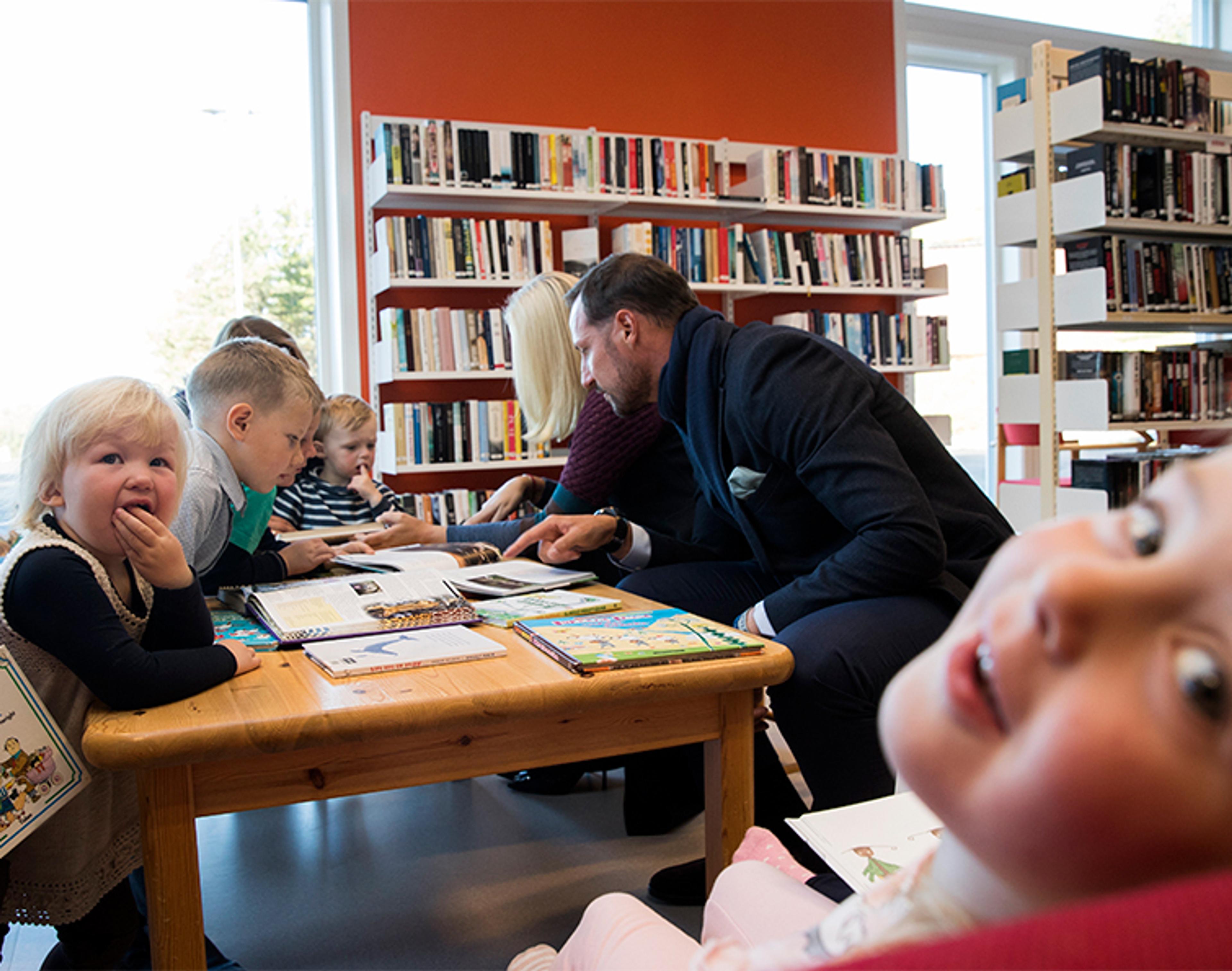 Aller først gikk turen til Fyret flerbrukshus, der 1. og 2. klassinger fra kulturskolens samspillgruppe opptrådte med sang og spill, lek og rytme i foajeen. Inne i biblioteket satte Kronprins Haakon og Kronprinsesse Mette-Marit seg ned med en gruppe barn fra Jøa barnehage. De så på bøker sammen, og Kronprinsparet fikk de høre litt om hvordan barna har det i barnehagen sin, og om ting de liker å gjøre.