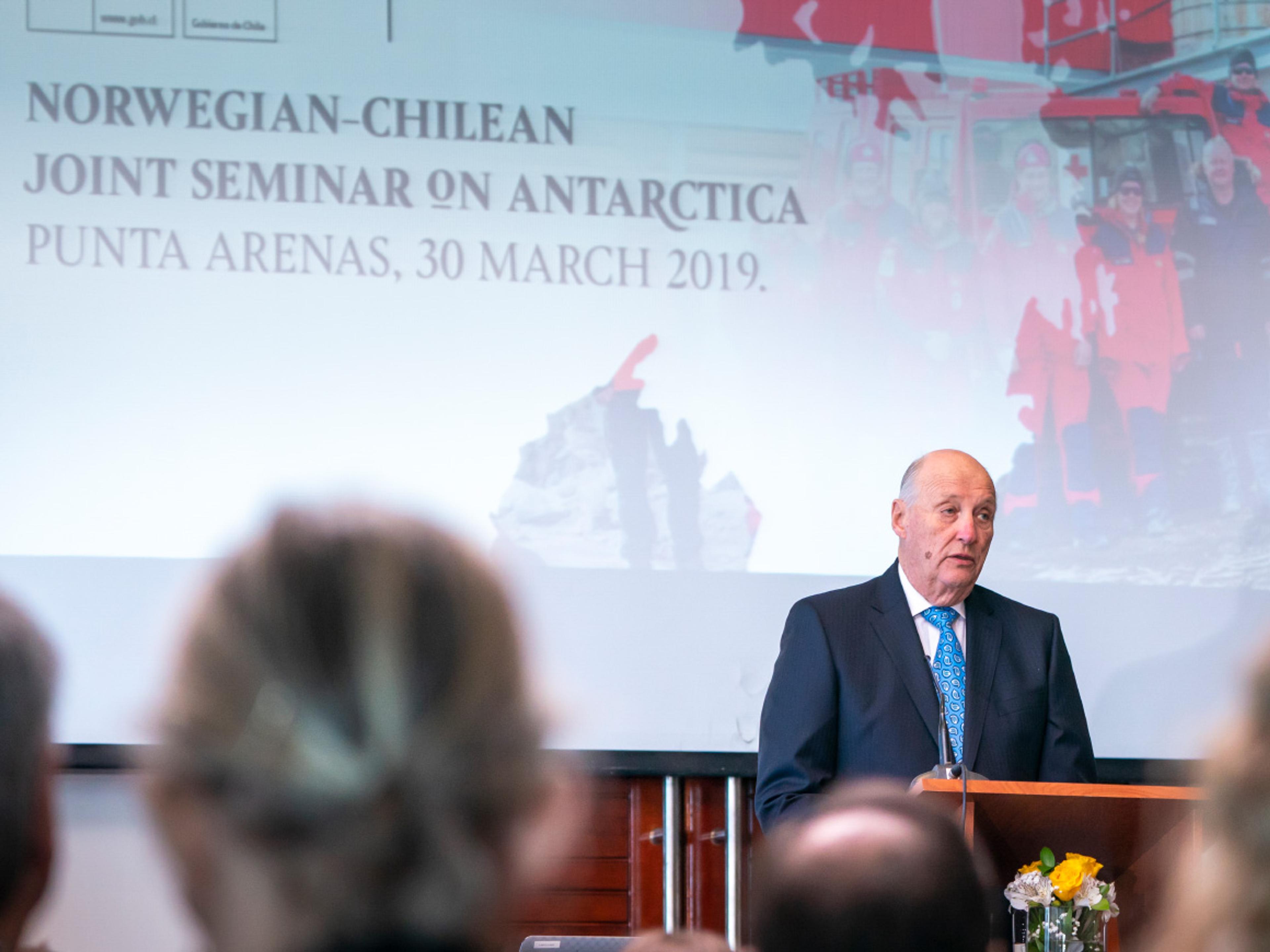 Norge og Chile har både felles interesser og historie i Antarktis. Dagens seminar tok opp viktige spørsmål som klimaendringer, bærekraftig forvaltning og vern. Kong Harald åpnet seminaret. Havet kan bidra med både mat og energi til jordens voksende befolkning - forutsetningen er at vi forvalter ressursene på en bærekraftig måte, påpekte Kongen.