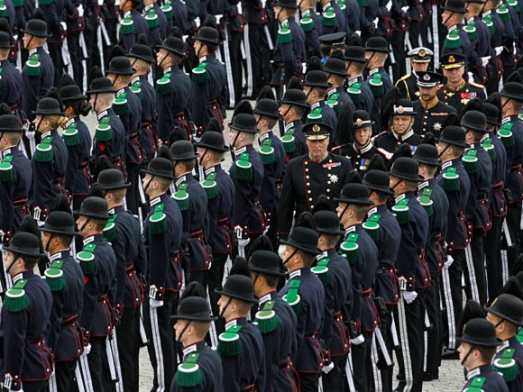 800 mann sto oppstilt i paradeuniform da Hans Majestet Kongen og Hans Kongelige Høyhet Kronprins Haakon inspiserte Garden på Huseby leir i Oslo i dag.