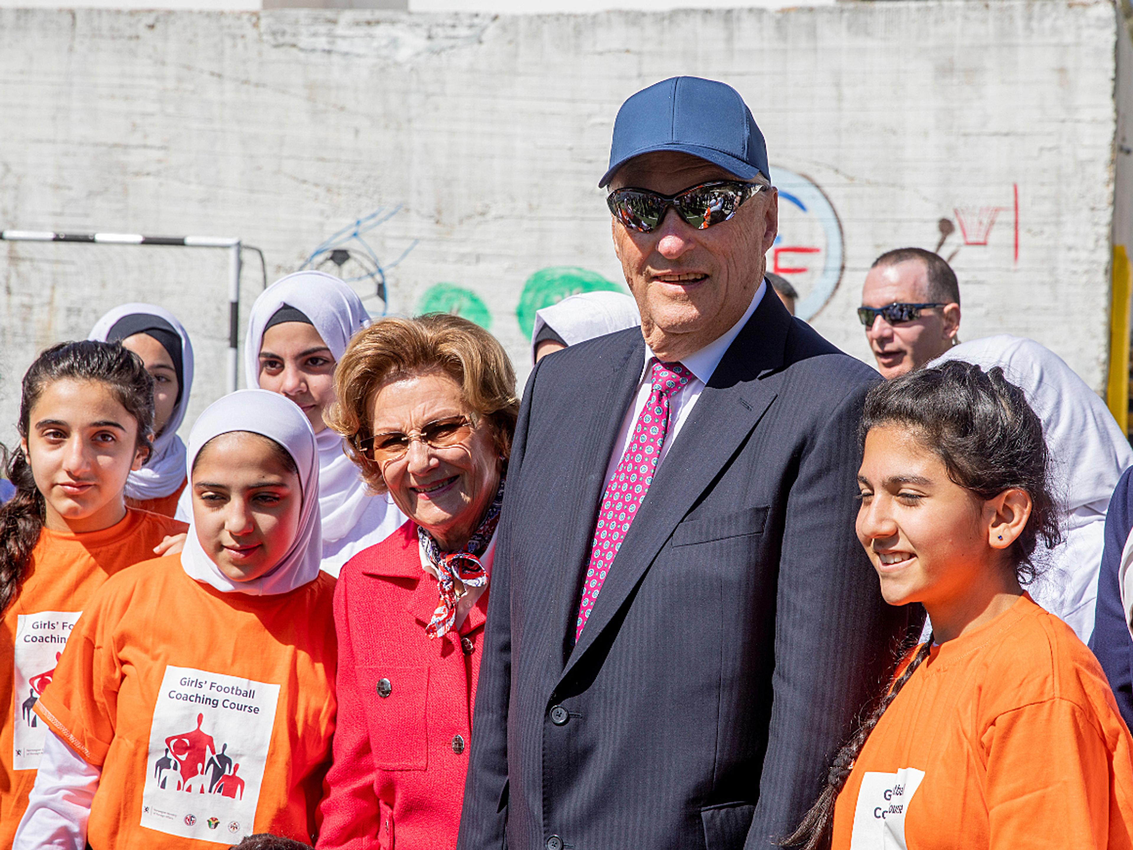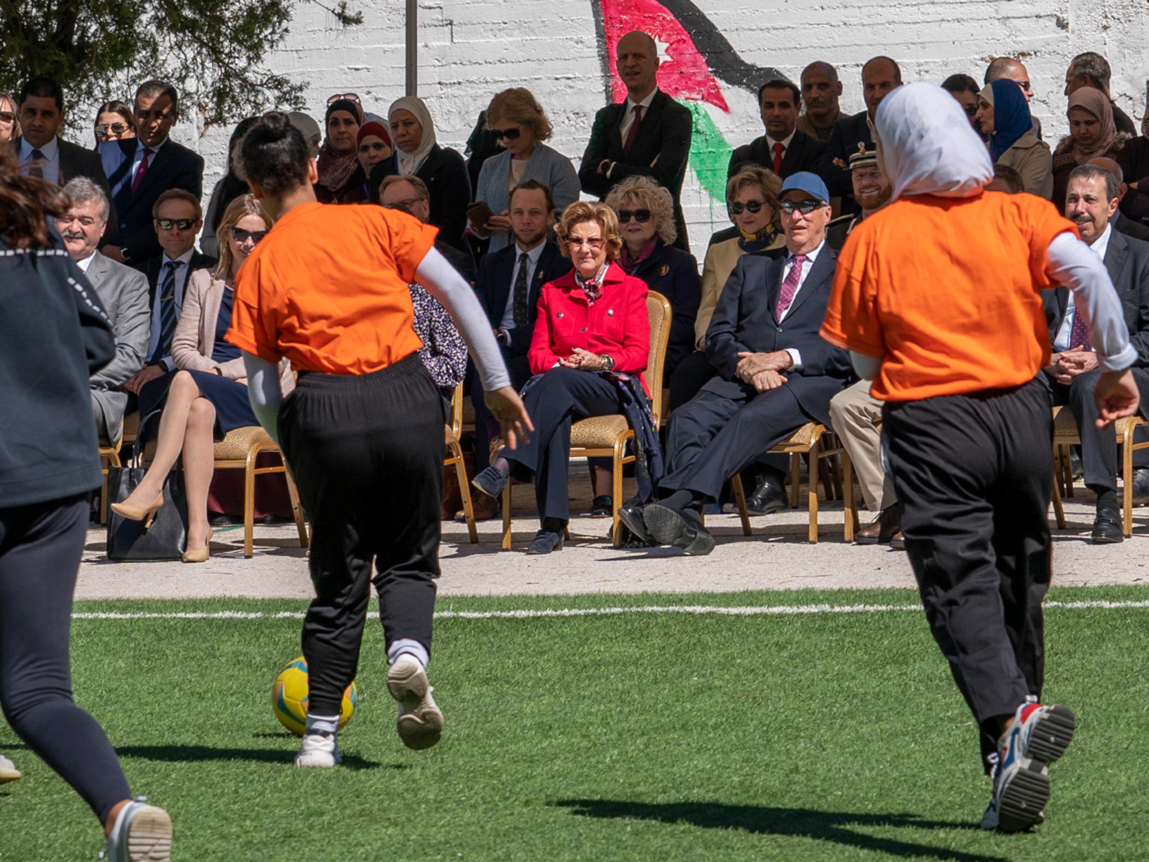 Kongeparet fikk høre om hvordan Jordan integrerer de mange syriske barna i skolen, og om samarbeidet mellom det norske og det jordanske fotballforbundet. Fotballen er både et middel til integrasjon ved at de syriske og jordanske barna spiller og leker sammen - og et middel i arbeidet for likestilling. Målet er å styrke jenter og kvinners deltakelse i samfunnet gjennom deltakelse i fotballen.
