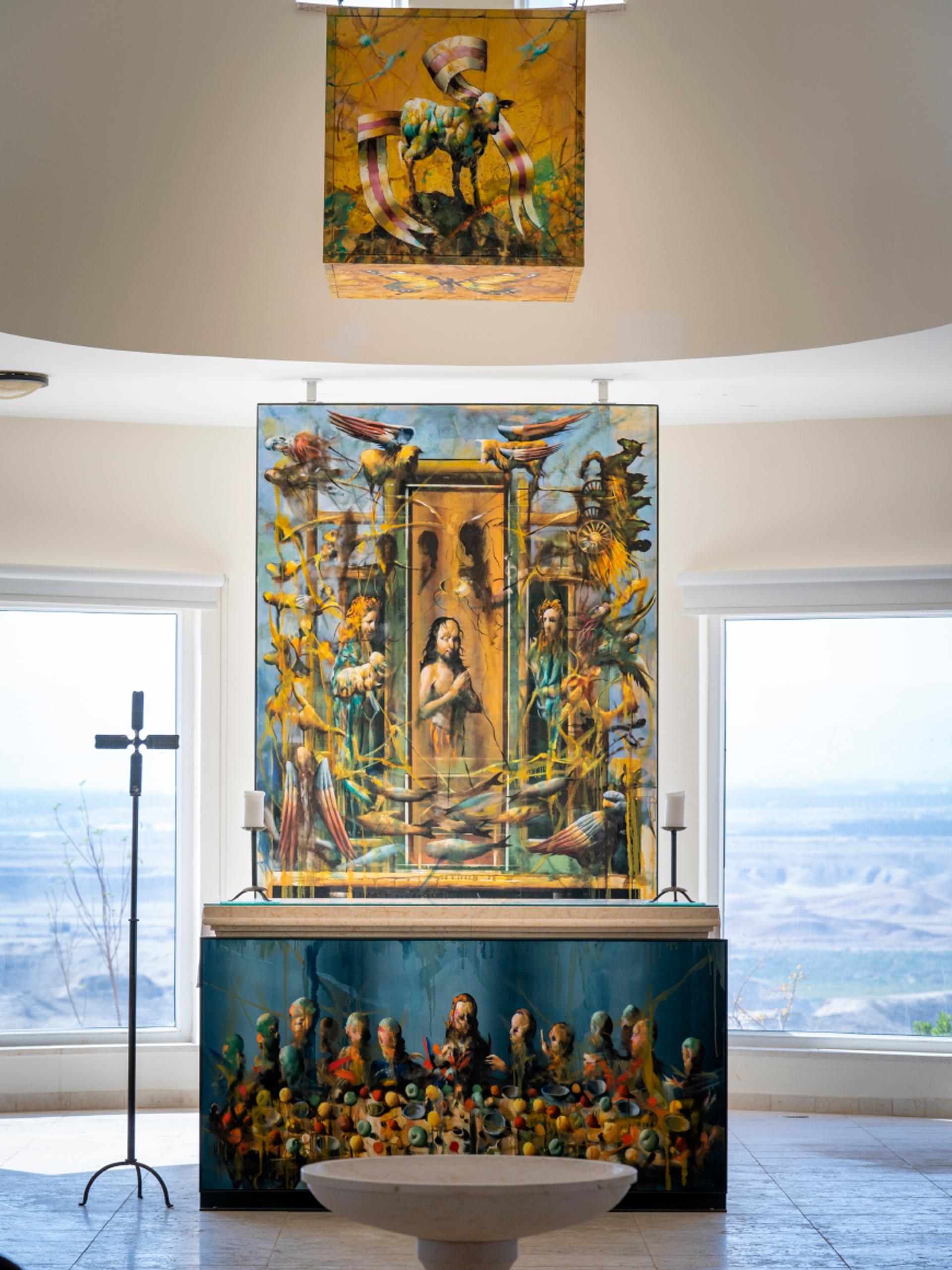 Kirken er utsmykket med ni malerier av Håkon Gullvåg, og den norske kunstneren fortalte selv om arbeidene i dag. Hovedmotivet i altertavlen er naturlig nok dåpsscenen.