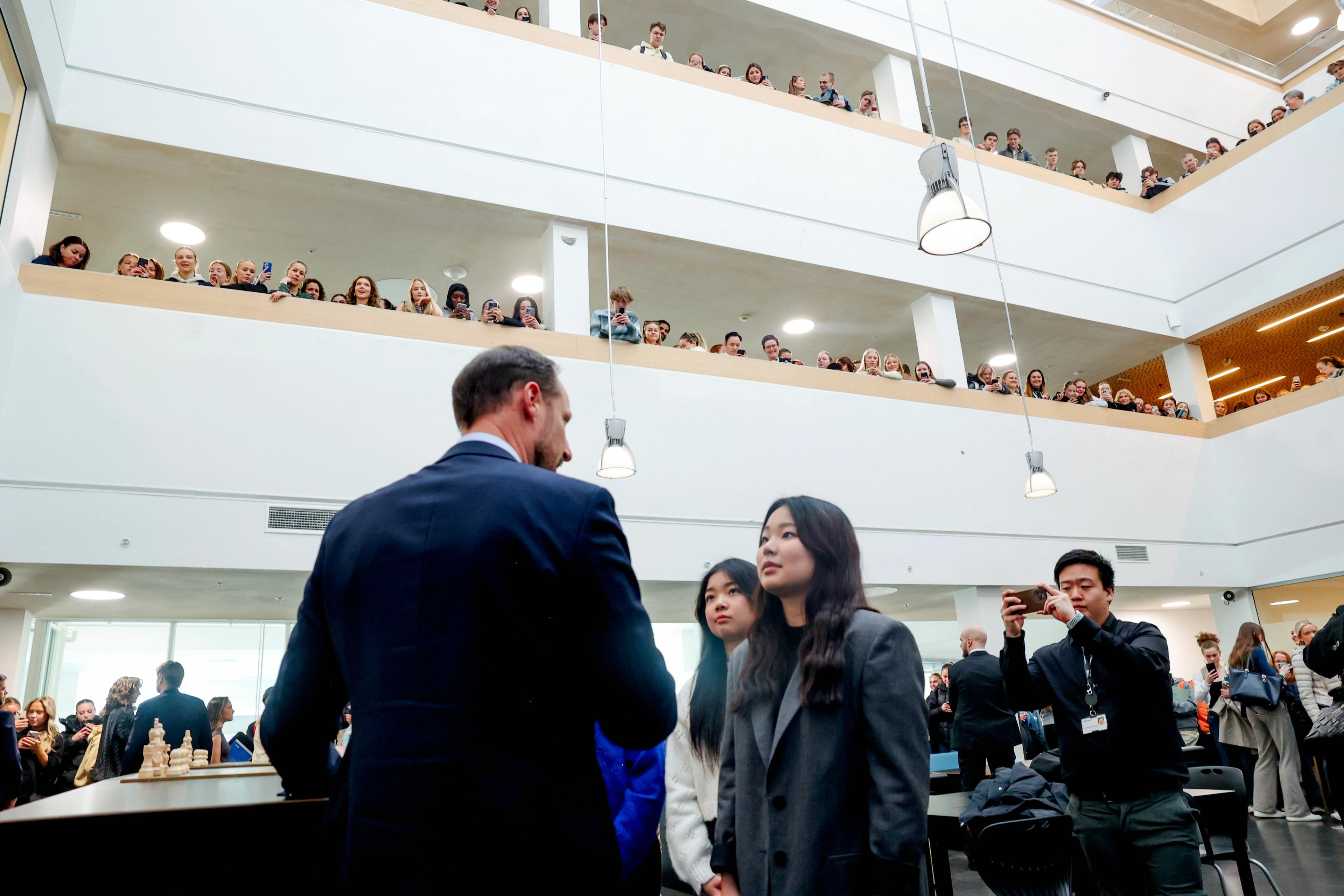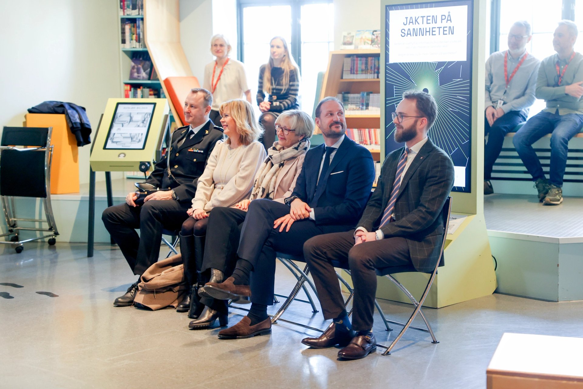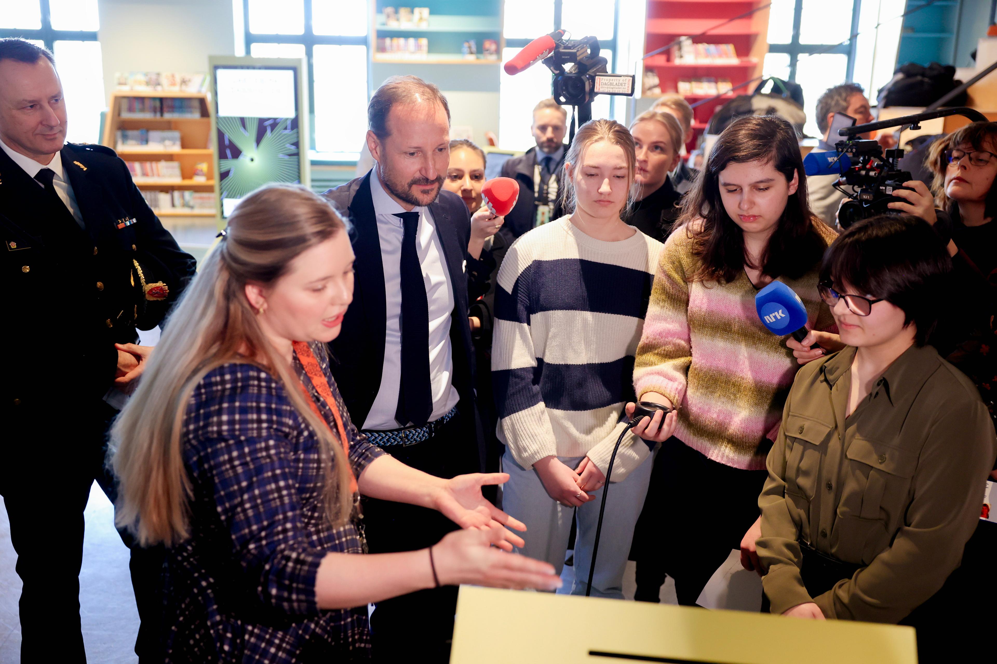 Besøket begynte på Bergen offentlige bibliotek med prosjektet "Jakten på sannheten". Sammen med elever fra Amalie Skram videregående skole løste Kronprinsregenten oppgaver som satte fokus på kildekritikk, algoritmer og KI.