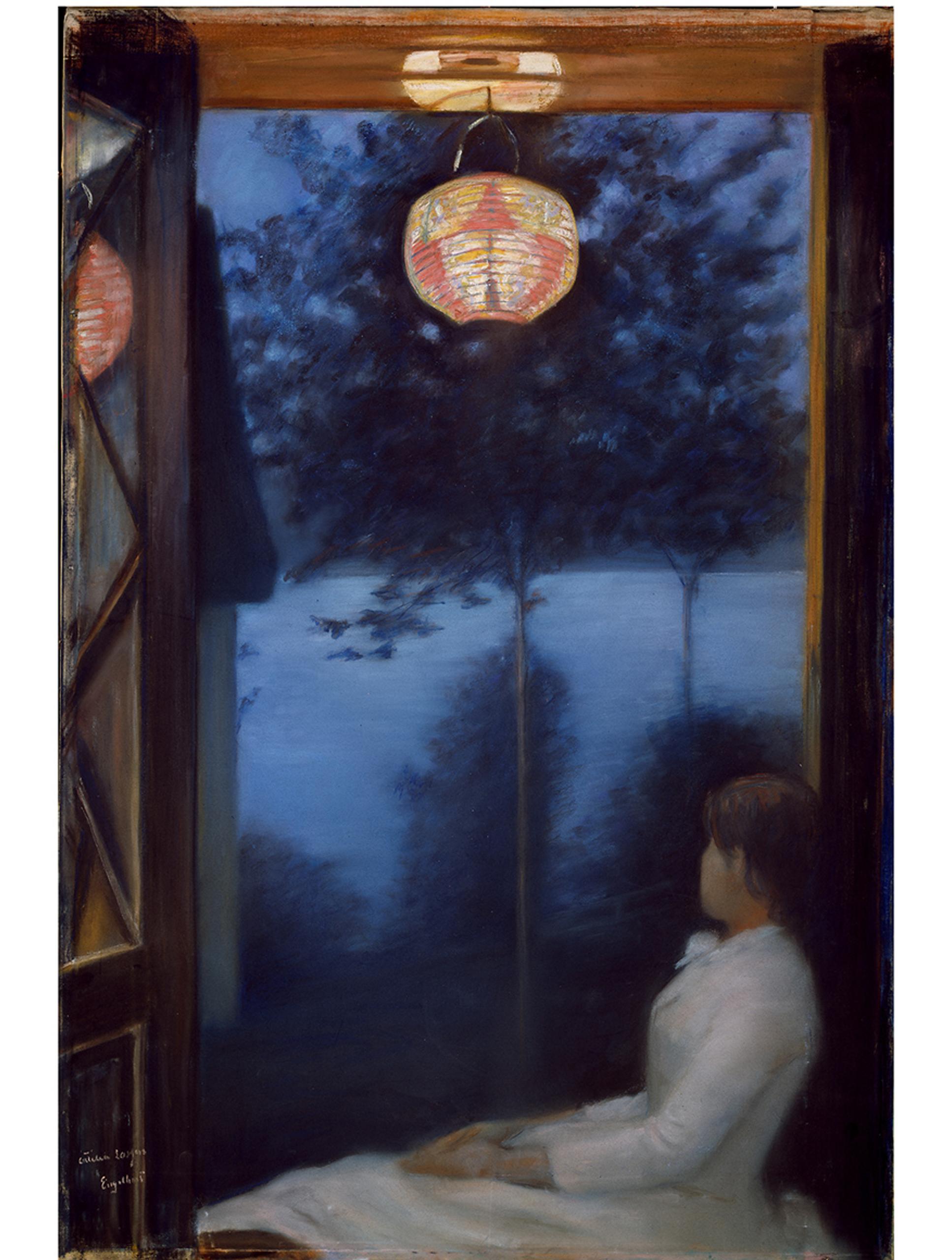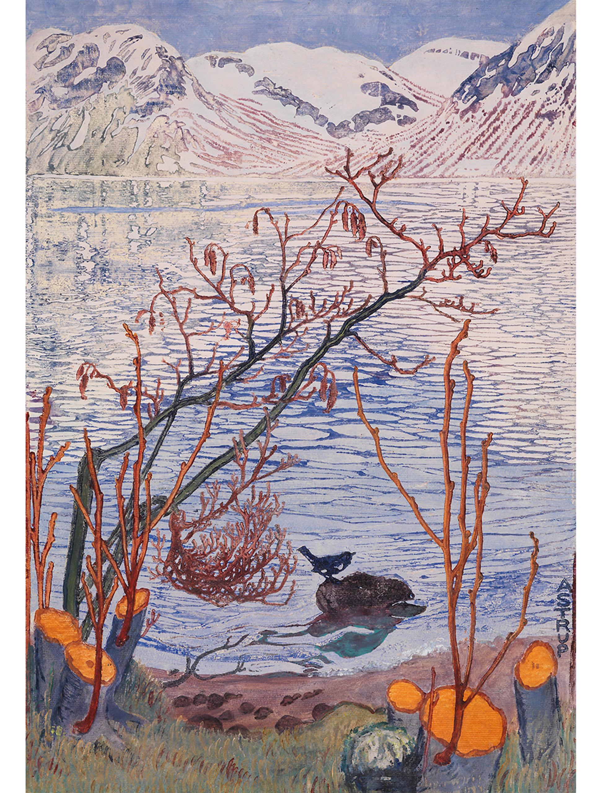 - Morsomt er det også at vi denne sommeren har anledning til å se japanismens sterke trekk i Nikolai Astrup utstillingen på Henie-Onstad kunstsenter. Dette er tydelig i hans grafikk, spesielt i hans tresnitt – som for eksempel i verket «Fugl på en sten». Her viser trær og kvister i silhuett den japanske inspirasjonen.