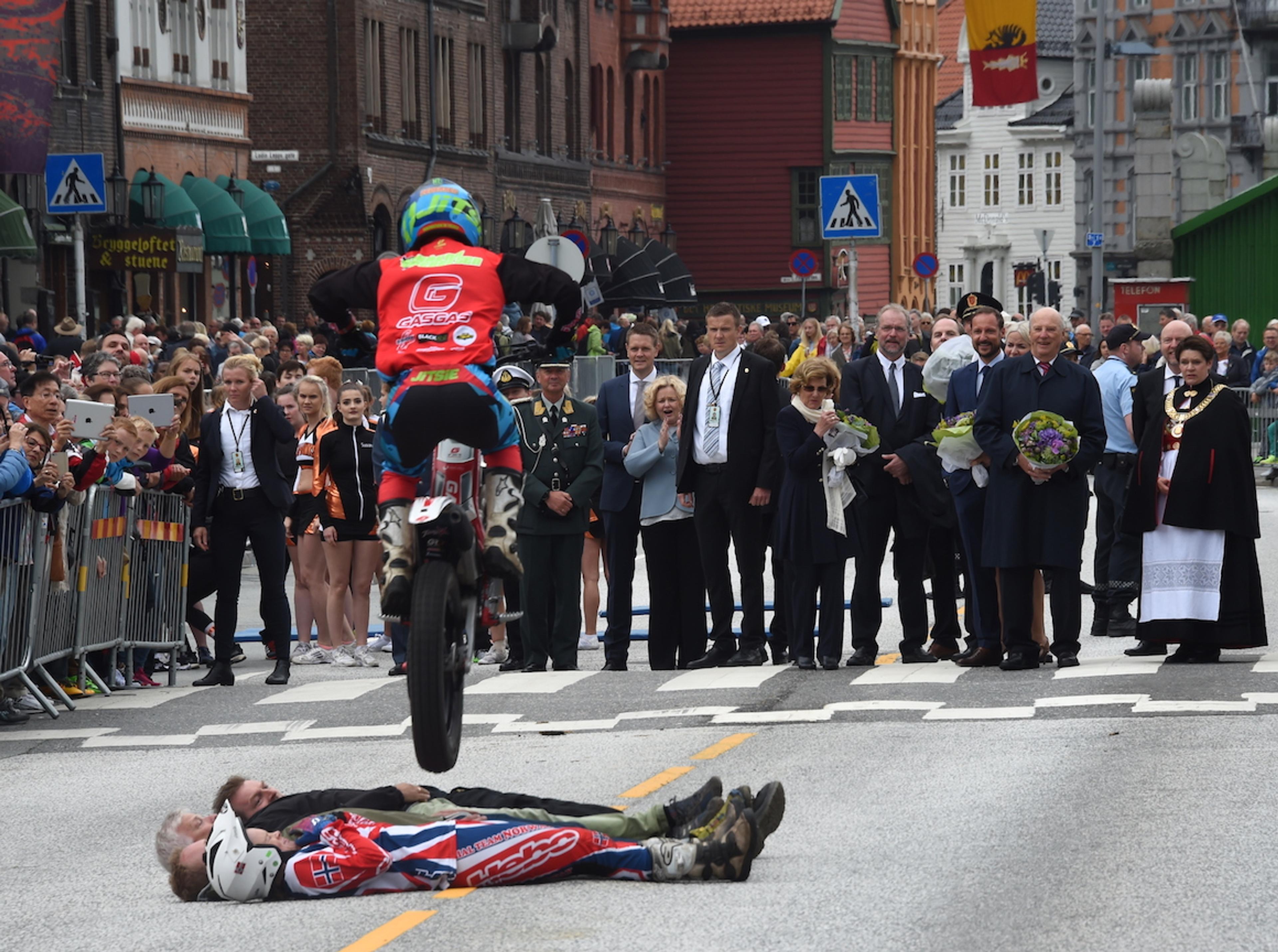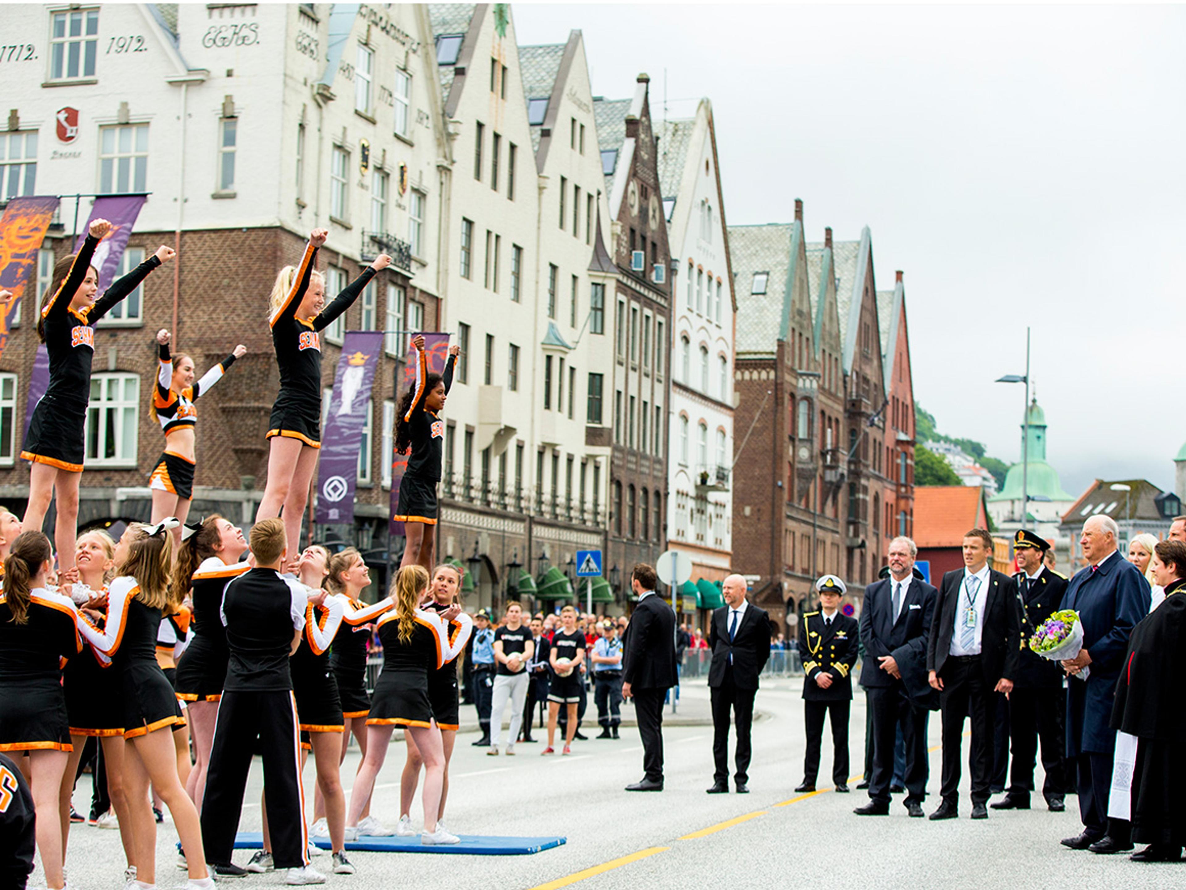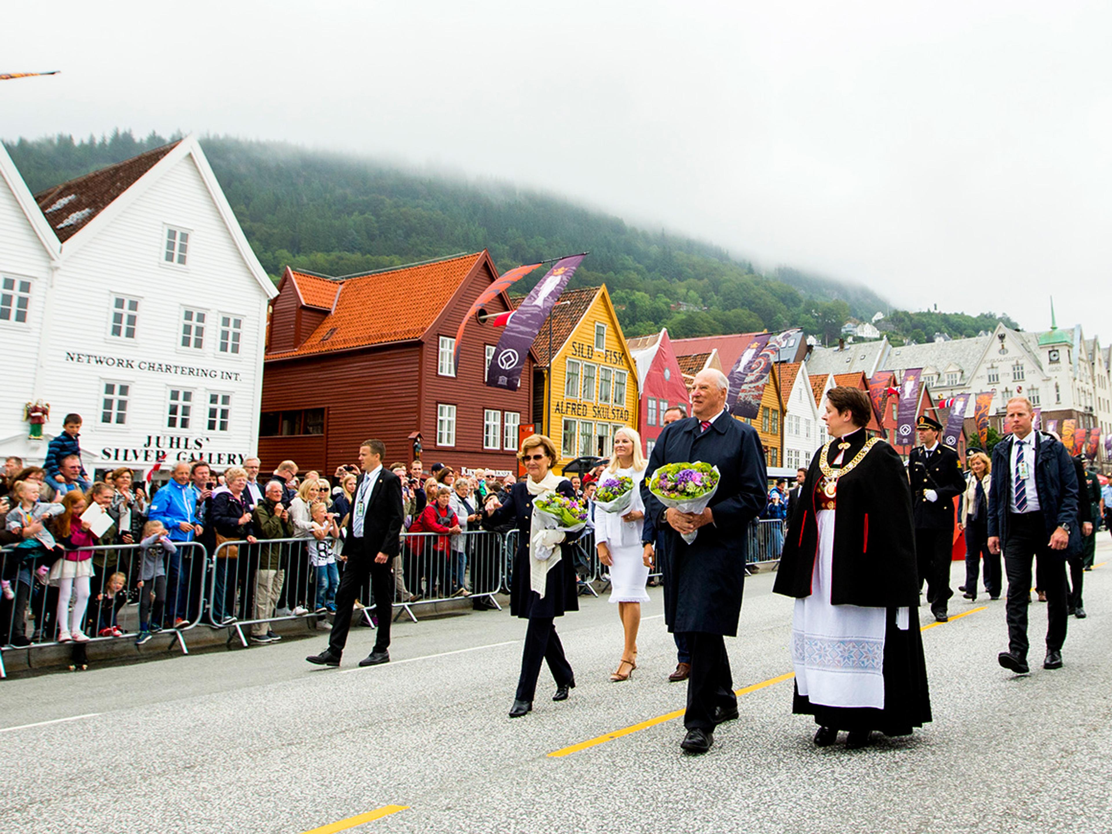 Omlag 7 000 kranset gatene langs den så velkjente Bryggen for å hilse Deres Majesteter Kongen og Dronningen og Deres Kongelige Høyheter Kronprinsen og Kronprinsessen velkommen, og det var forberedt mange opplevelser for Kongeparet og Kronprinsparet på byvandringen.