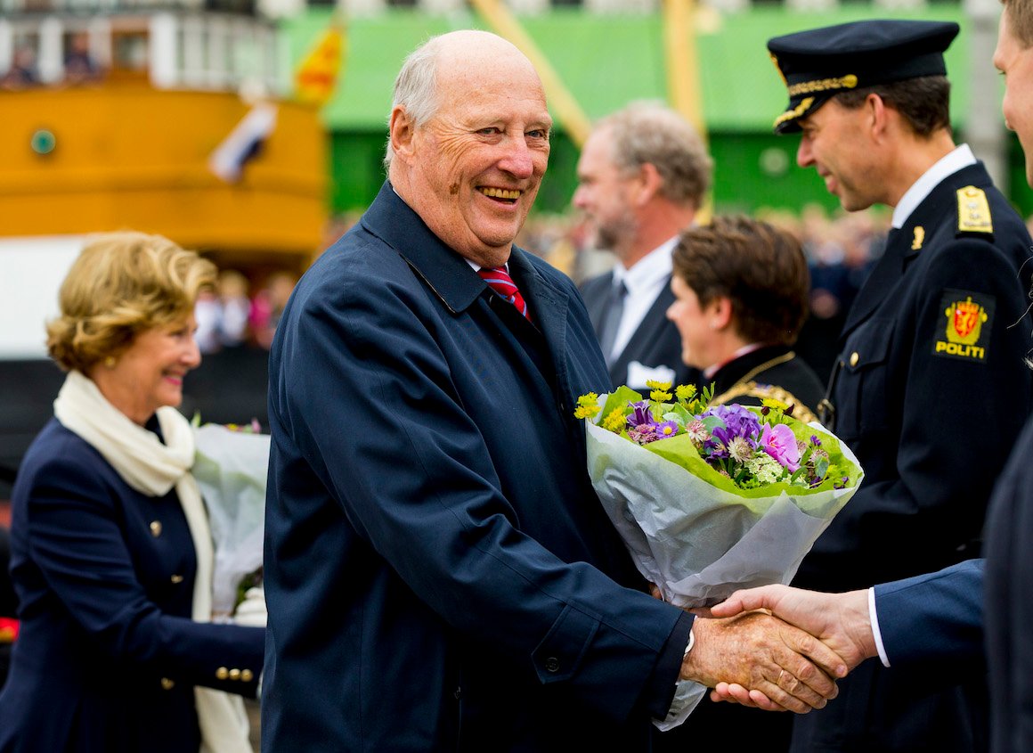 Klokken 11.00 i formiddag la Kongesjaluppen til ved Shetlandsbryggen i Bergen. Et av Bergens tradisjonsrike buekorps trommet Kongefamilien i land.