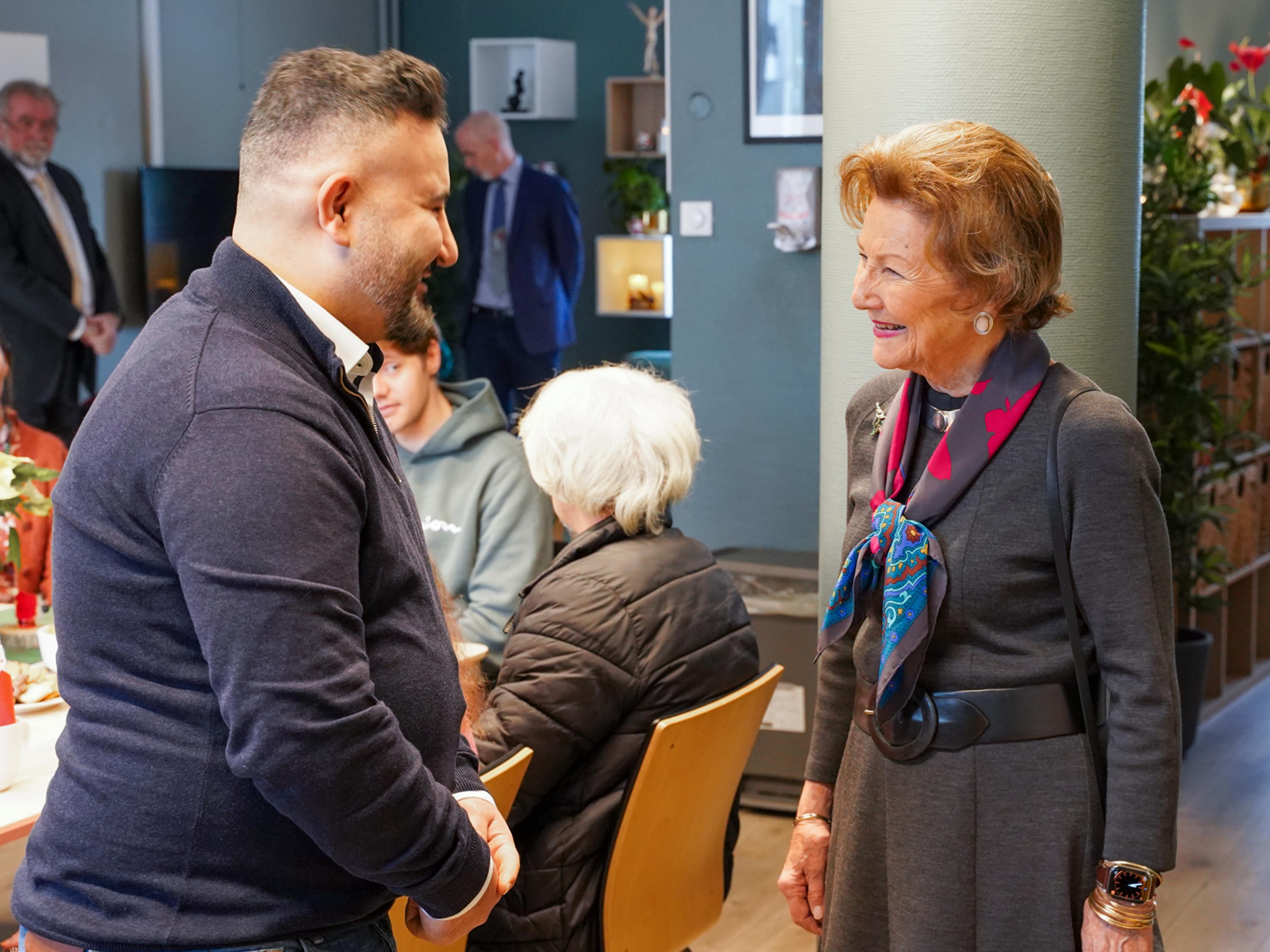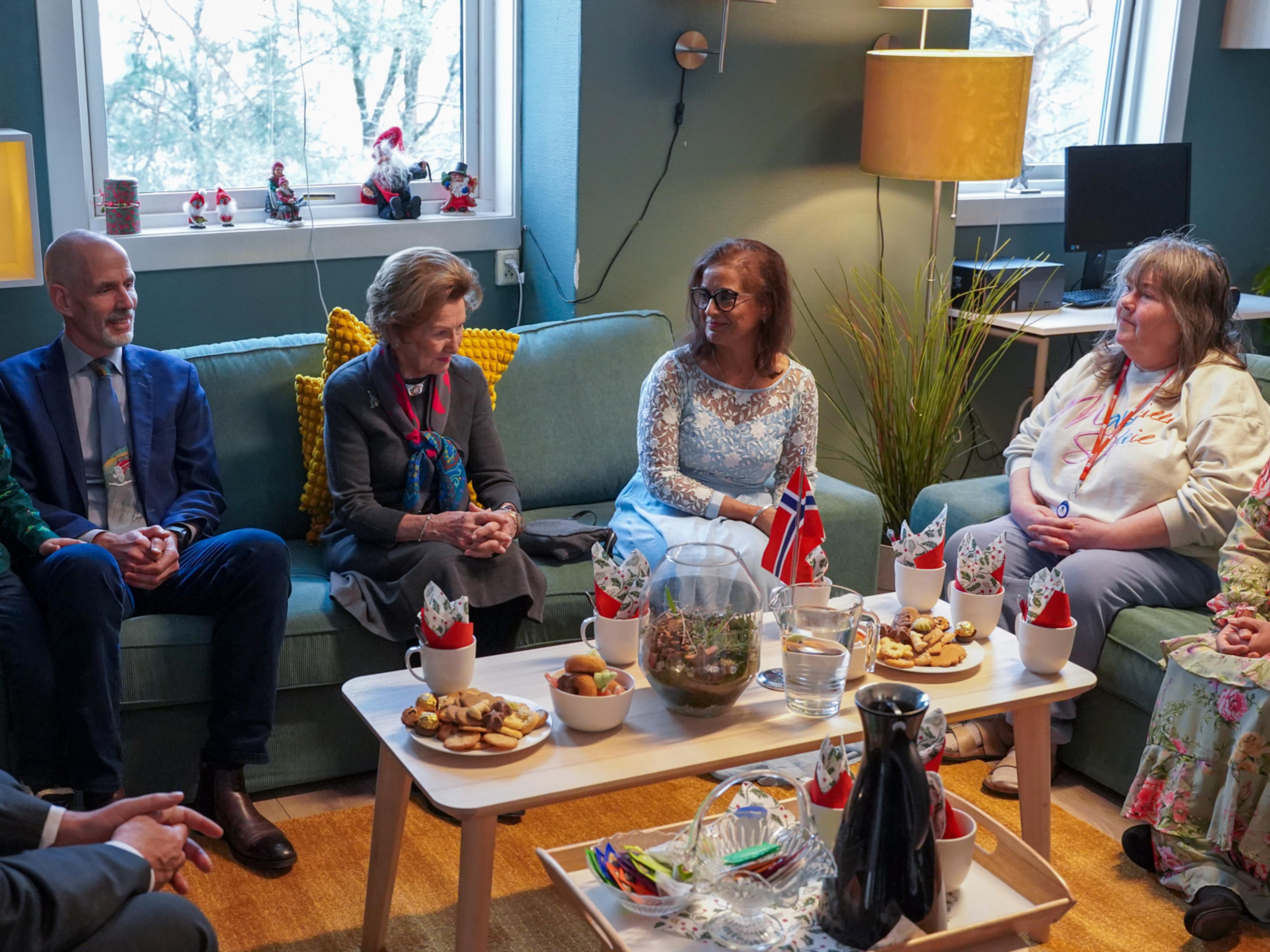 Dronning Sonja møtte tilsette og menneske som er glad for aktivitetane som huset tilbyr. Tilbodet inkluderer hobbyverkstad, matkurs, treningsrom, strikkeklubb, sal av klede, fellesmåltid og ulike utflukter. Aktivitetshuset har òg opna ein populær gjenbruksstasjon med gratis klede, sko og anna småtteri, som er open for alle.