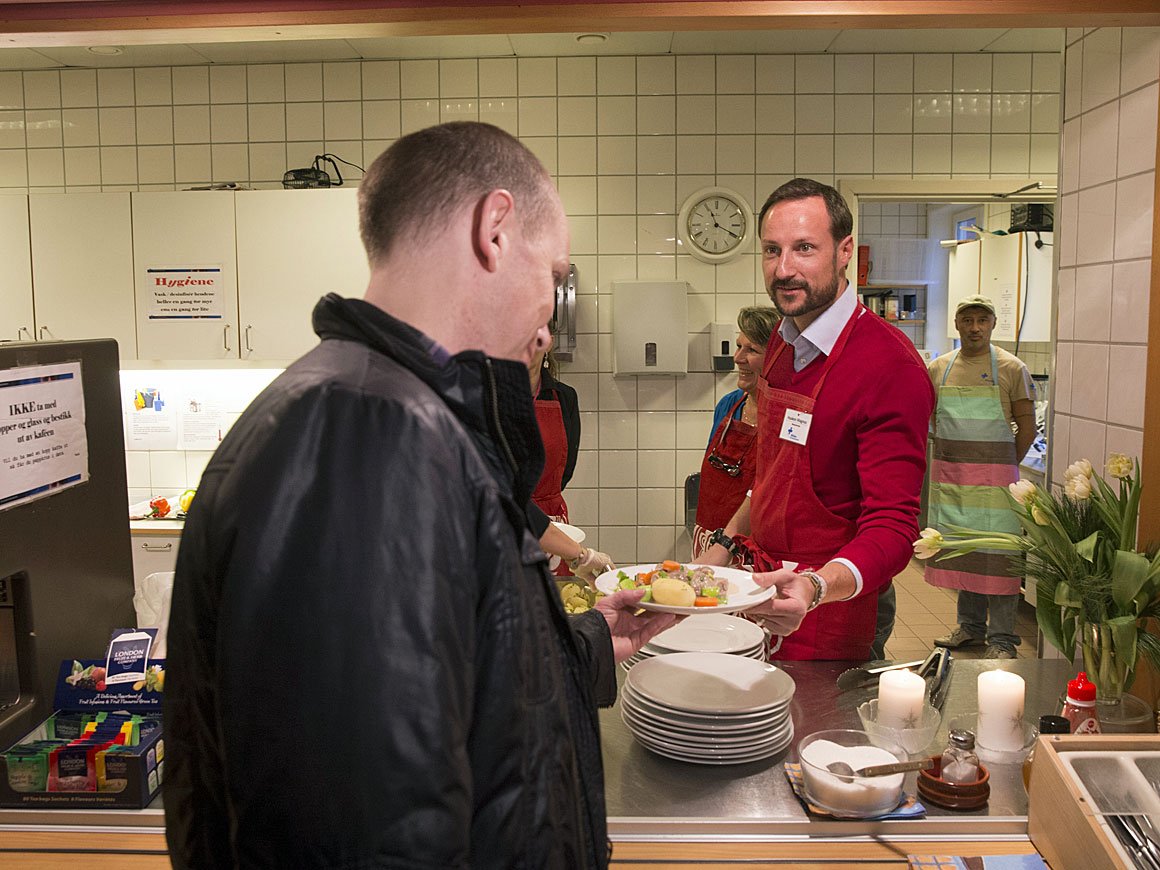 Deres Kongelige Høyheter Kronprinsen og Kronprinsessen deltok som frivillige og bidro til matlaging og servering ved Blå Kors Kontaktsenter i Oslo sentrum i dag. Senteret er et lavterskeltilbud for personer med rusproblemer.