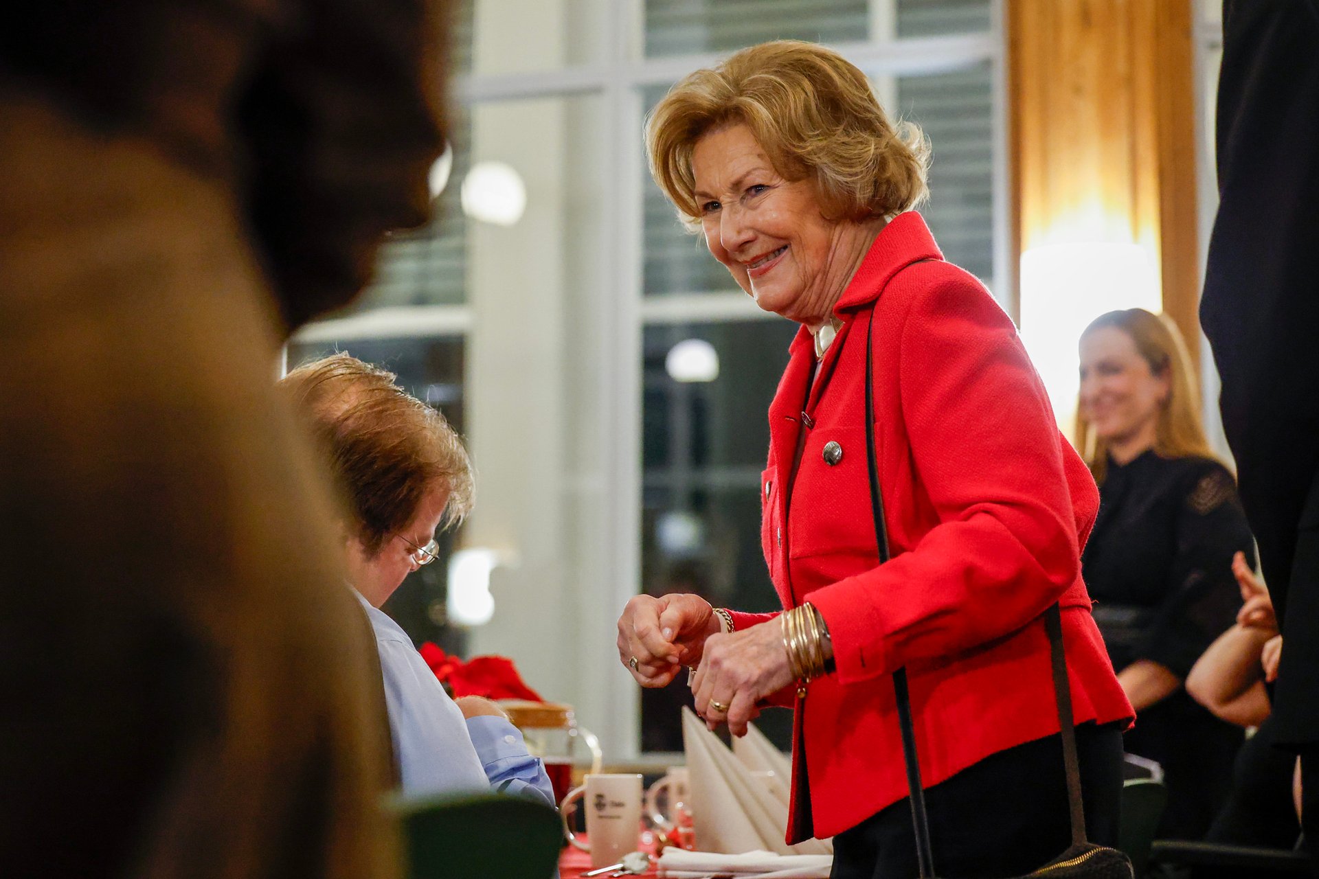 Dronningen møtte mange av beboerne under besøket, og deltok på grøtfest i byggets festsal. Under grøtfesten stod beboerne for flere kulturelle innslag med både dans og musikk.